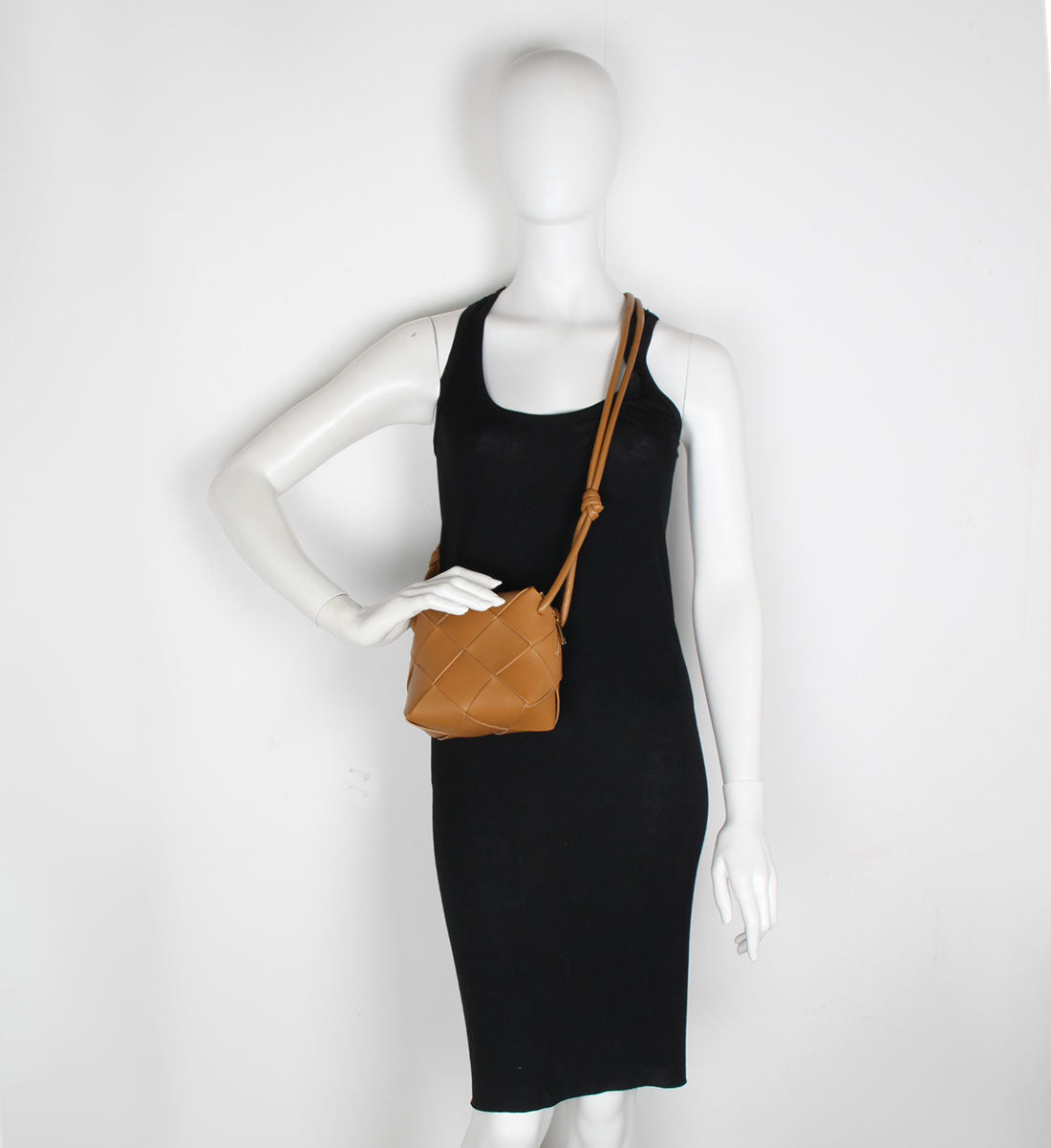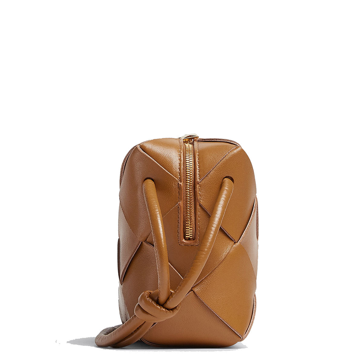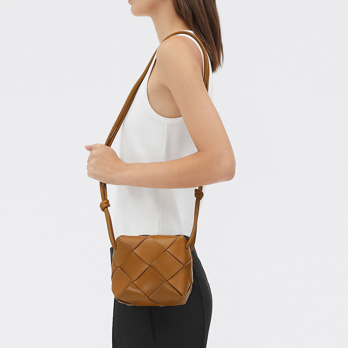 Bottega Veneta's signature Loop Mini bag is now available in their cassette weave. This crossbody bag has a soft edge boxy shape crafted from lamb leather and features double knotted side details on the strap, zip top closure and bonded lambskin lining.