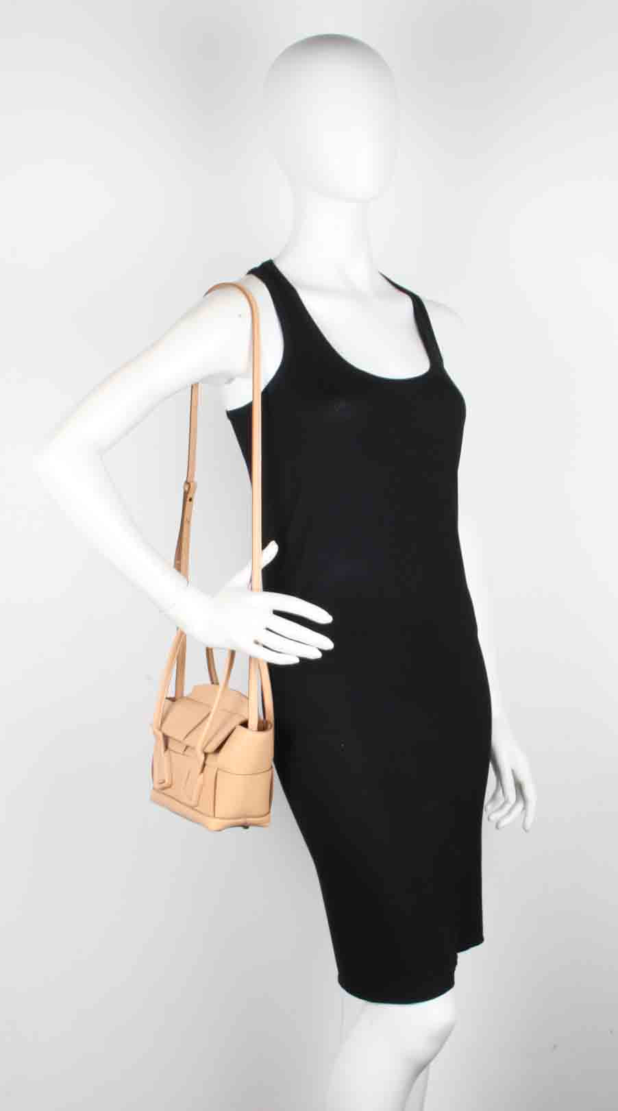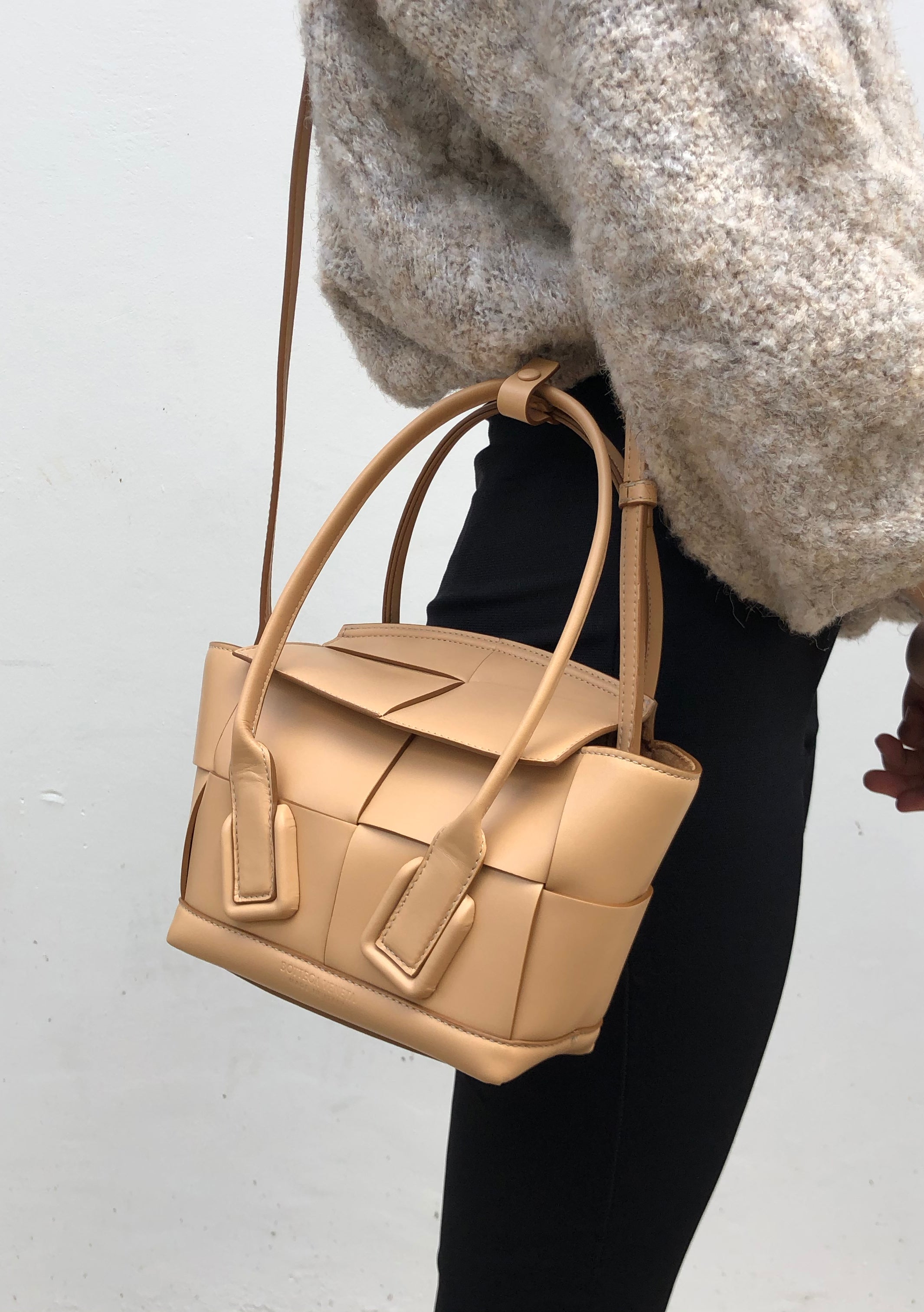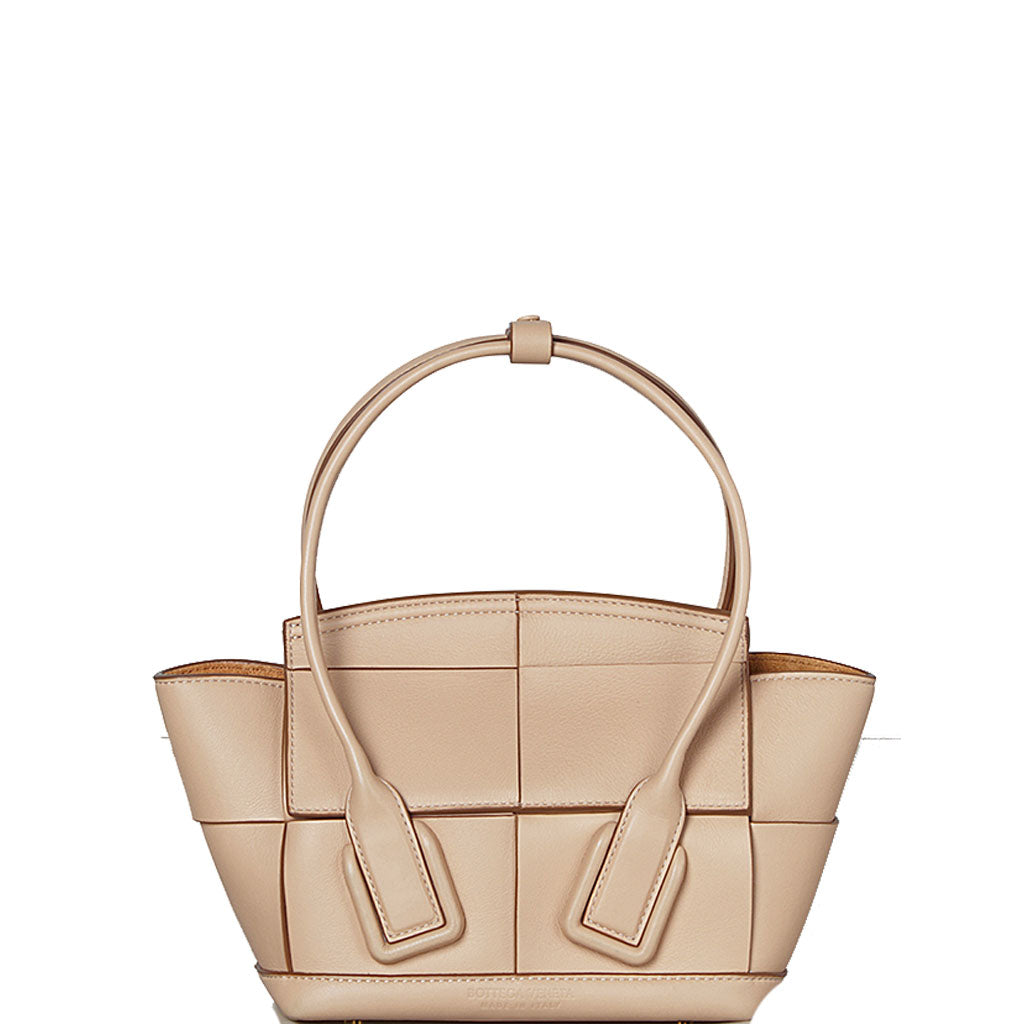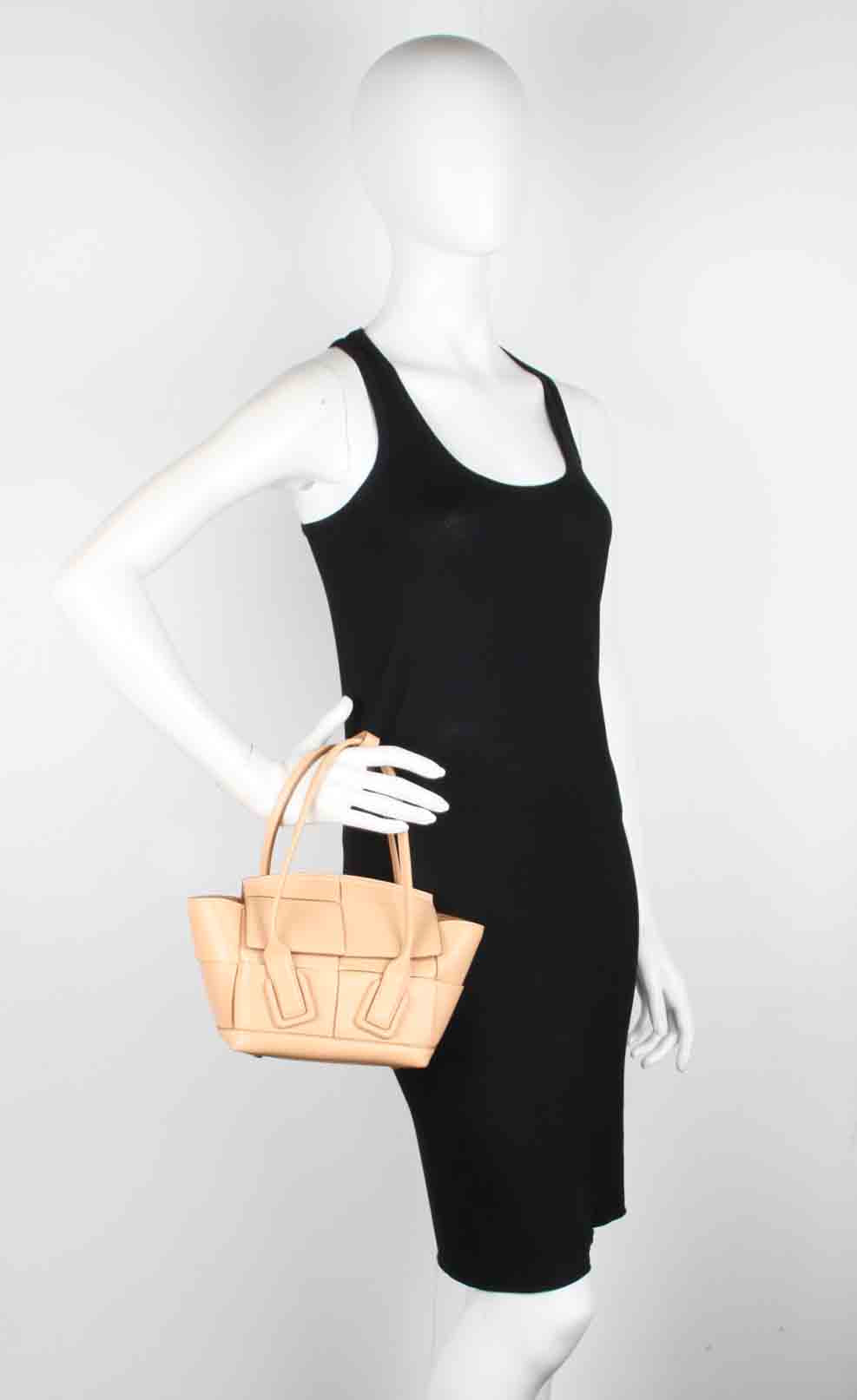 Bottega Veneta Mini Arco. Top-handle mini bag in an orthogonal maxi weave. Made from French Calf with a natural finish. Arc-shaped top panel with curved handles. Rolled leather handles secured with a snap-button leather loop. Finished with a fine contrast saddle stitch. Bonded suede interior with one zipped pocket and two open pockets.