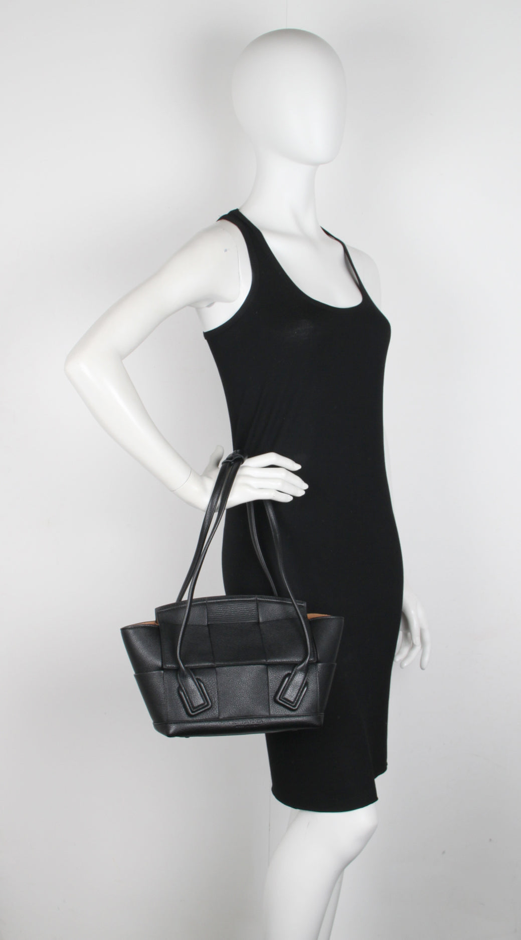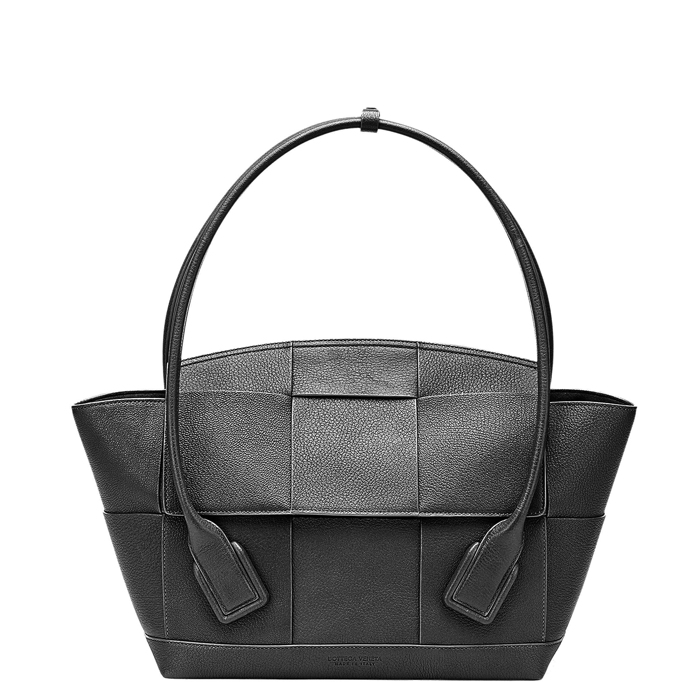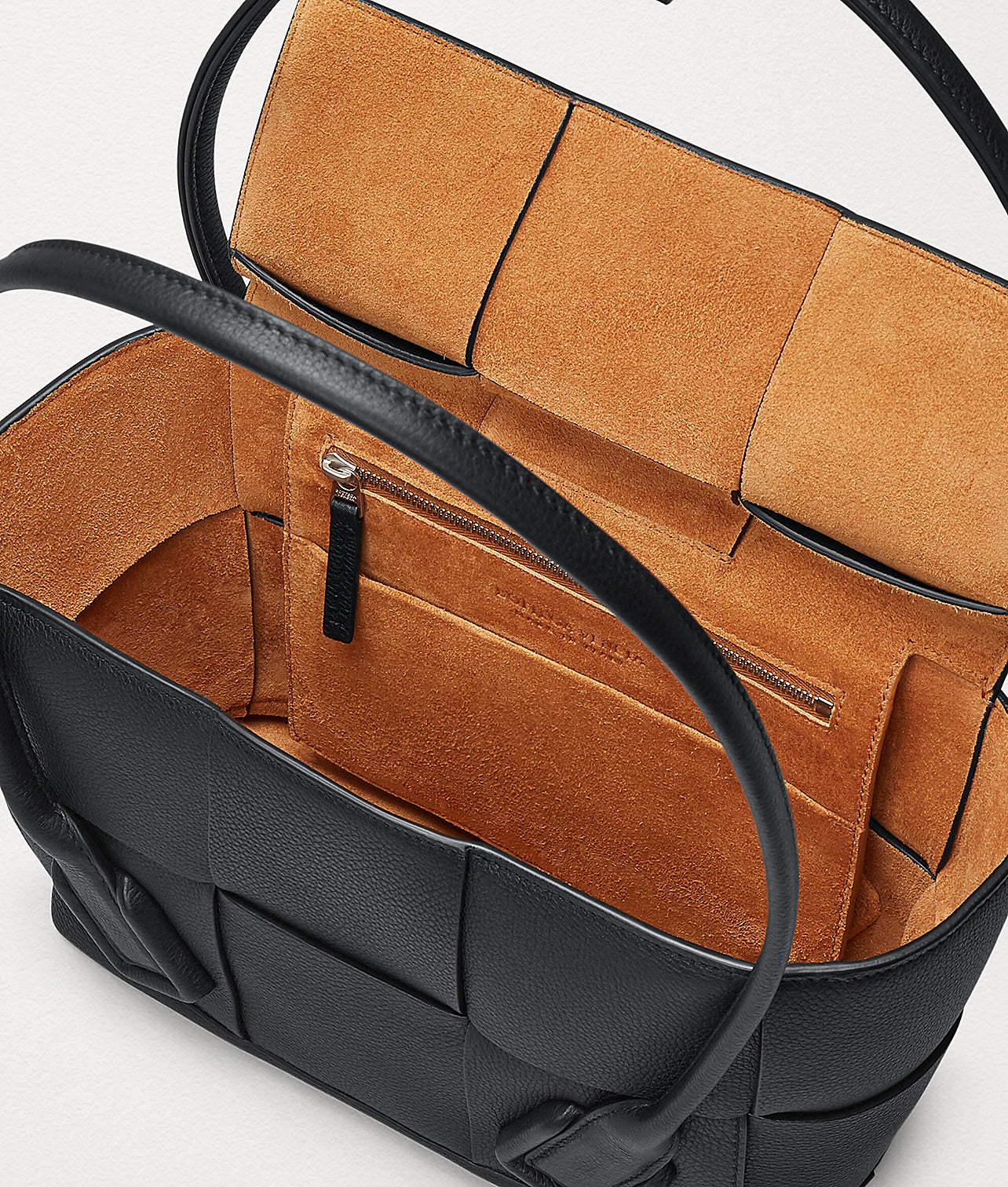 Top-handle small bag in an orthogonal maxi weave. Made from leather with a natural finish. Arc-shaped top panel with curved handles. Rolled leather handles secured with a snap-button leather loop. Finished with a fine contrast saddle stitch. Bonded suede interior with one zipped pocket and two open pockets.