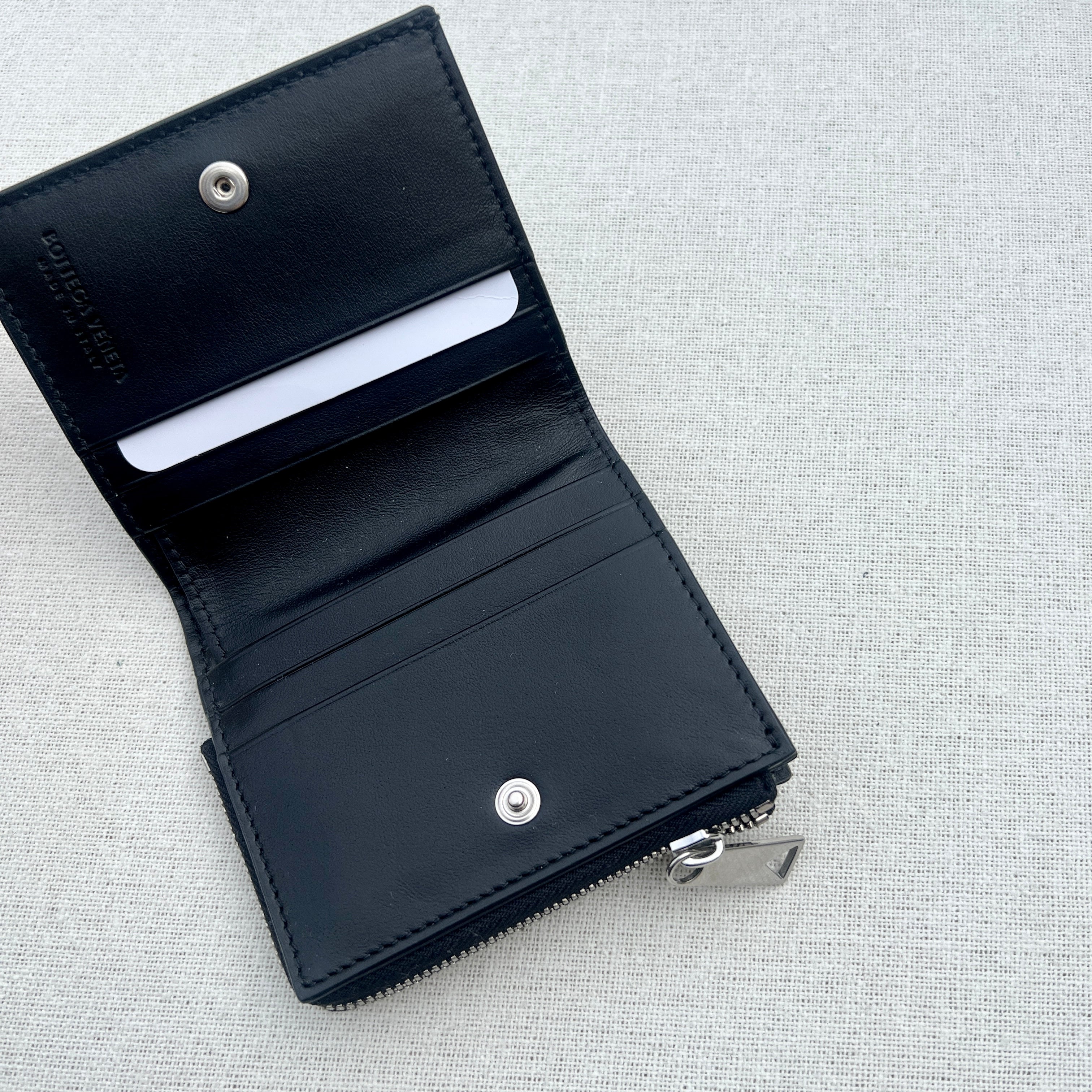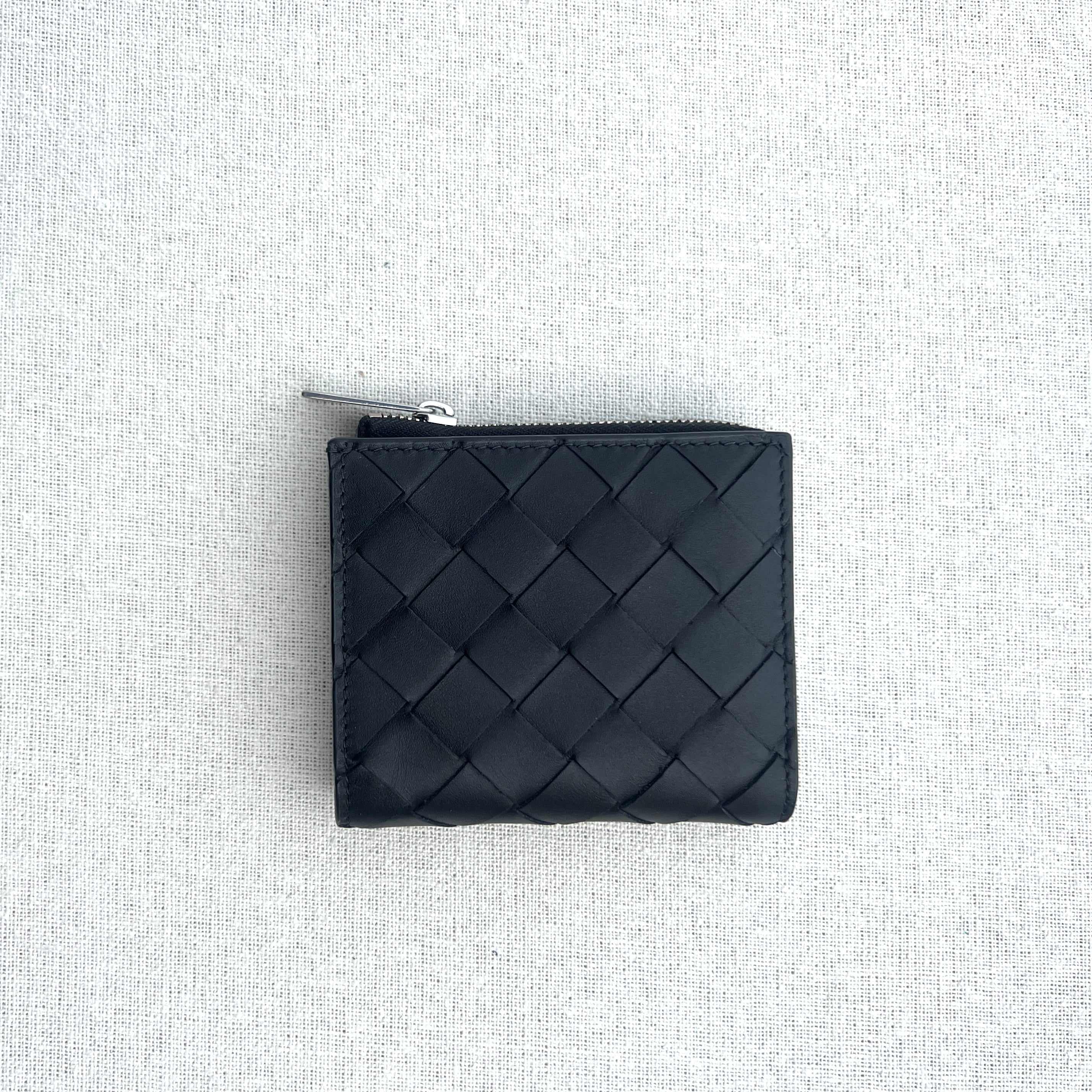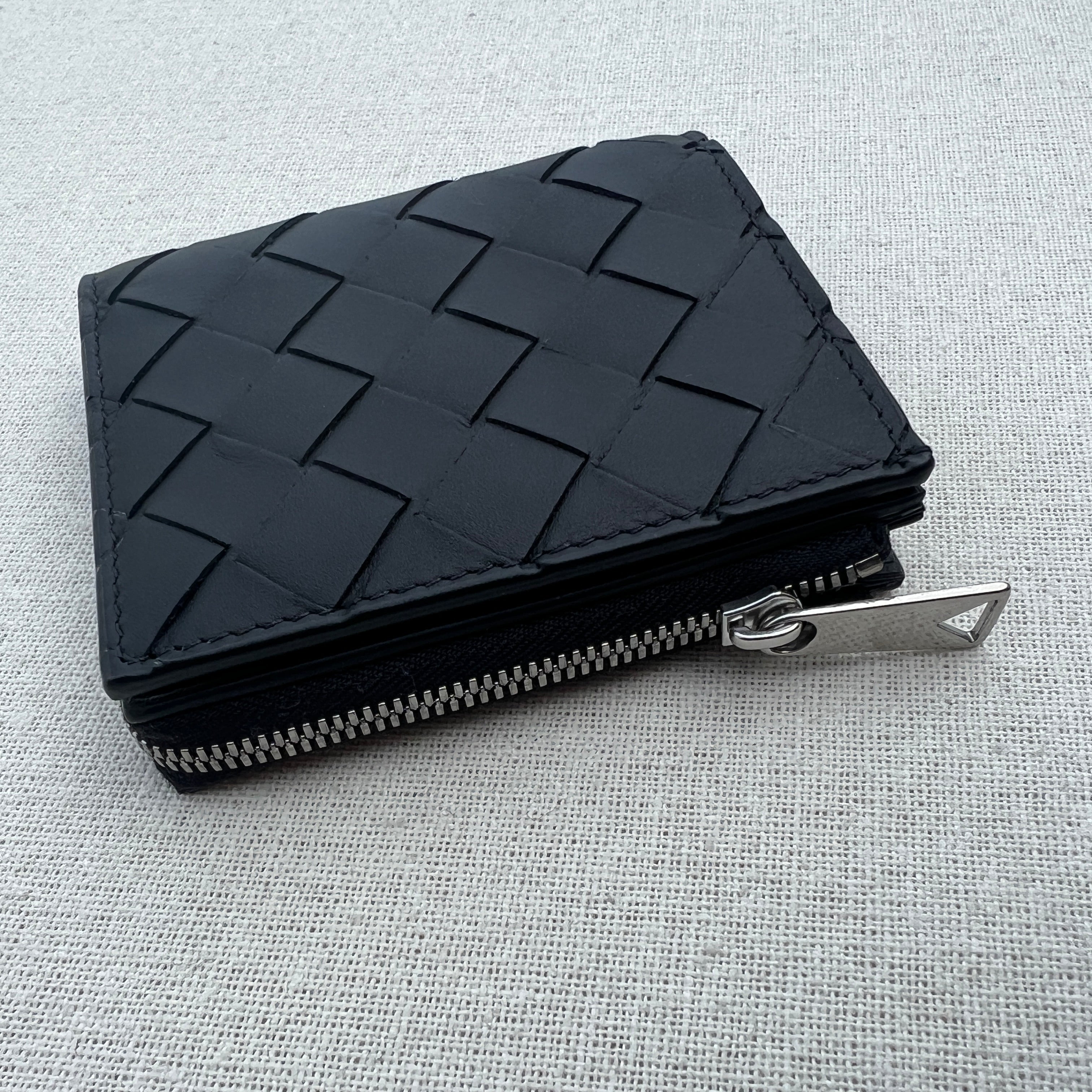 Bottega Veneta Intrecciato leather wallet. Features four card slots, one note compartment, 2 additional pockets, one coin purse with a zip closure.