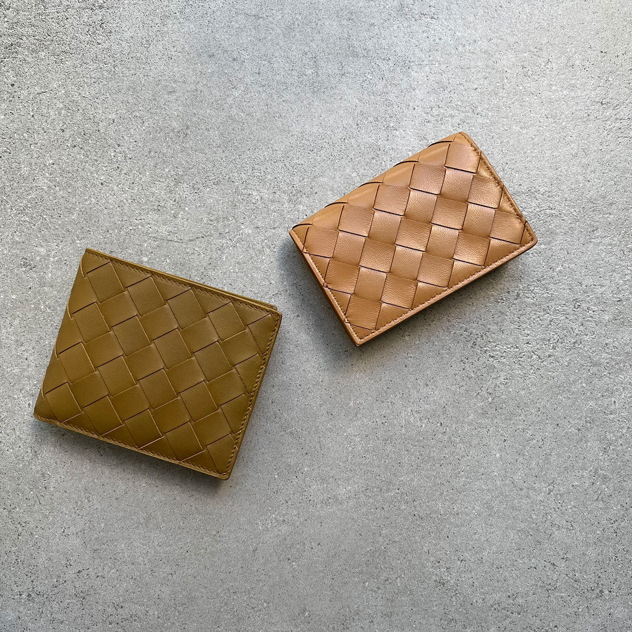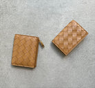 Bi-fold card case in woven nappa. Features one main compartment for cards and two card slots one external pocket and smooth calf interior. Press stud closure.