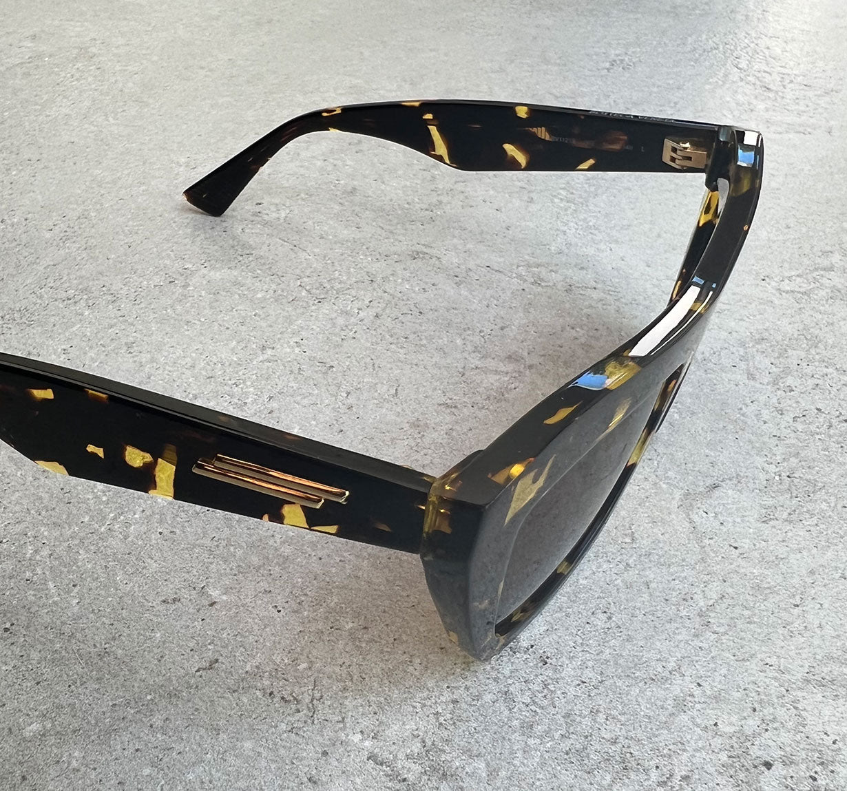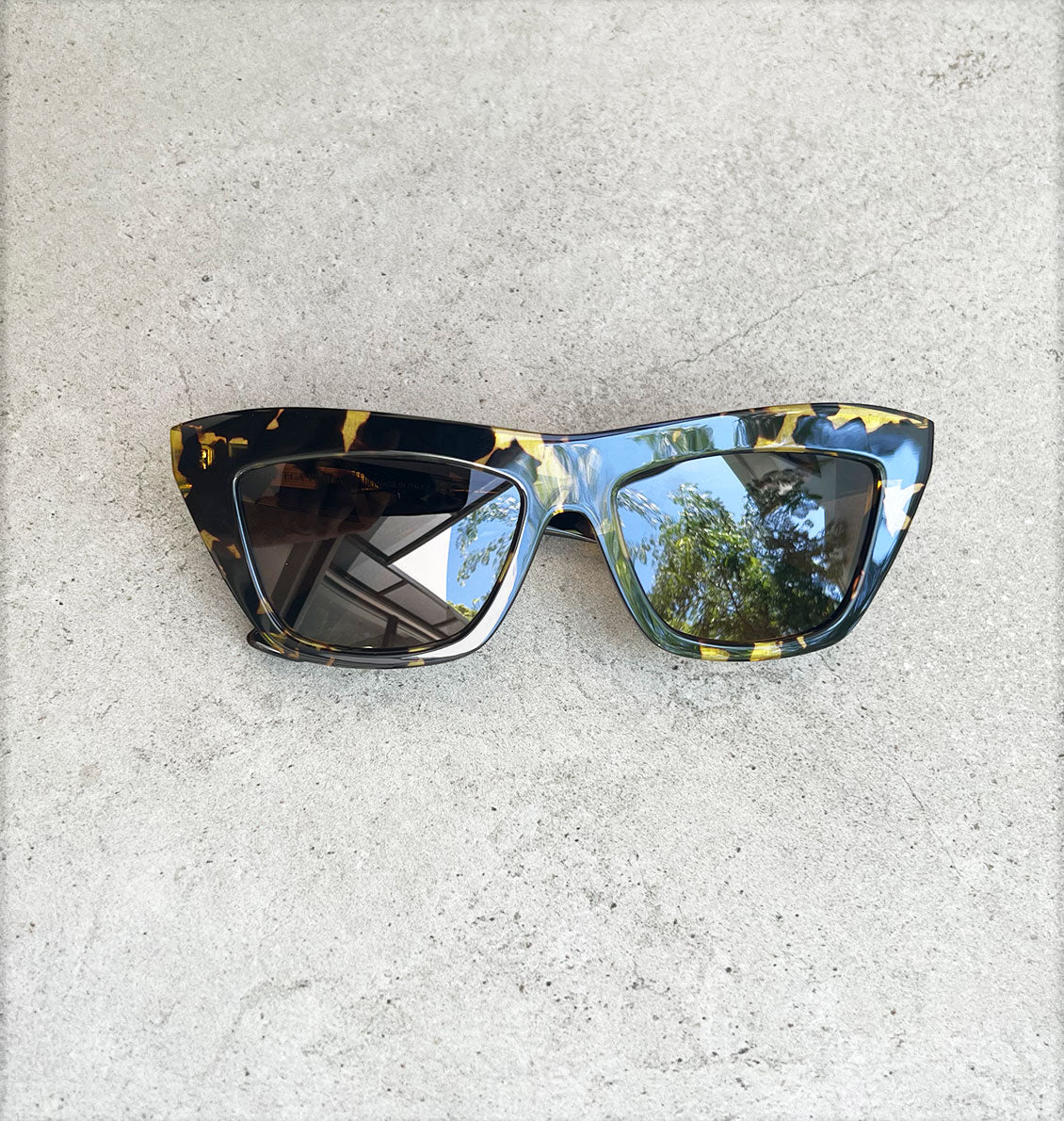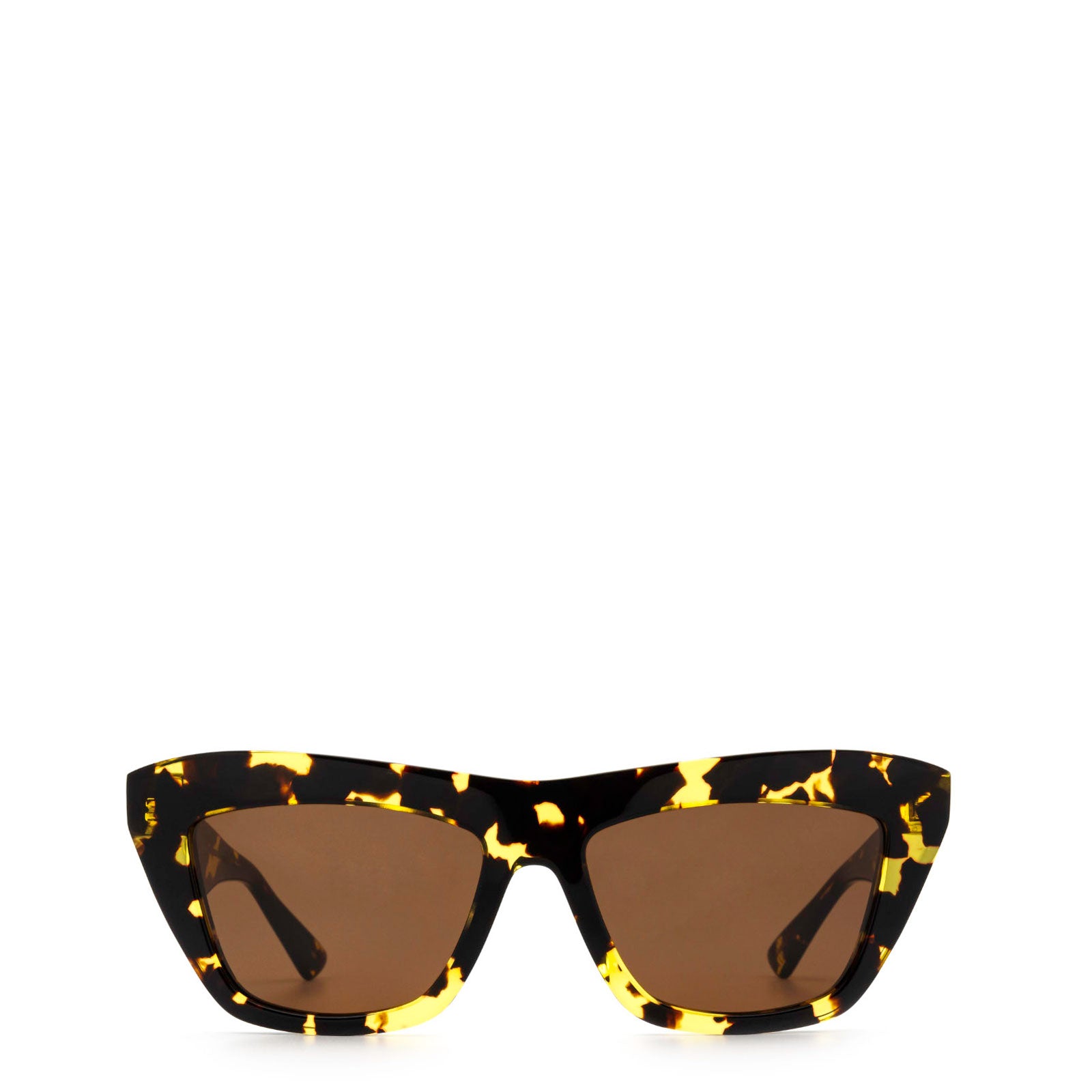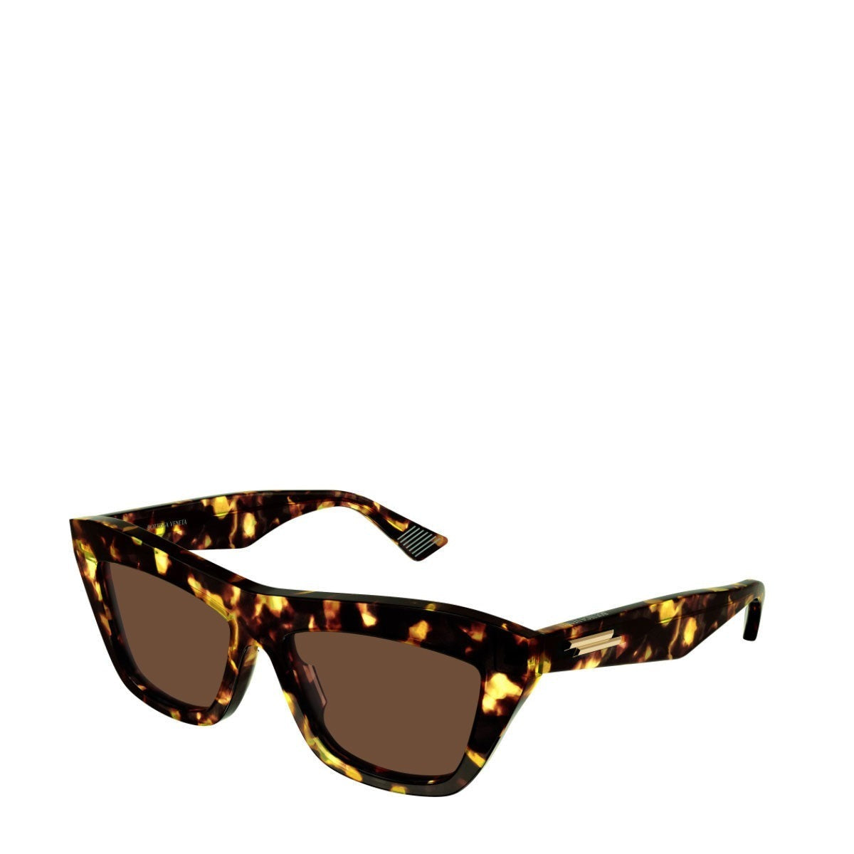 A chic, cat-eye frame style from Bottega Veneta. Crafted in the brand's signature luminous Havana acetate, this frame is detailed with gold-tone hardware, an embossed logo on the arm. Featuring thick acetate rims with a subtly angled front, this frame balances wide arms with a narrow bridge for a flattering fit.