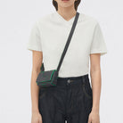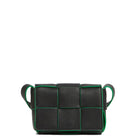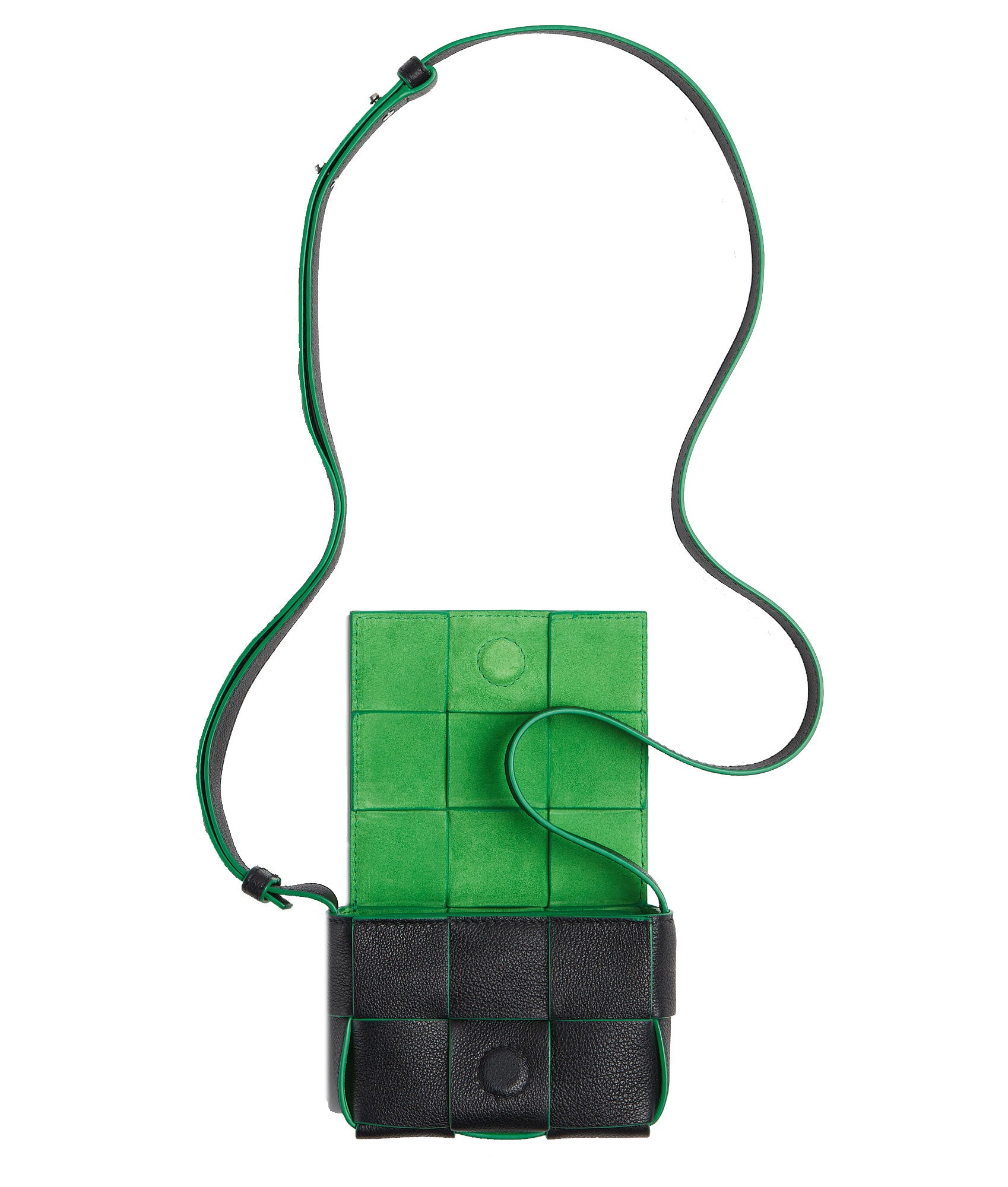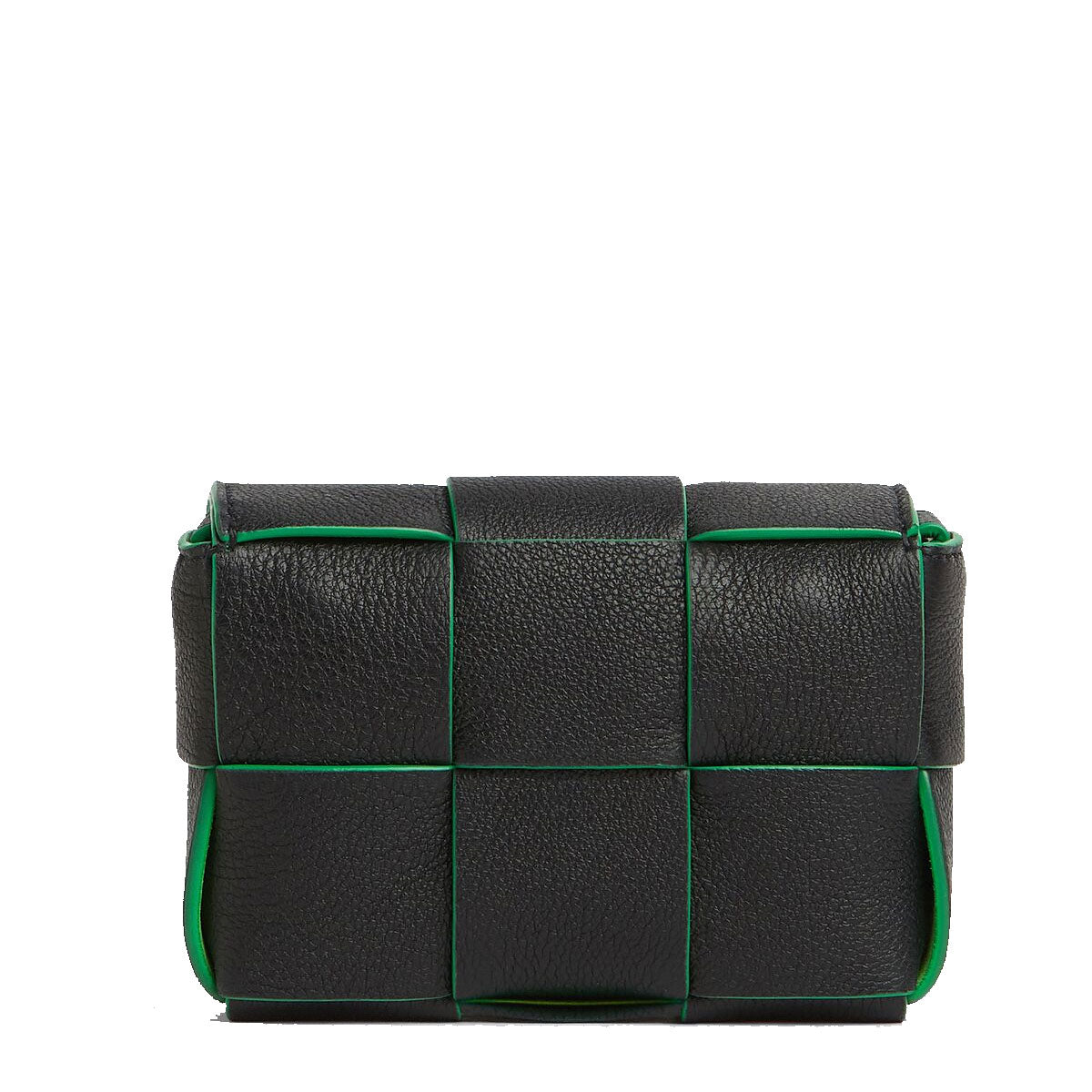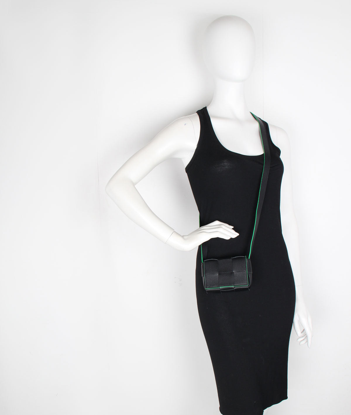 Mini Crossbody bag in a double-face maxi weave from the Men's collection featuring a contrasting trim. Made with wide double-face nappa strips in an orthogonal weave. Interior is identical to exterior; fitted with an interior card pocket and magnetic closure. Slim, adjustable shoulder strap with gold tone hardware.