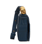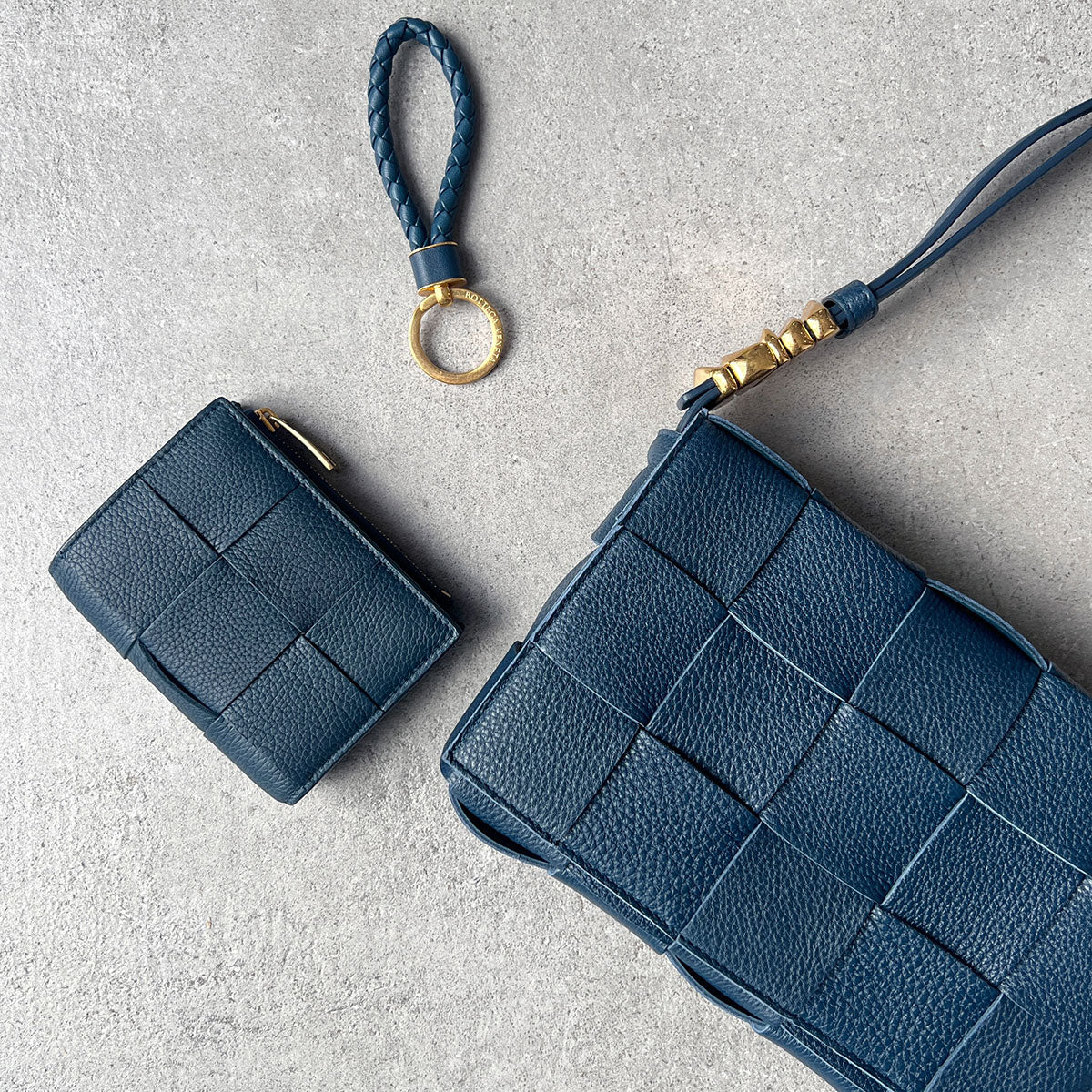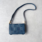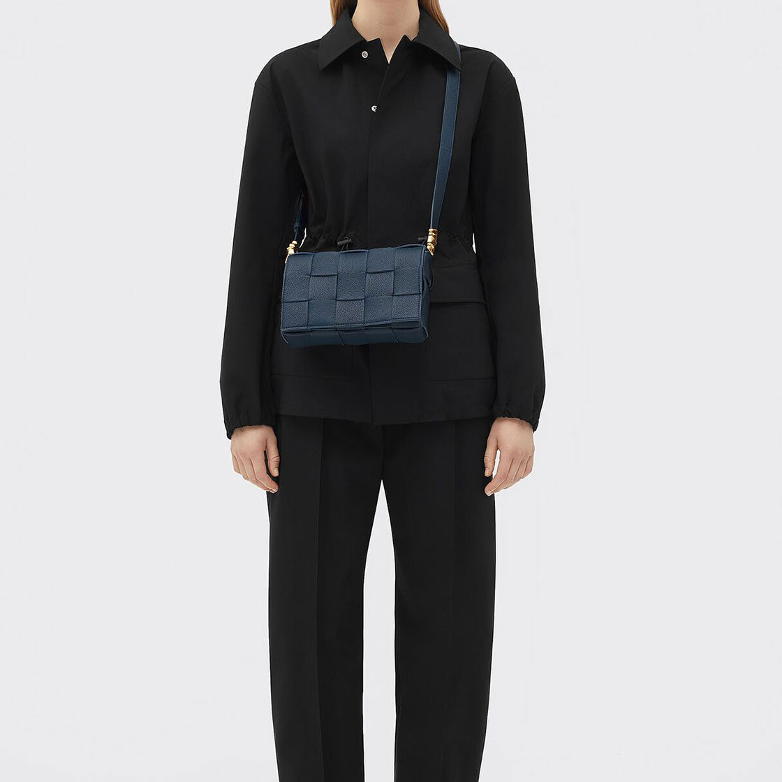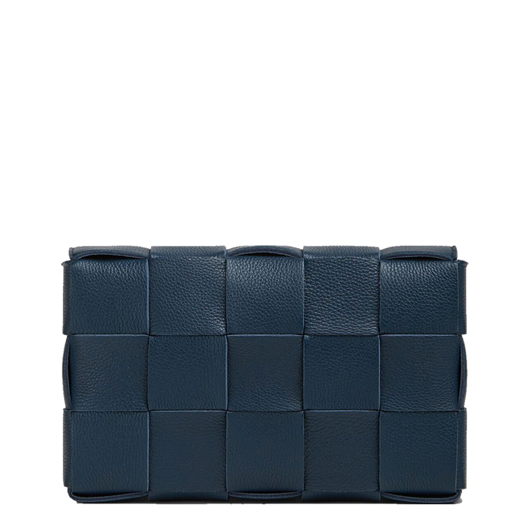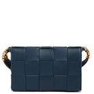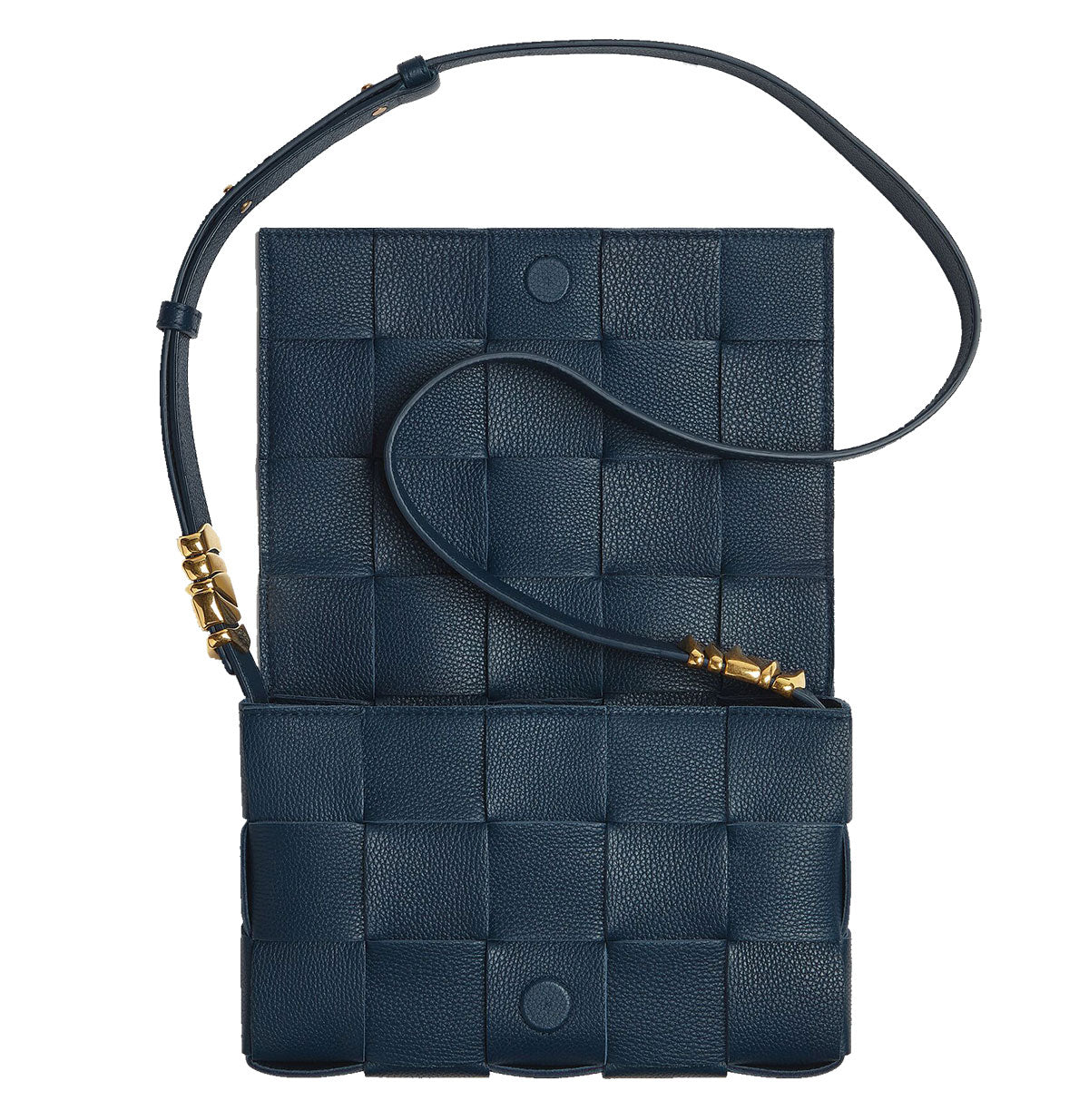 Crossbody bag in a double-face maxi weave with opulent gold hardware on shoulder strap. Made with wide double-face nappa strips in an orthogonal weave. Interior is identical to exterior; fitted with a zipped pocket and magnetic closure. Strap folds inside bag to carry as a clutch. Slim, adjustable shoulder strap.