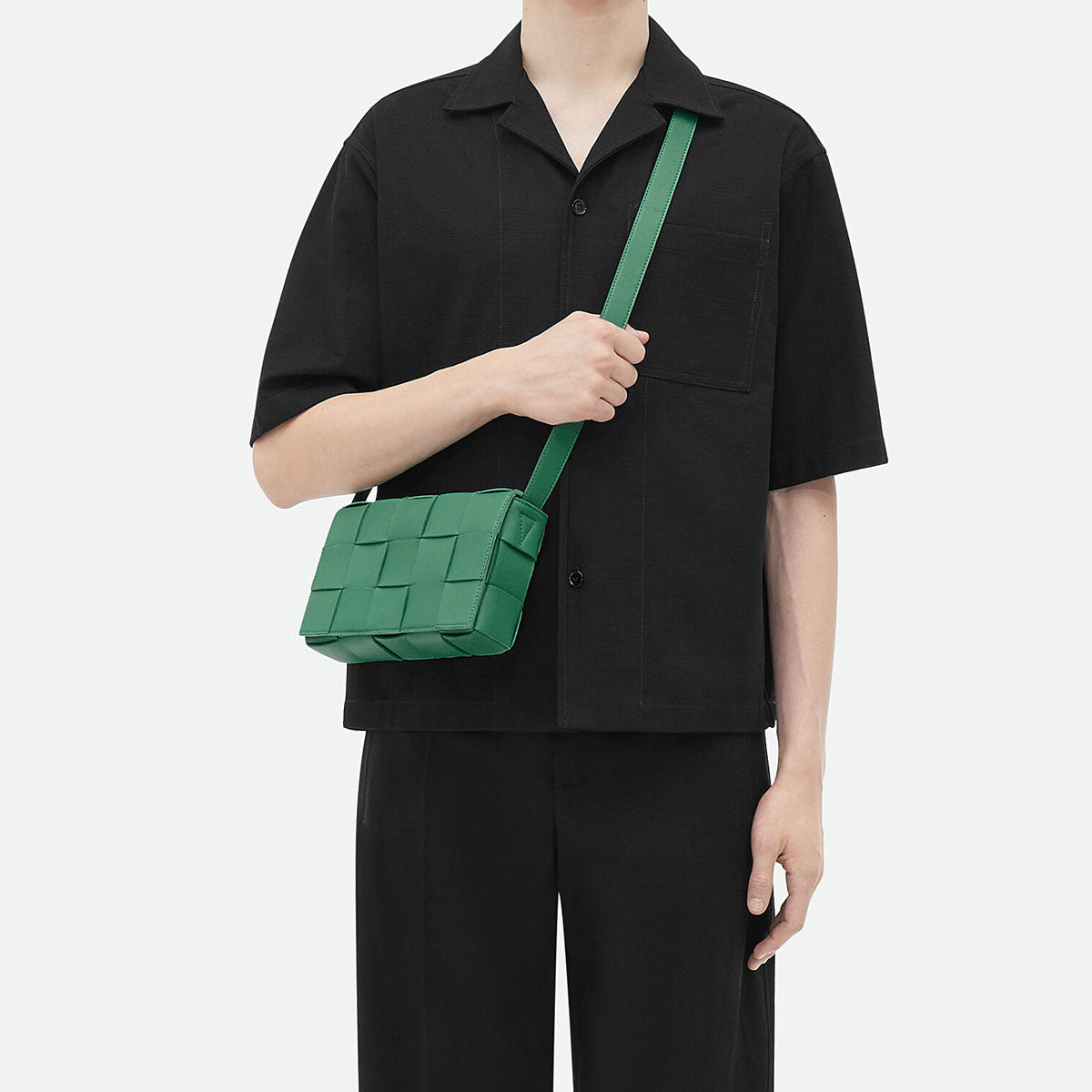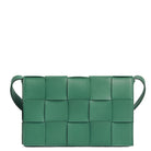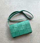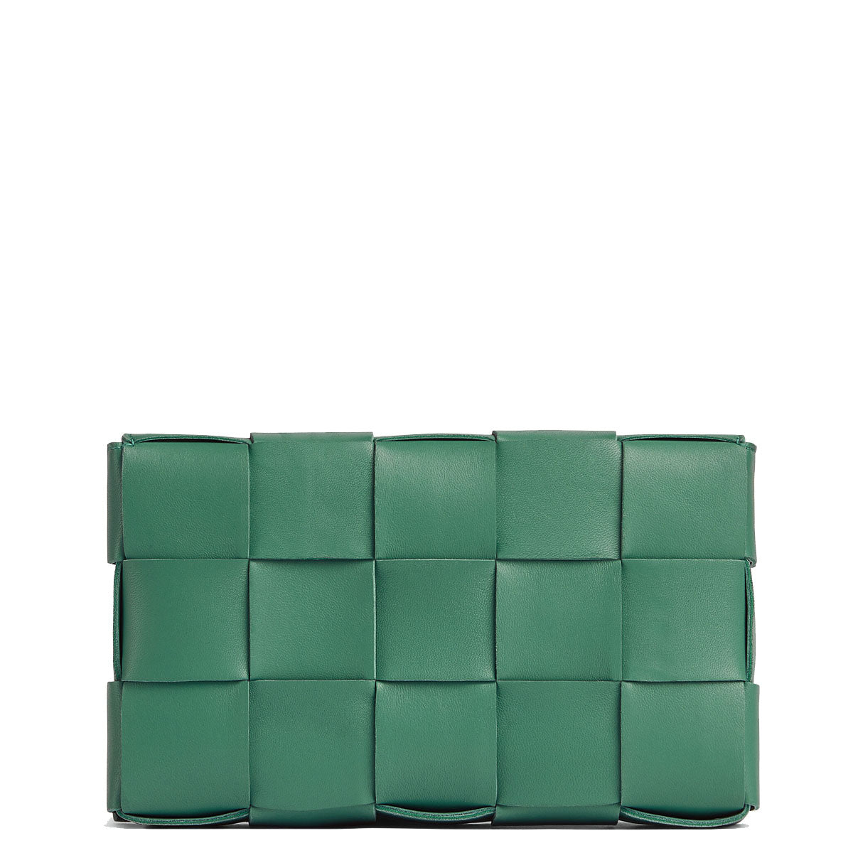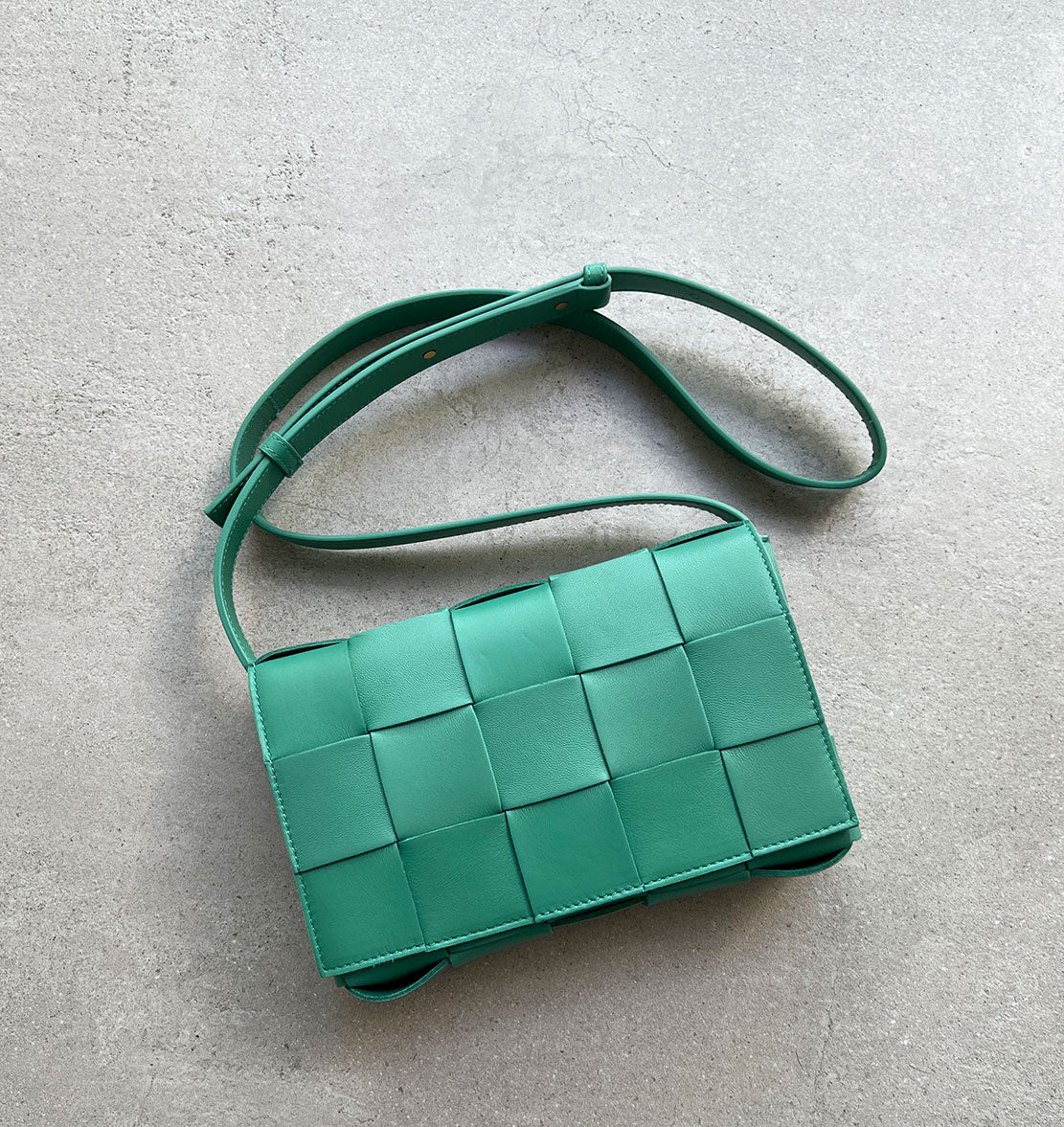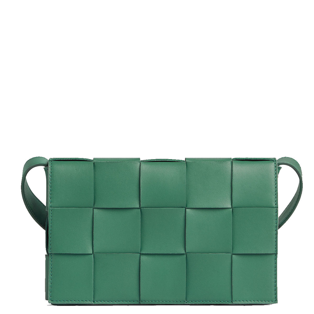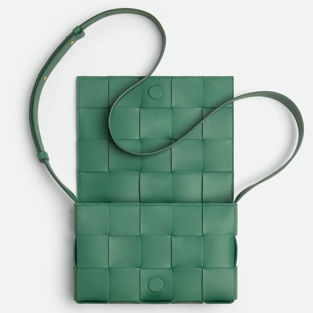 Crossbody bag in a double-face maxi weave. Made with wide double-face nappa strips in an orthogonal weave. Interior is identical to exterior; fitted with a zipped pocket and magnetic closure. Strap folds inside bag to carry as a clutch. Slim, adjustable shoulder strap.