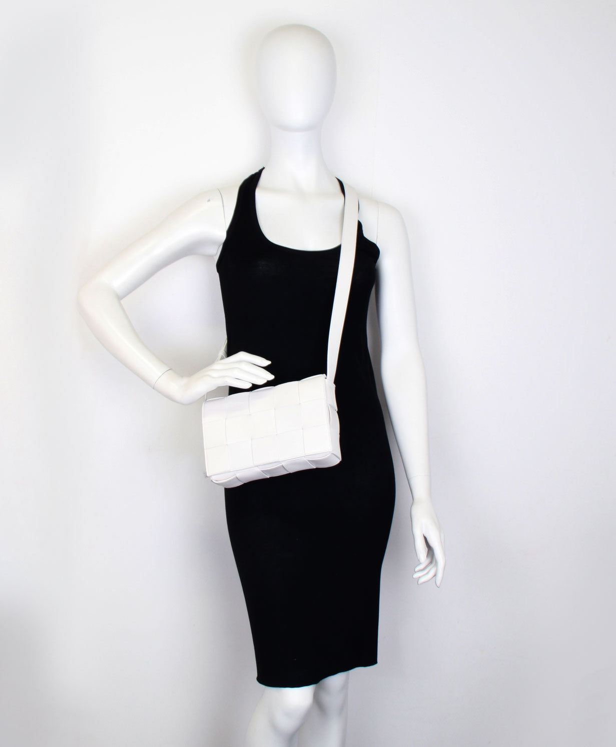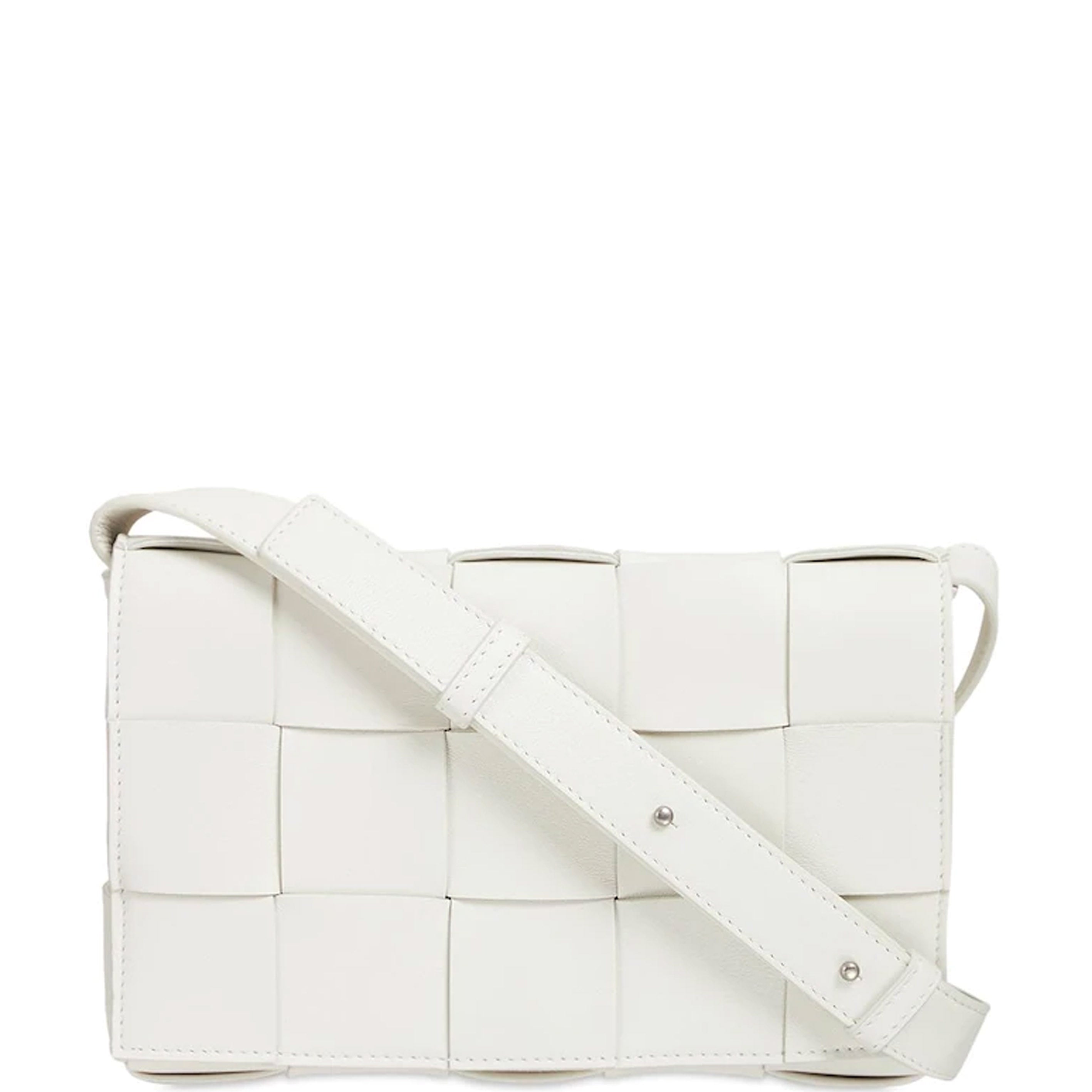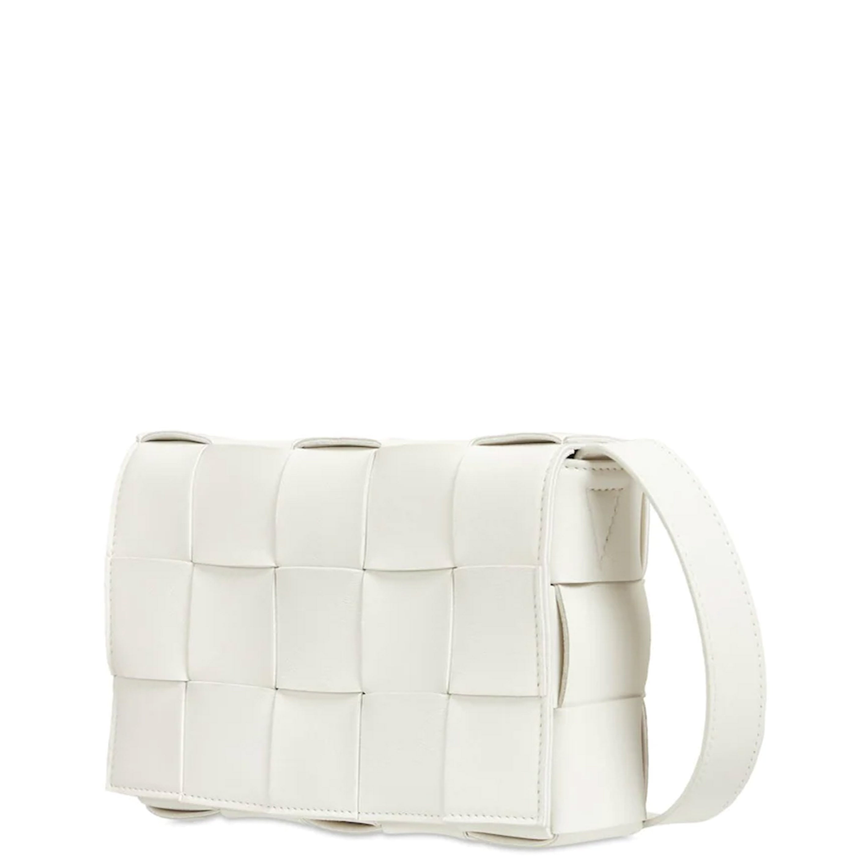 Crossbody bag in a double-face maxi weave. Made with wide double-face nappa strips in an orthogonal weave. Interior is identical to exterior; fitted with a zipped pocket and magnetic closure. Strap folds inside bag to carry as a clutch. Slim, adjustable shoulder strap