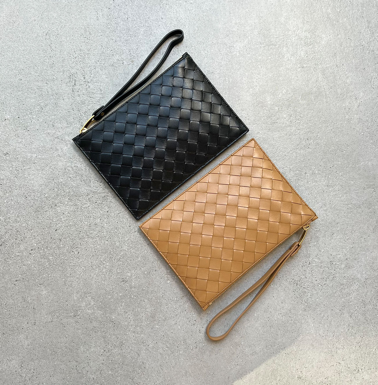Flat Intrecciato leather pouch with zip closure and detachable wristlet with gold tone hardware. Single interior open pocket lined in calfskin.