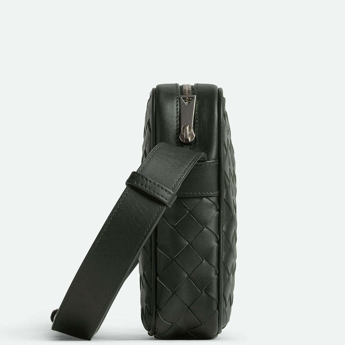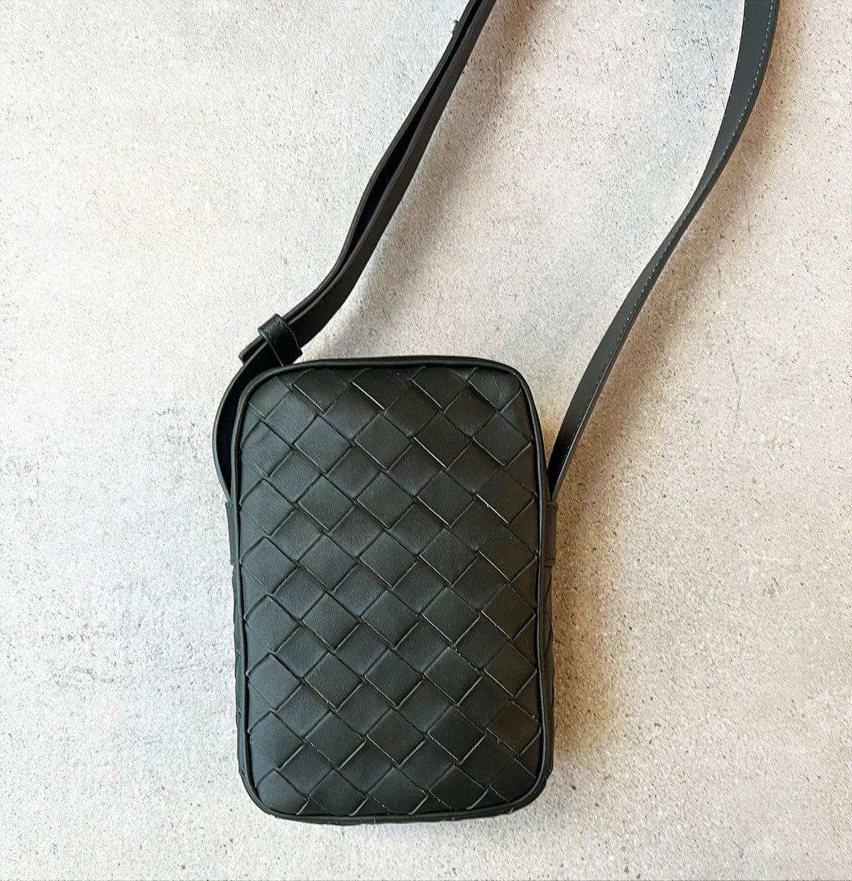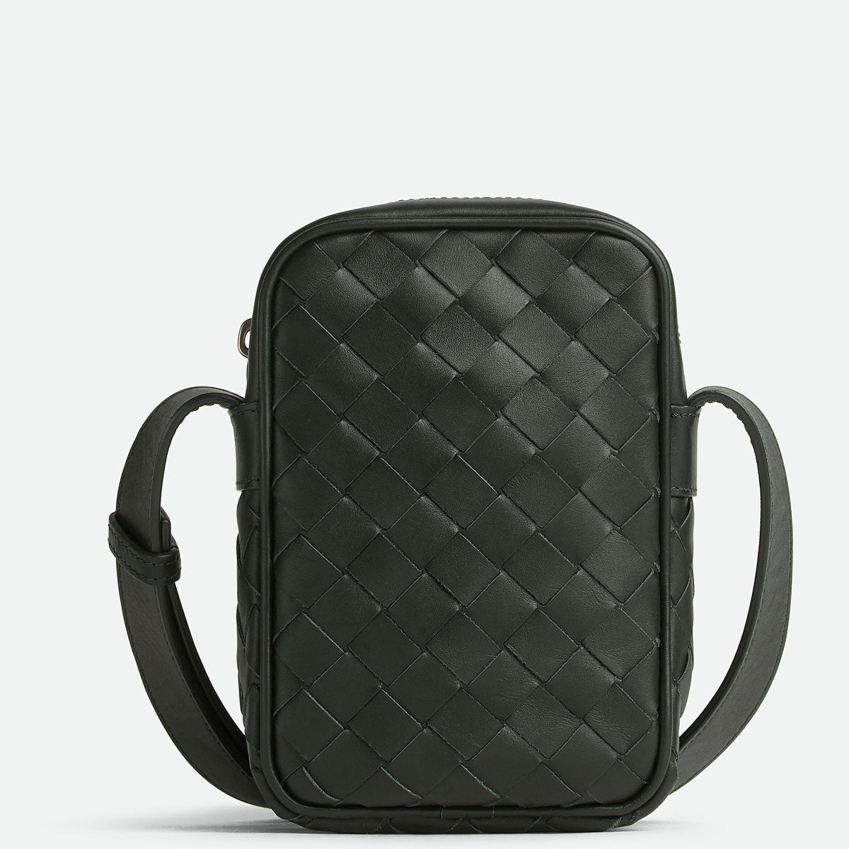 A crossbody intercciato leather pouch featuring three interior card slots and a zip closure.