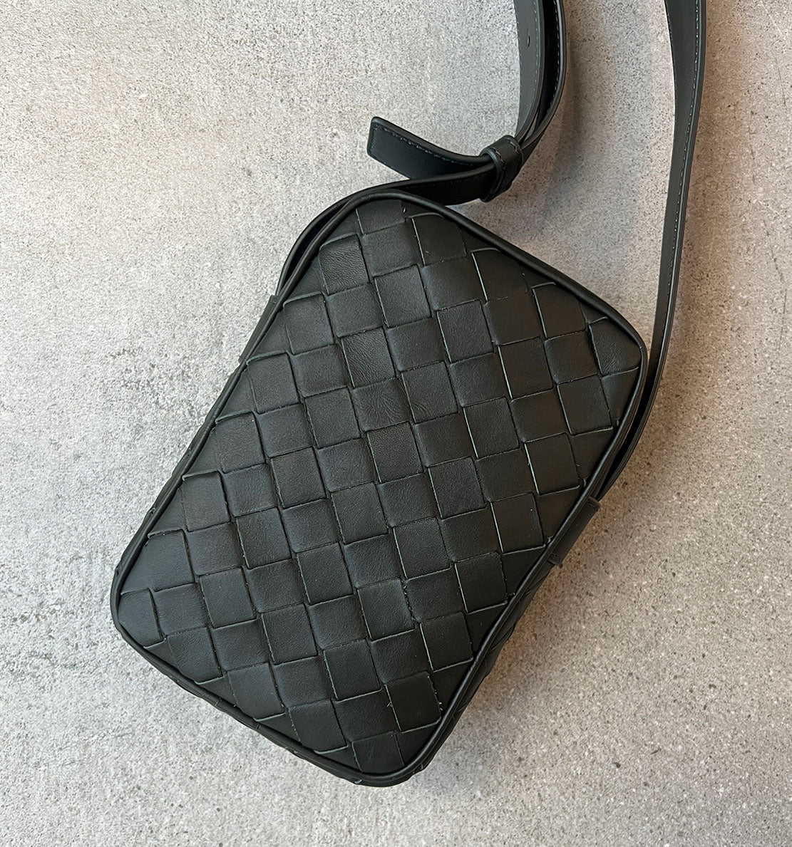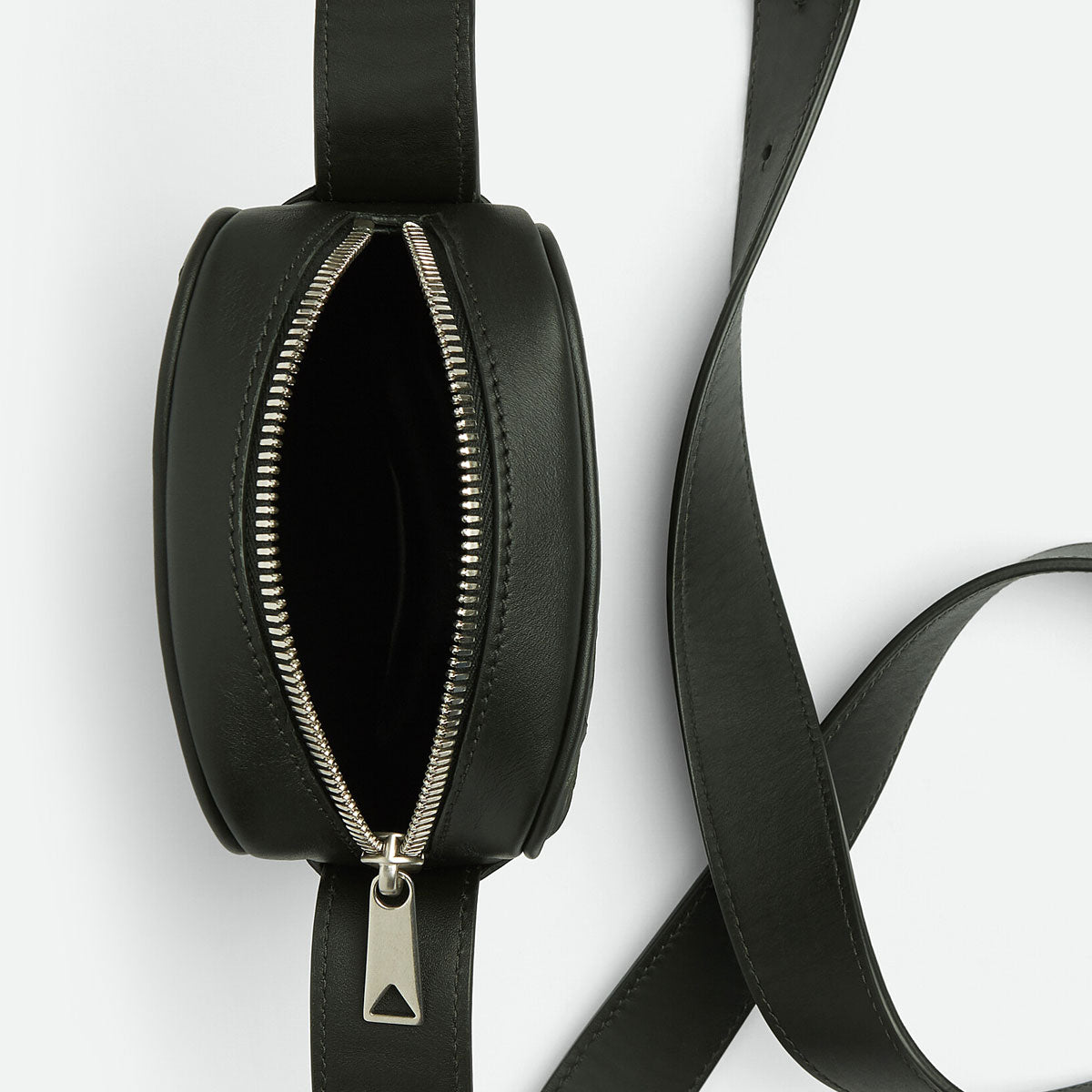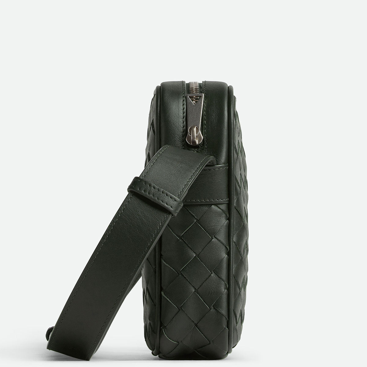 A crossbody intercciato leather pouch featuring three interior card slots and a zip closure.
