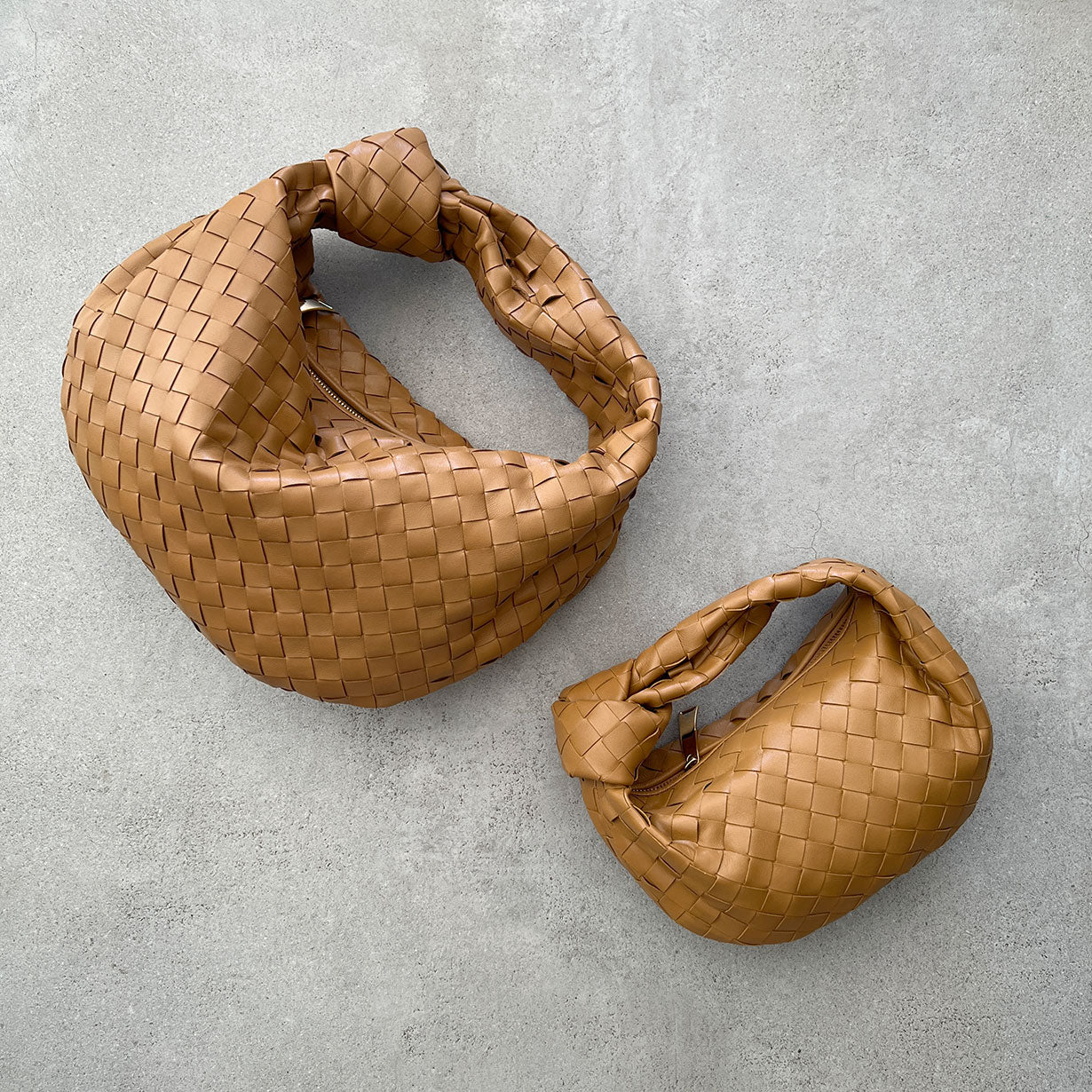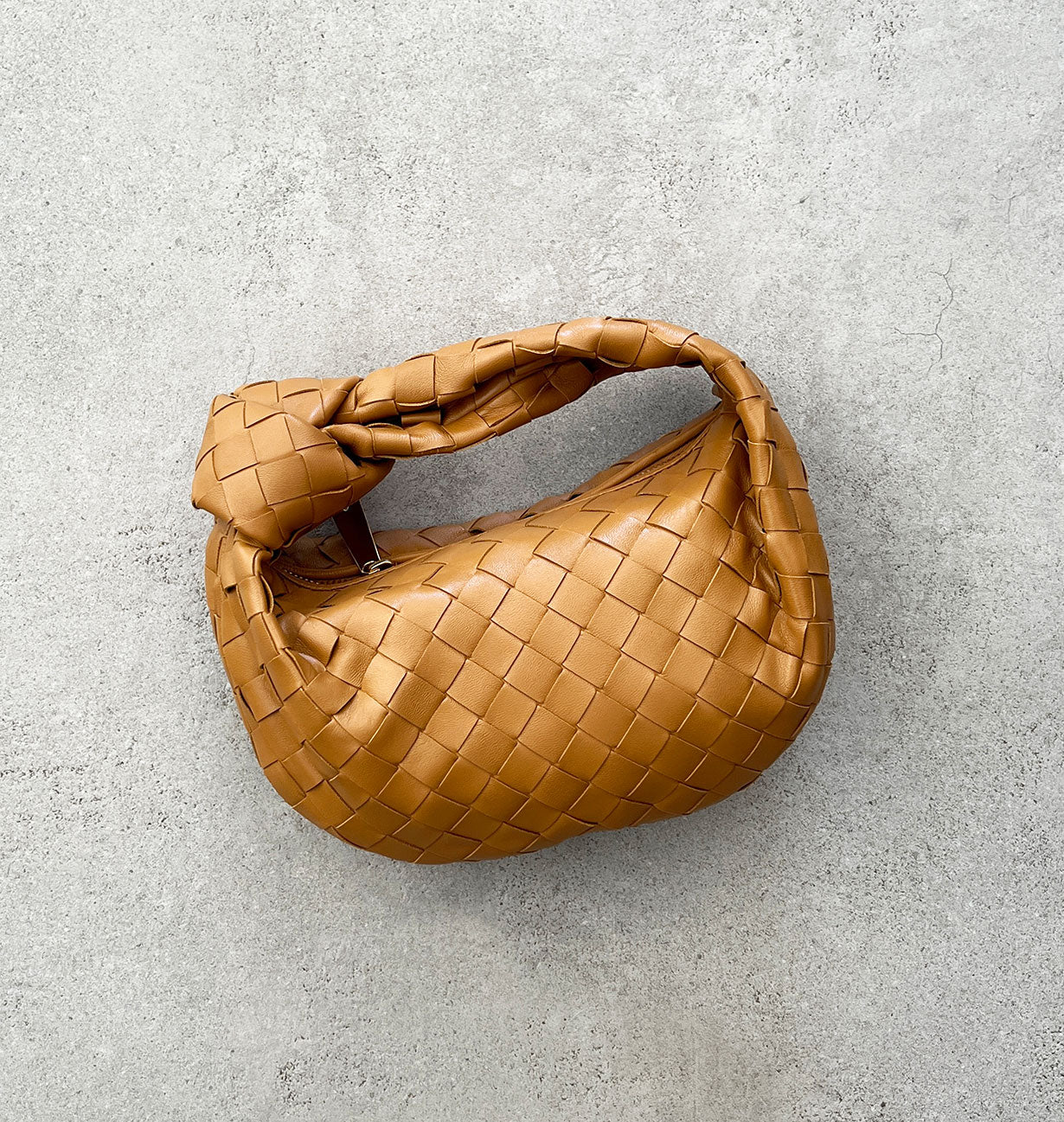 This mini BV Jodie bag is a new style for Resort 2020 and is named after actress Jodie Foster. The round mini hobo bag is woven using the iconic Intrecciato technique in supple leather and finished with a single knotted strap and a curved antiqued gold-tone metal zip. Lined in smooth calfskin.