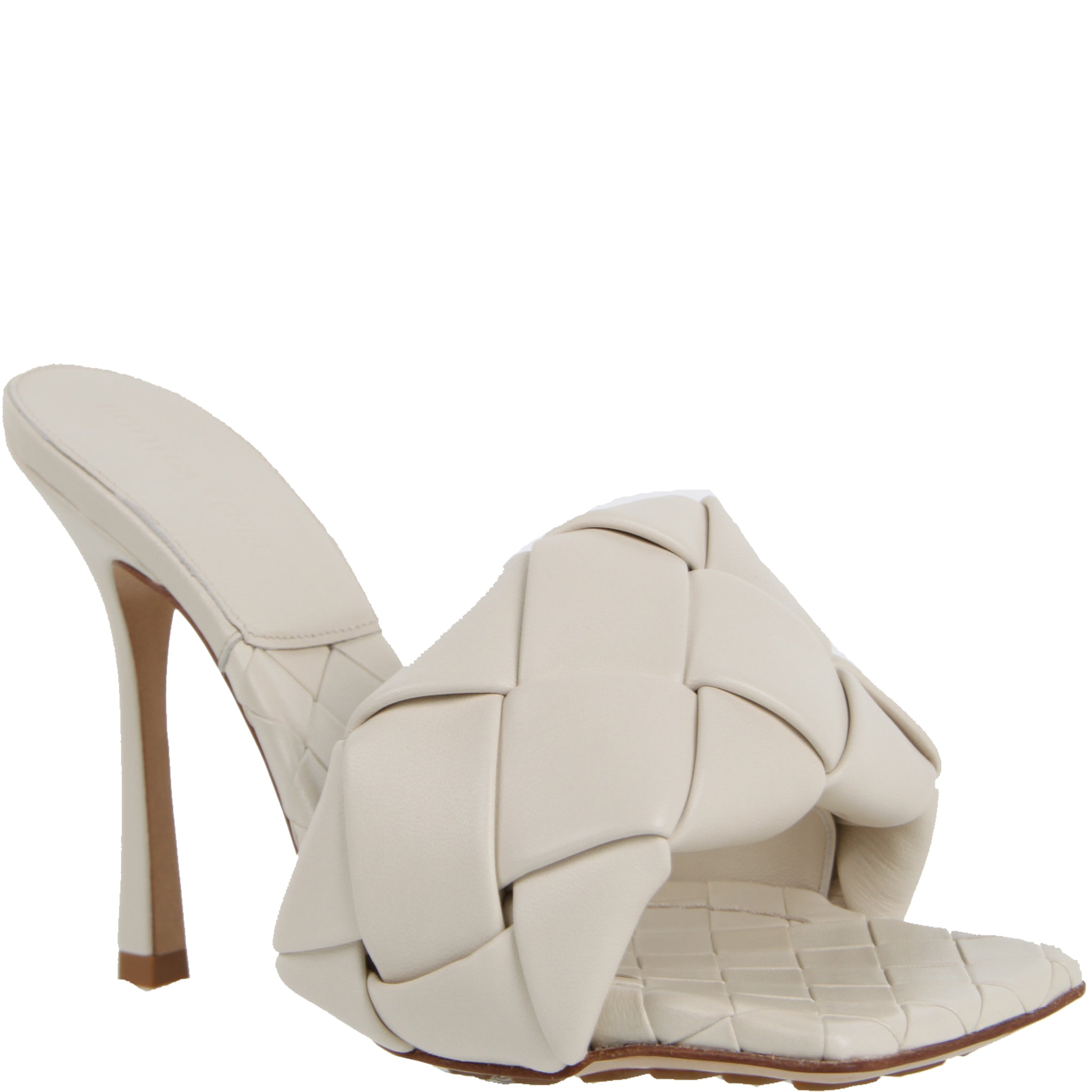 Woven leather mules with a squared sole. Signature woven intrecciato nappa amplified for a new dimension. Exceptionally soft nappa leather. Squared sole designed to extend beyond the foot. Woven insole