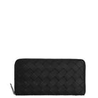 Long Zip wallet with silver tone hardware. Intrecciato leather wallet. Eight card slots, two note compartments, two additional pockets, one zipped coin purse. Zip closure