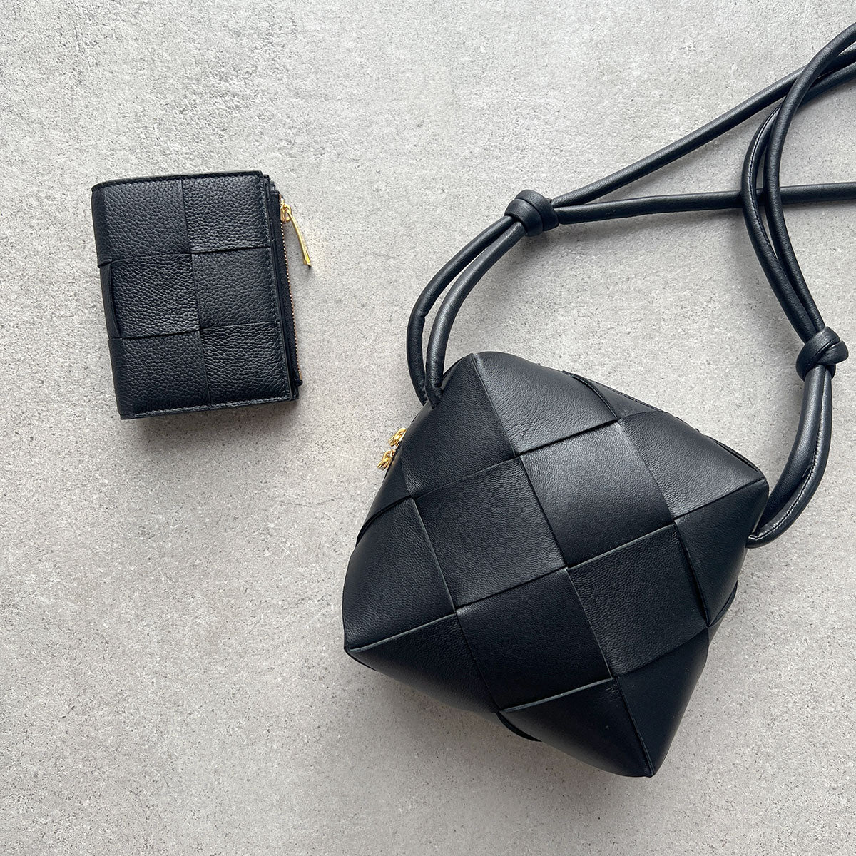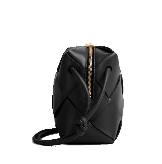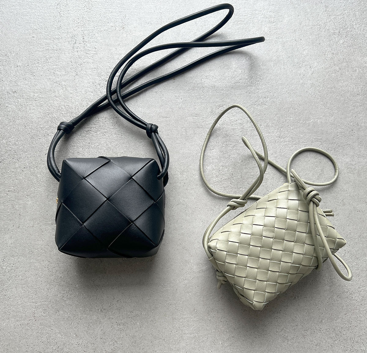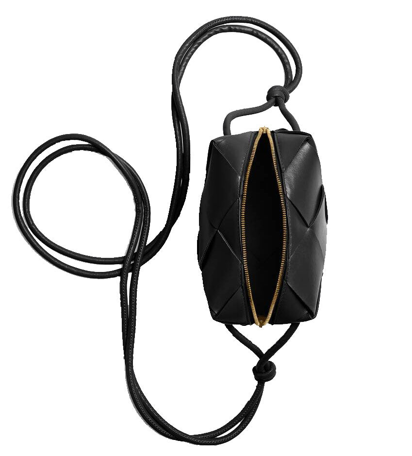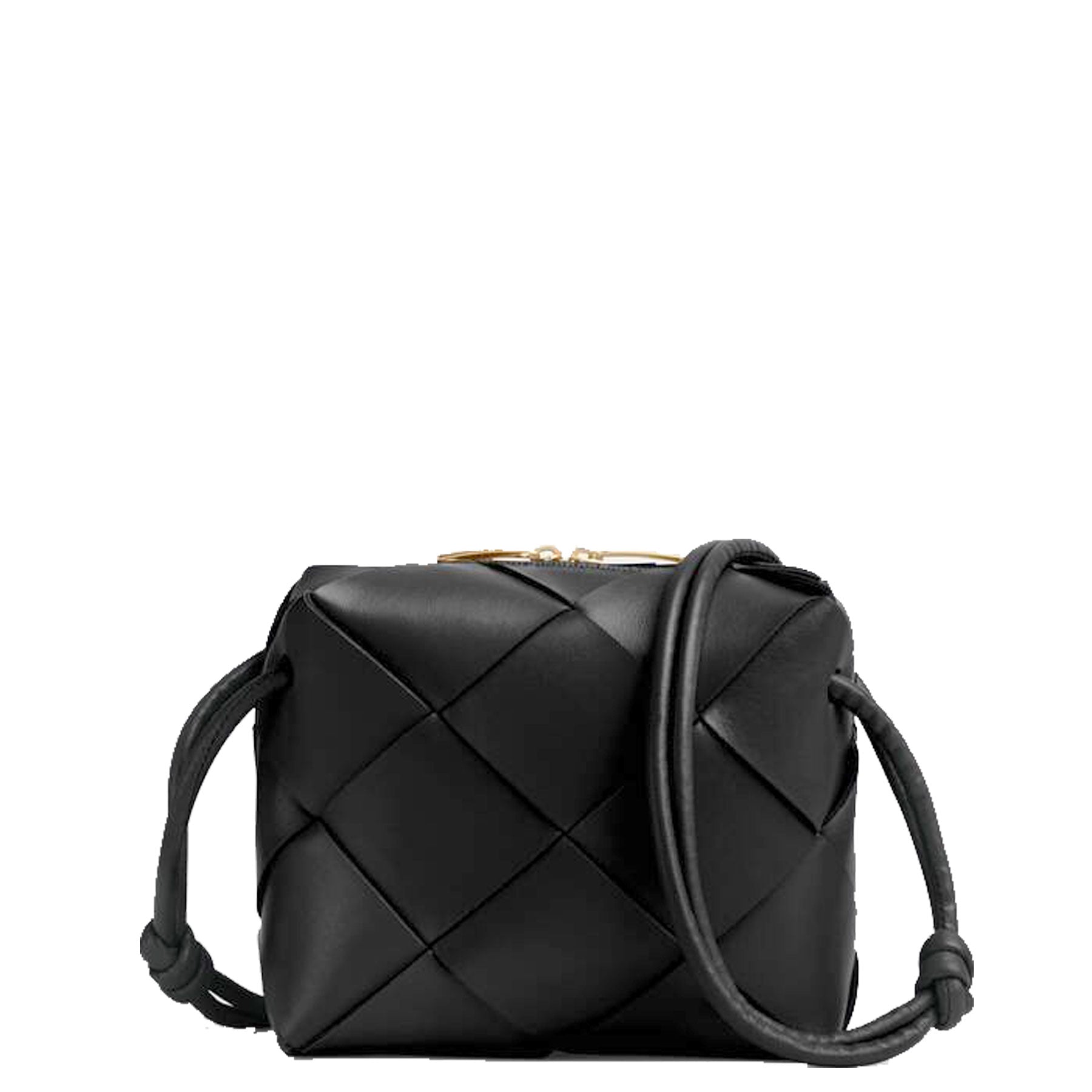 Bottega Veneta's signature Loop Mini bag is now available in their cassette weave. This crossbody bag has a soft edge boxy shape crafted from lamb leather and features double knotted side details on the strap, zip top closure and bonded lambskin lining.