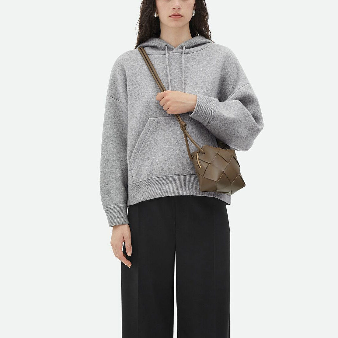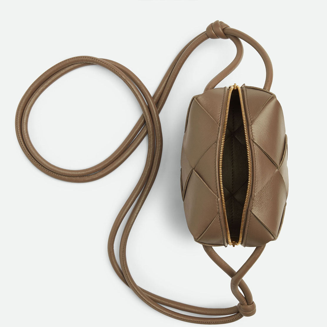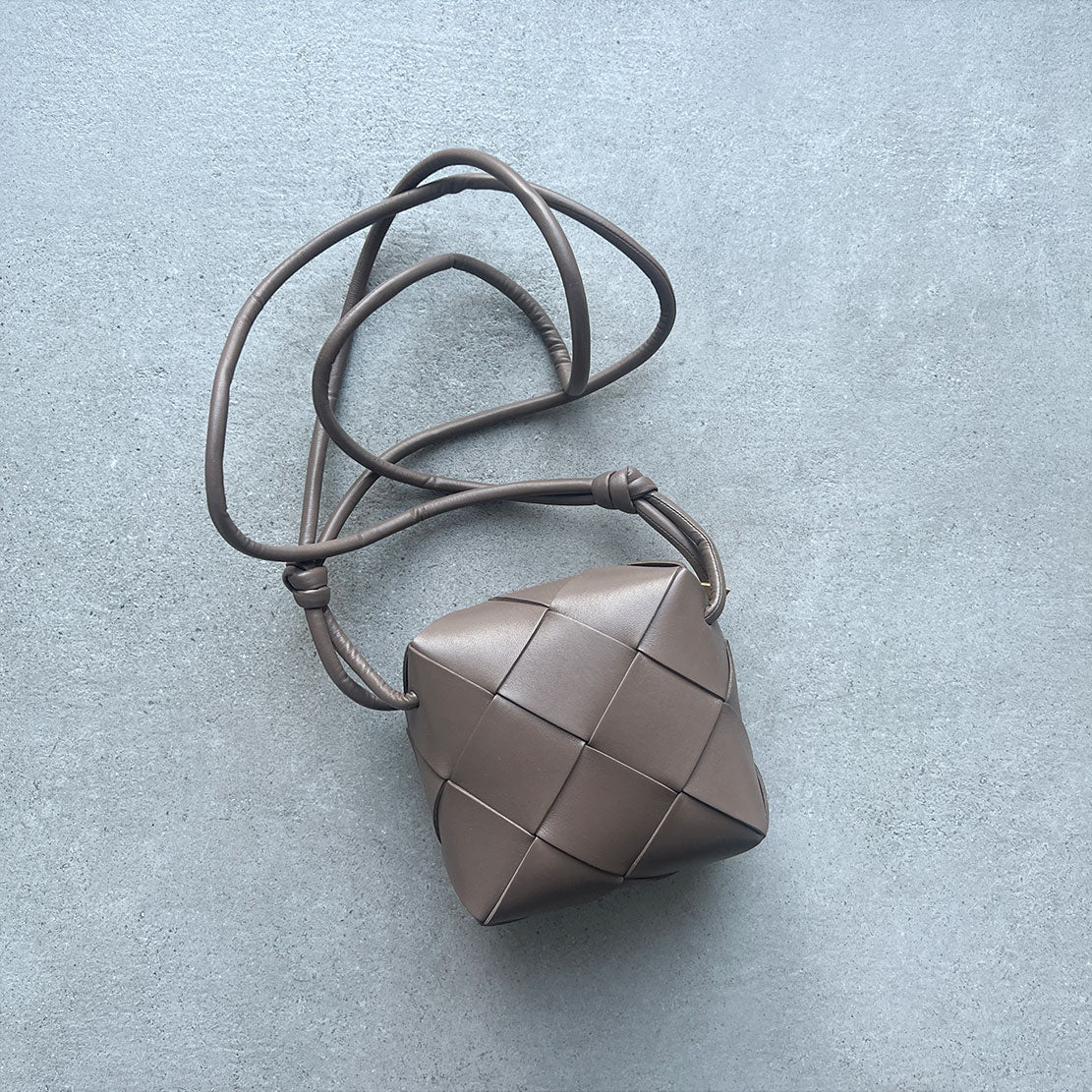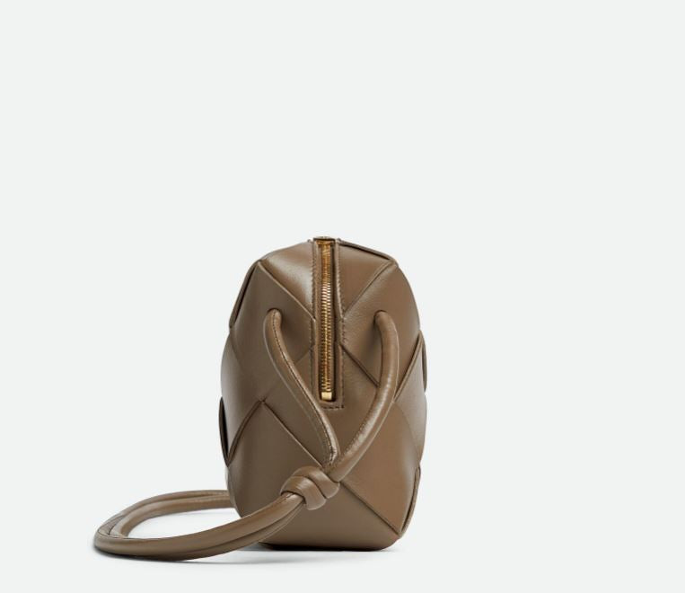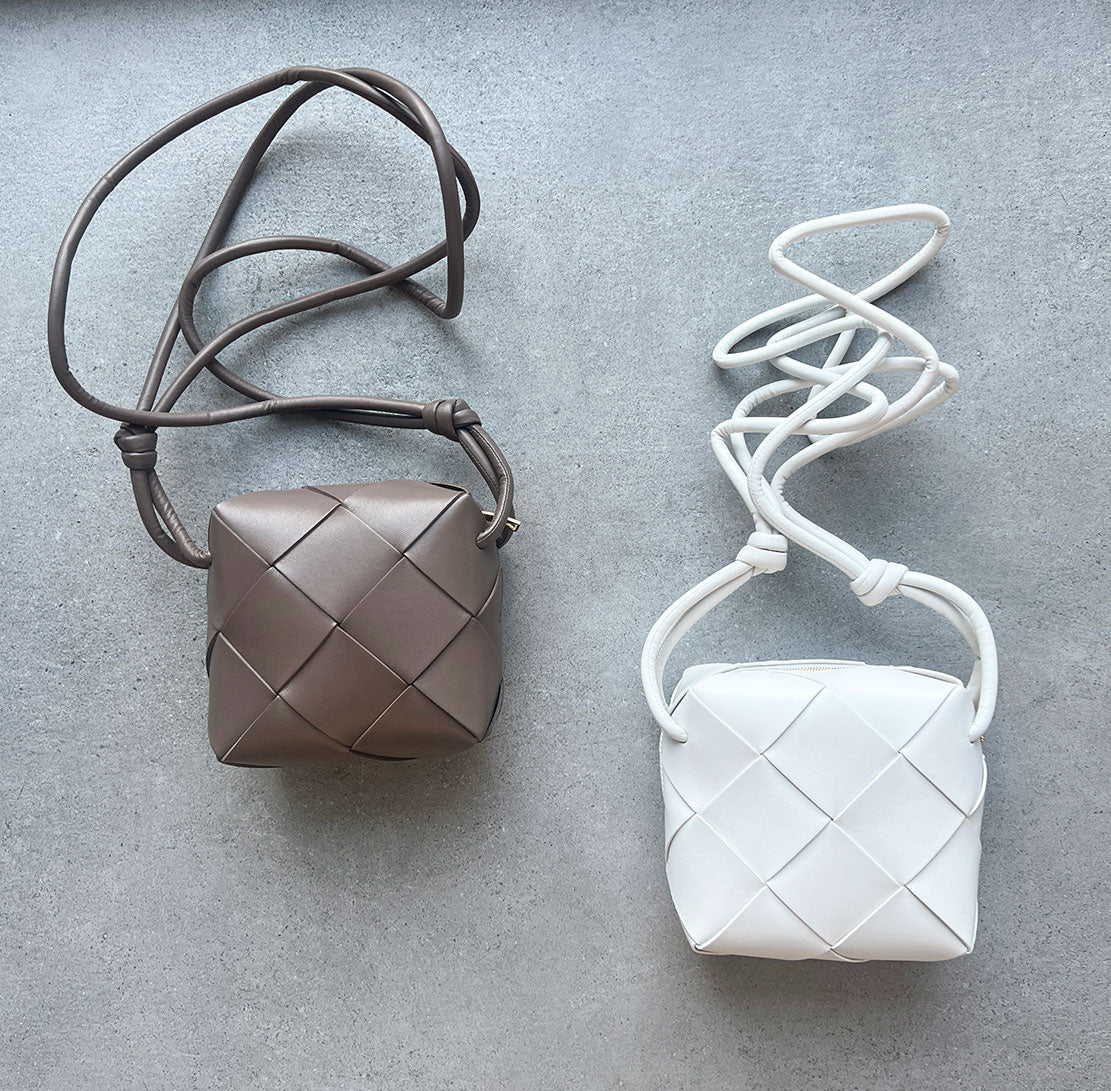 Bottega Veneta's signature Loop Mini bag is now available in their cassette weave. This crossbody bag has a soft edge boxy shape crafted from lamb leather and features double knotted side details on the strap, zip top closure and bonded lambskin lining.