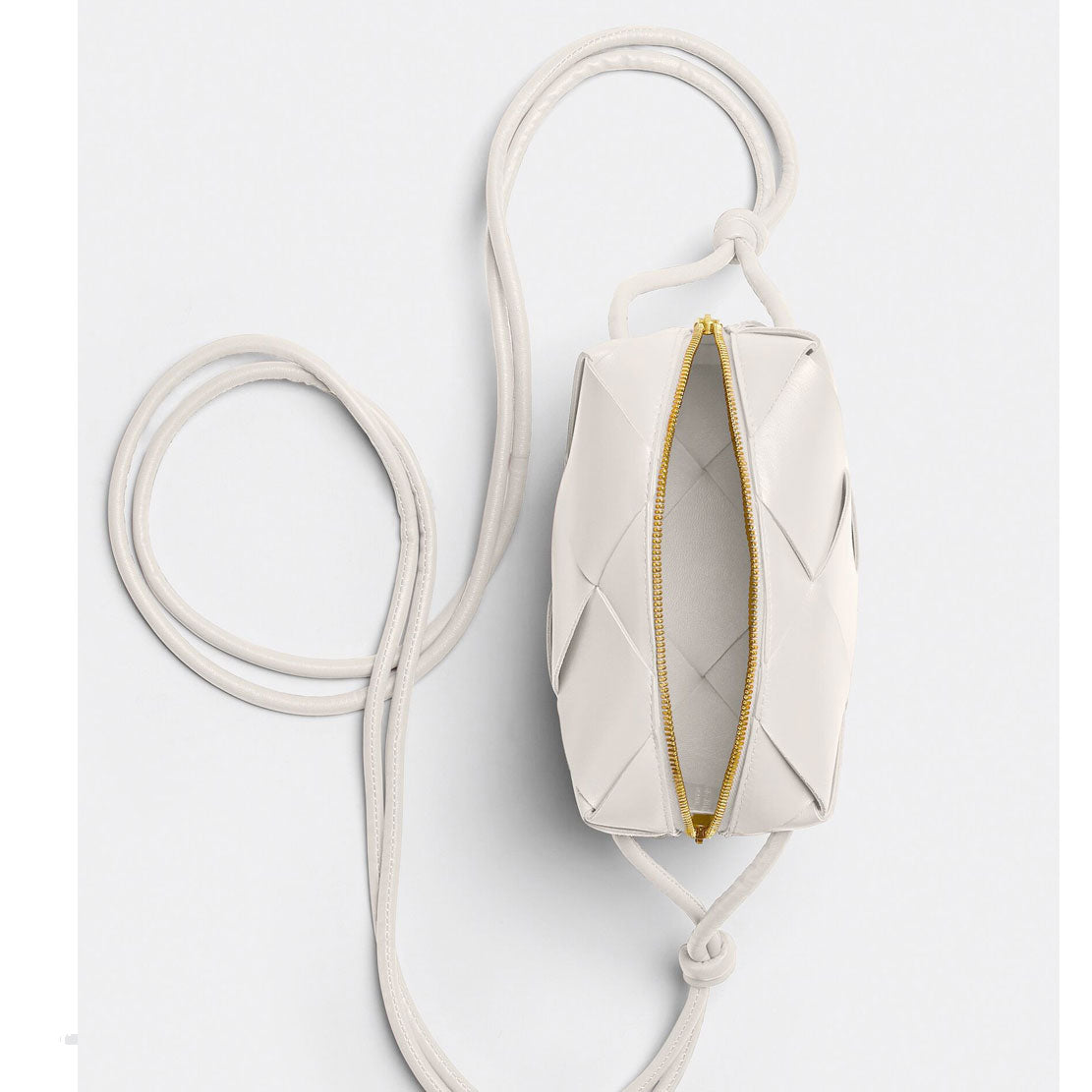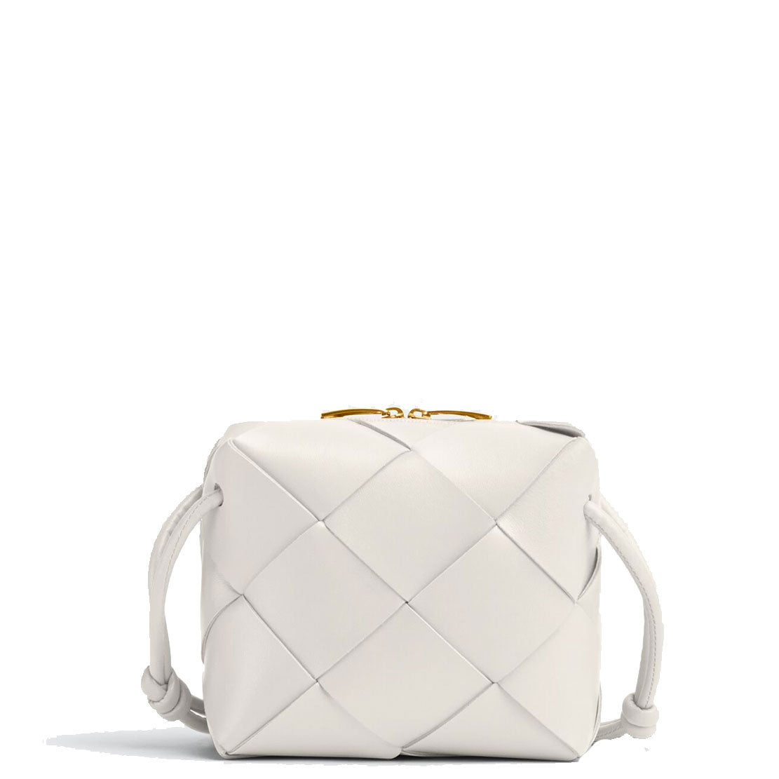 Bottega Veneta's signature Loop Mini bag is now available in their cassette weave. This crossbody bag has a soft edge boxy shape crafted from lamb leather and features double knotted side details on the strap, zip top closure and bonded lambskin lining.