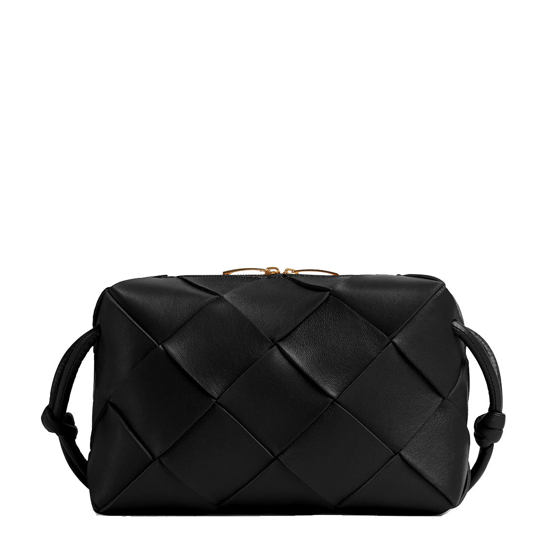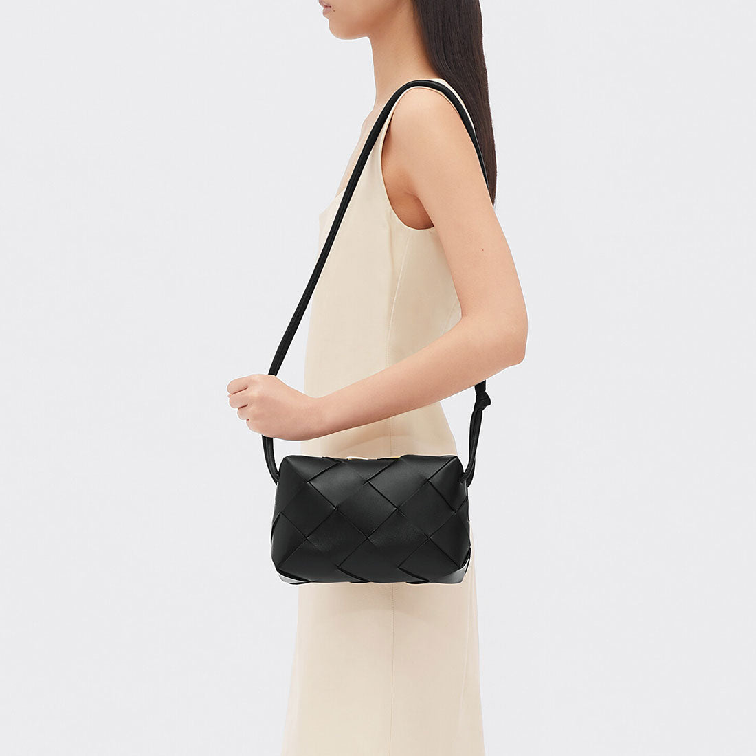 Bottega Veneta's signature Loop Small bag is now available in their cassette weave. This crossbody bag has a soft edge boxy shape crafted from lamb leather and features double knotted side details on the strap, zip top closure and bonded lambskin lining.