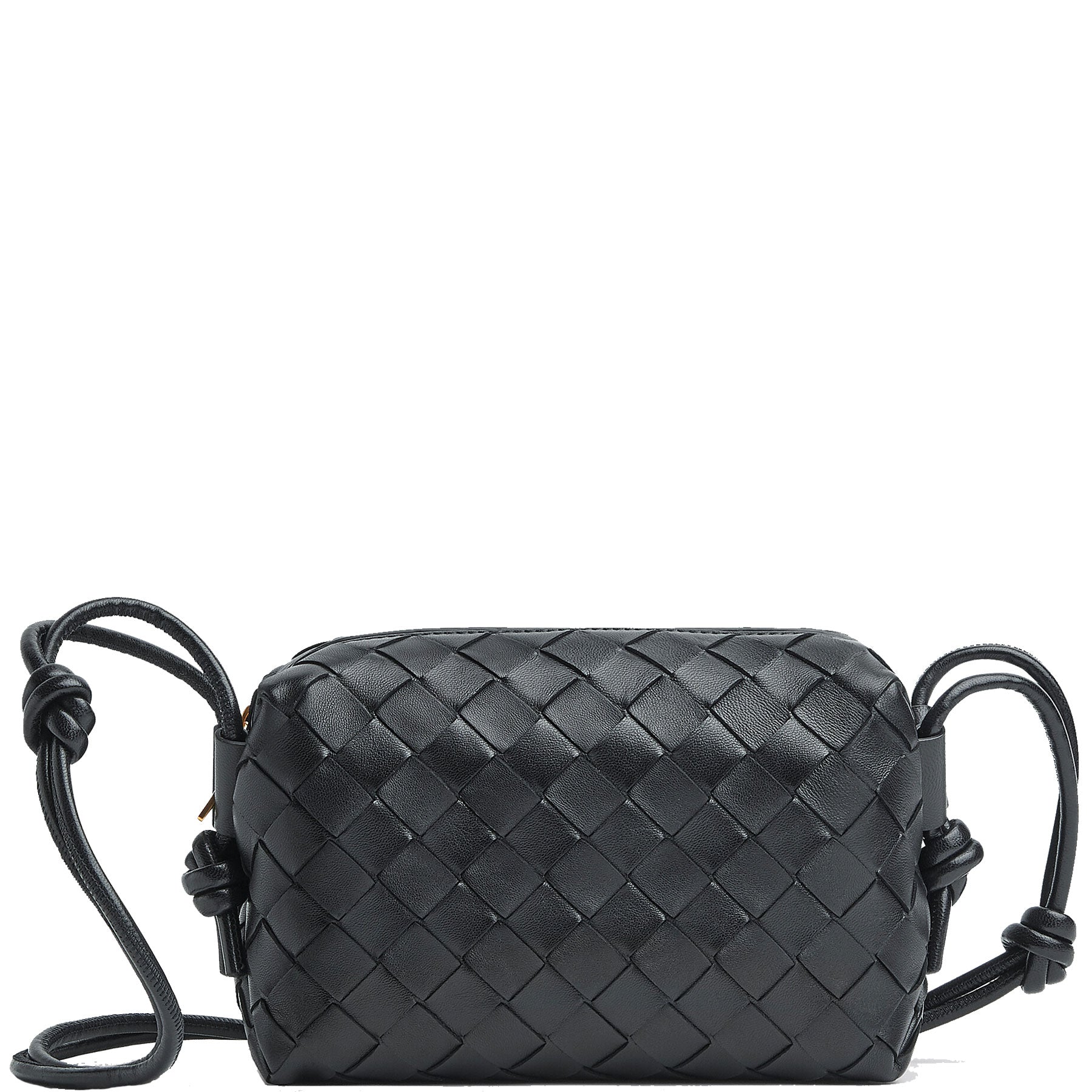 Bottega Veneta's Loop Mini bag is woven in the designers distinguishable intrecciato weave. This crossbody bag has a soft edge boxy shape crafted from lamb leather and features double knotted side details on the strap, zip top closure and internal leather lining with one slot pocket.