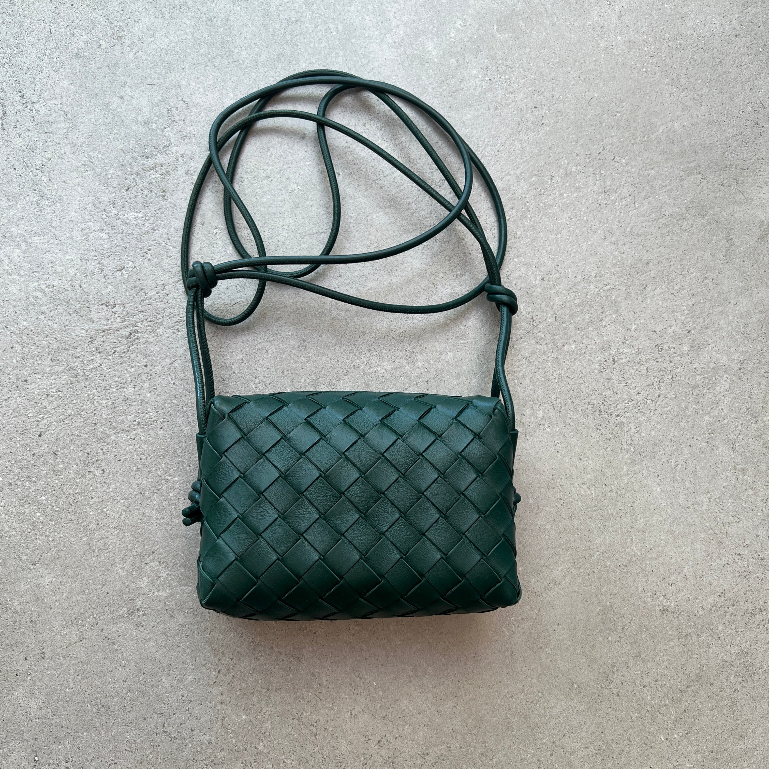 Bottega Veneta's Loop Mini bag is woven in the designers distinguishable intrecciato weave. This crossbody bag has a soft edge boxy shape crafted from lamb leather and features double knotted side details on the strap and zip top closure.