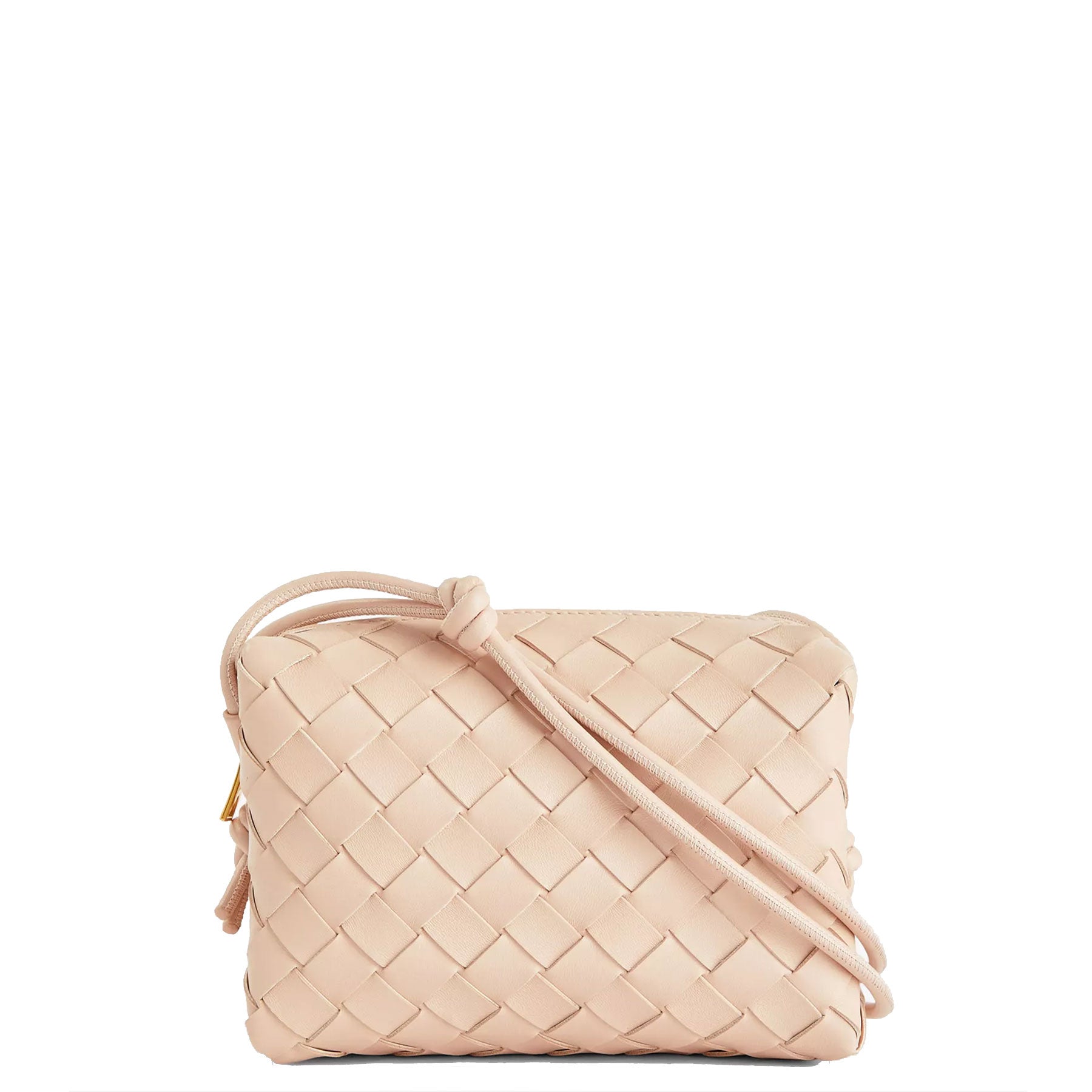 Bottega Veneta's Loop Mini bag is woven in the designers distinguishable intrecciato weave. This crossbody bag has a soft edge boxy shape crafted from lamb leather and features double knotted side details on the strap and zip top closure. Shown in photos next to the Black East West Loop