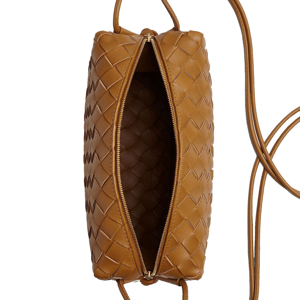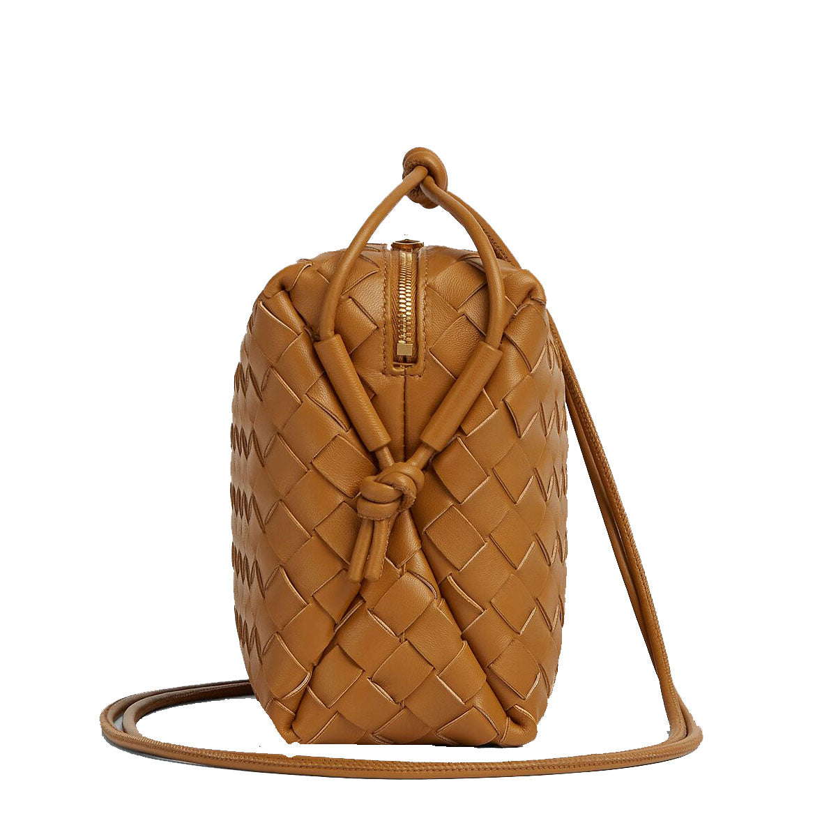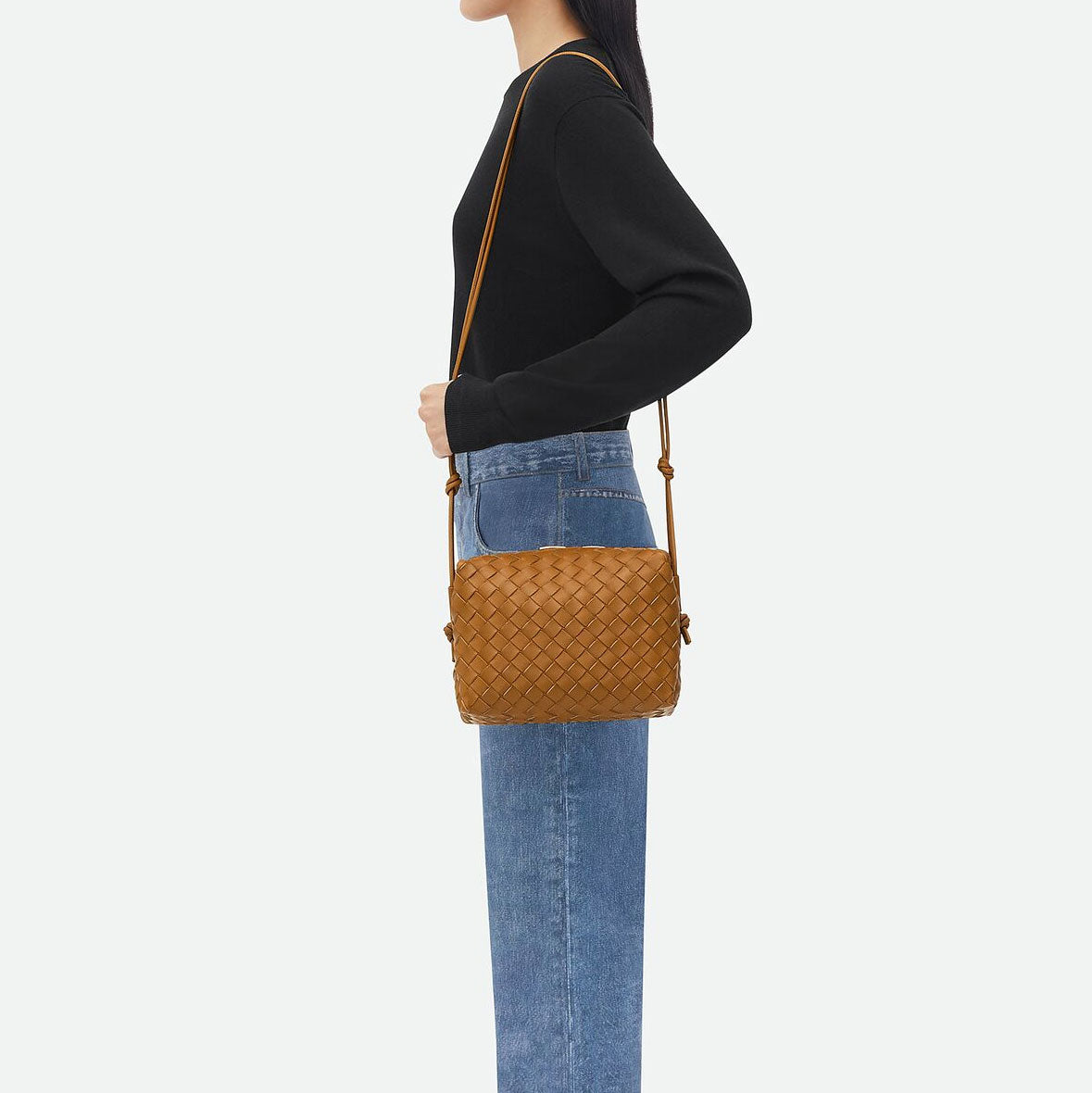 Bottega Veneta's Loop Small bag is woven in the designers distinguishable intrecciato weave. This crossbody bag has a soft edge boxy shape crafted from lamb leather and features double knotted side details on the strap, zip top closure and internal leather lining with one slot pocket.