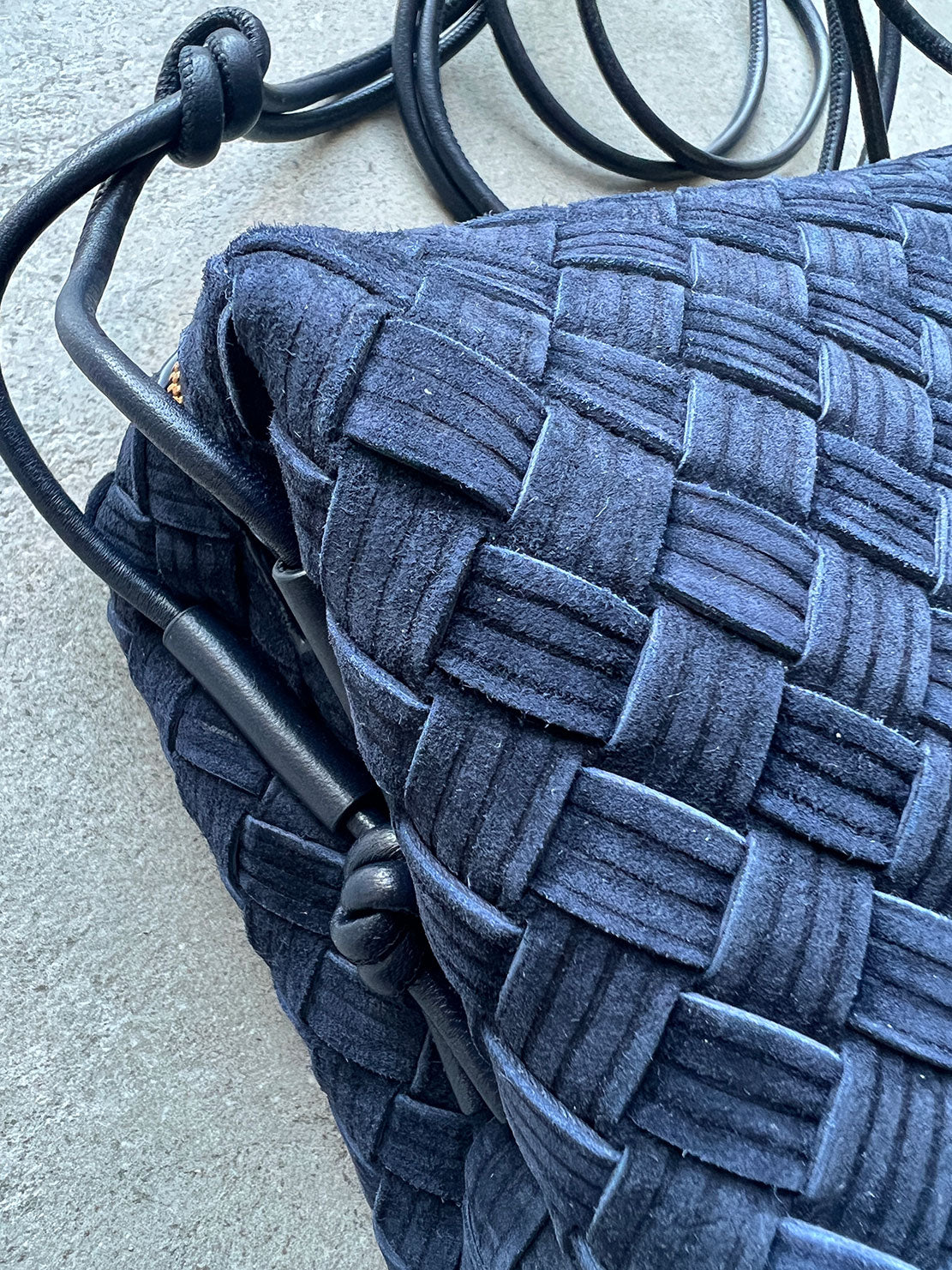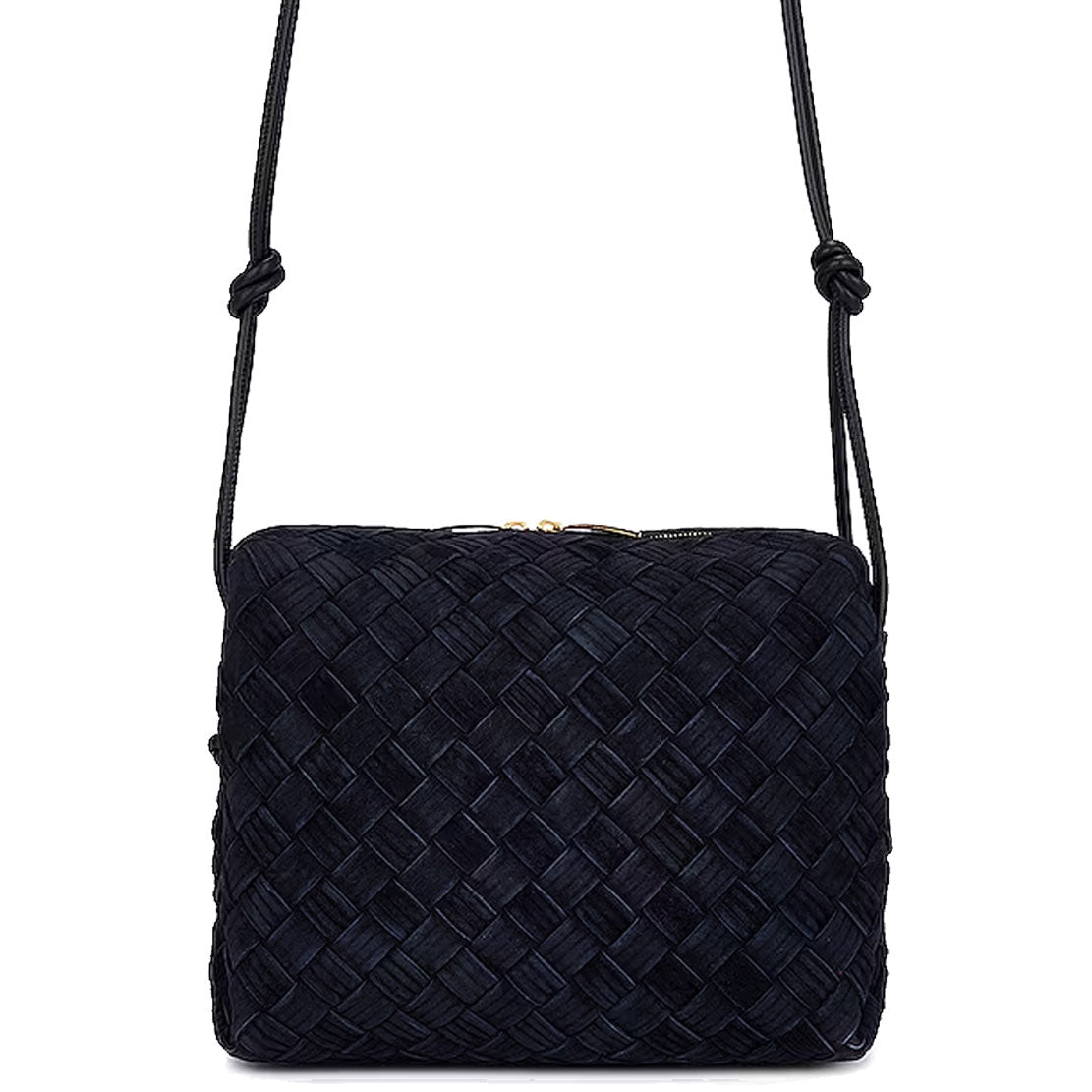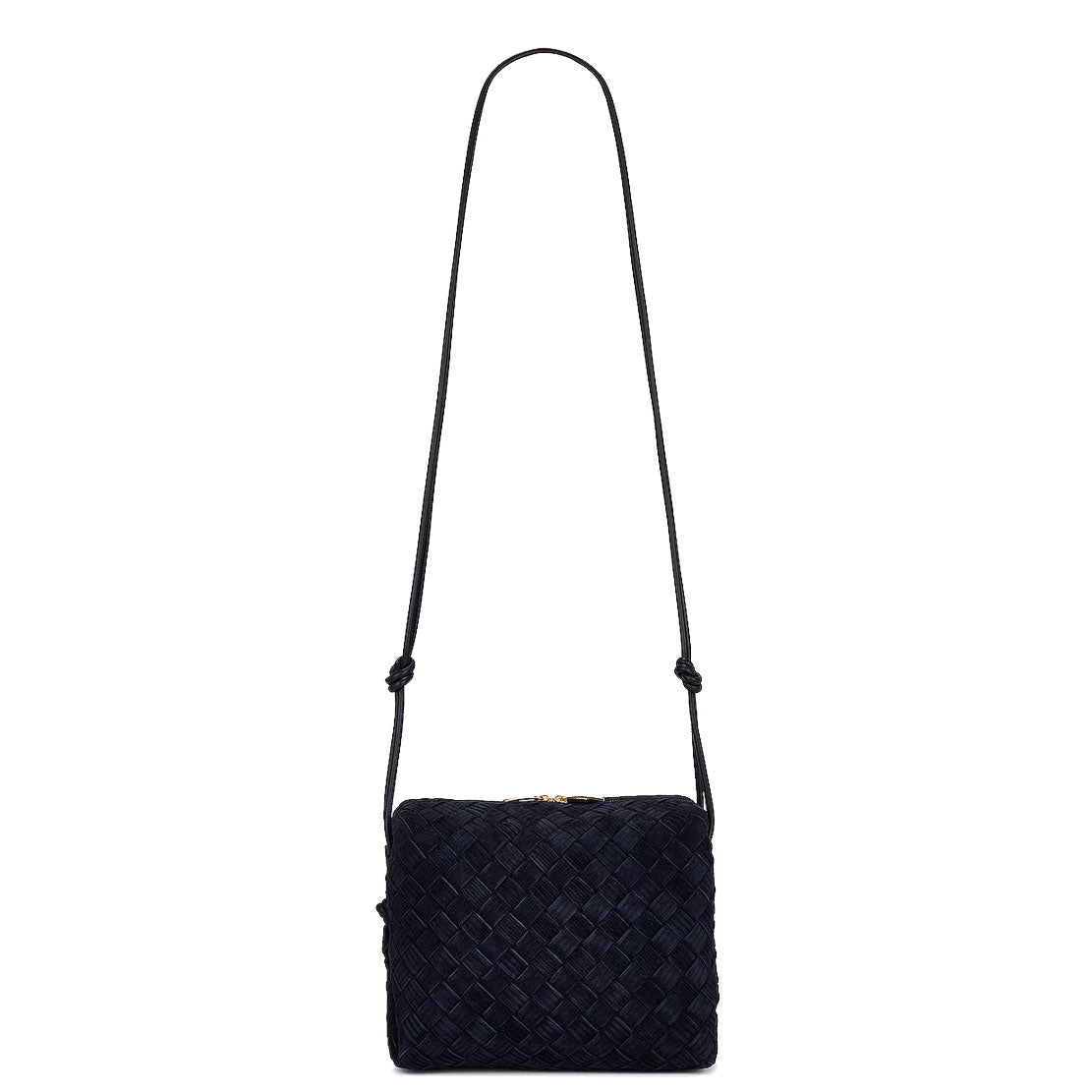 Bottega Veneta's Loop Small bag is woven in the designers distinguishable intrecciato weave. This crossbody bag has a soft edge boxy shape crafted from suede with embossed stripe detailing and features double knotted side details on the leather strap, zip top closure and internal leather lining with one slot pocket.