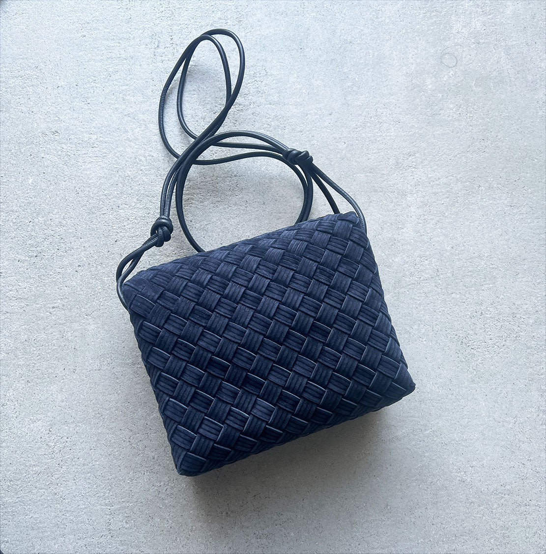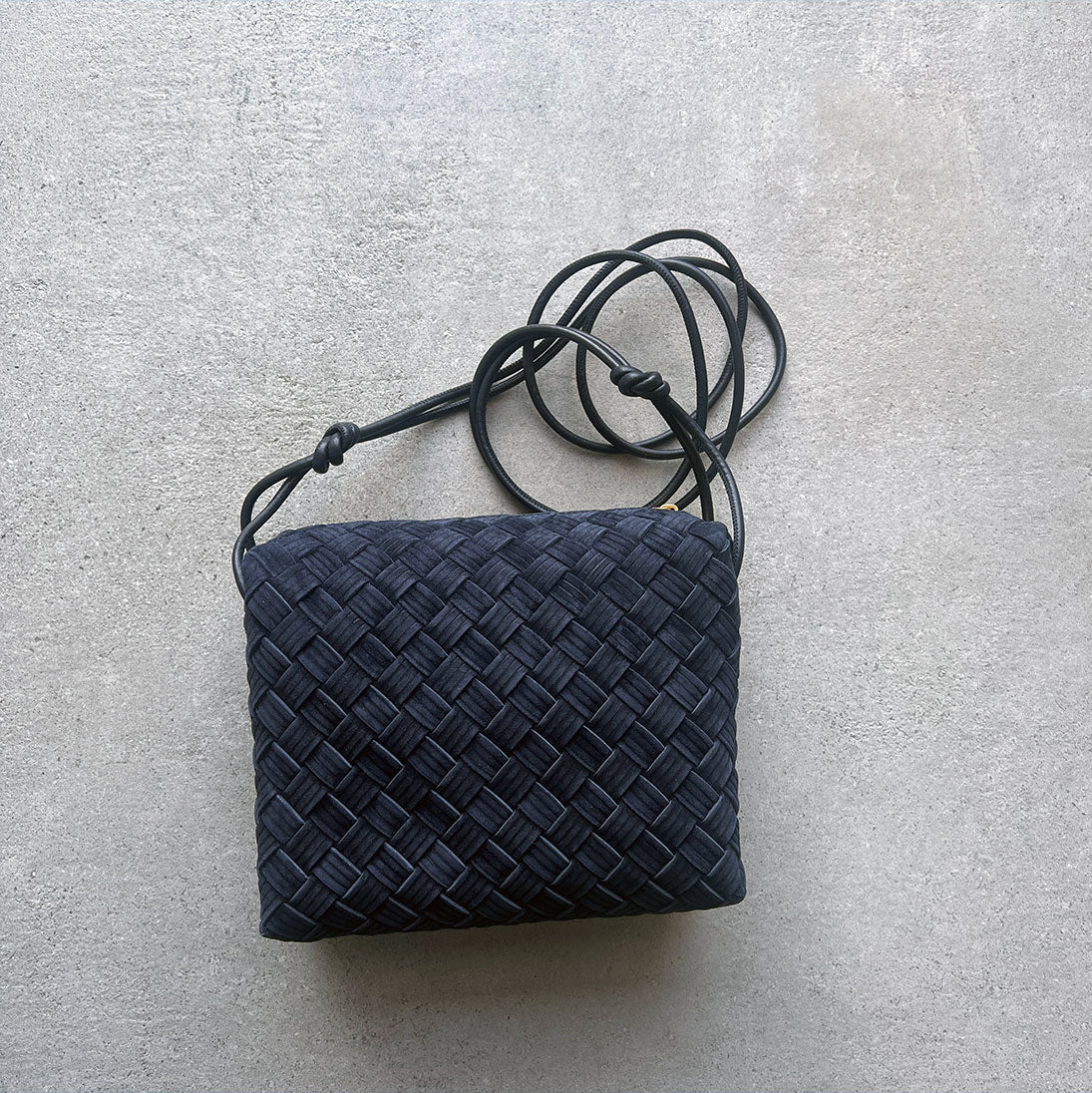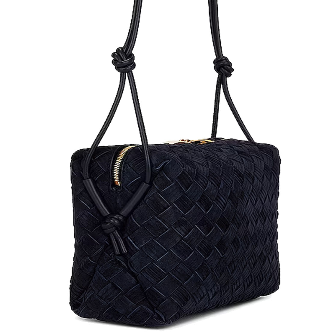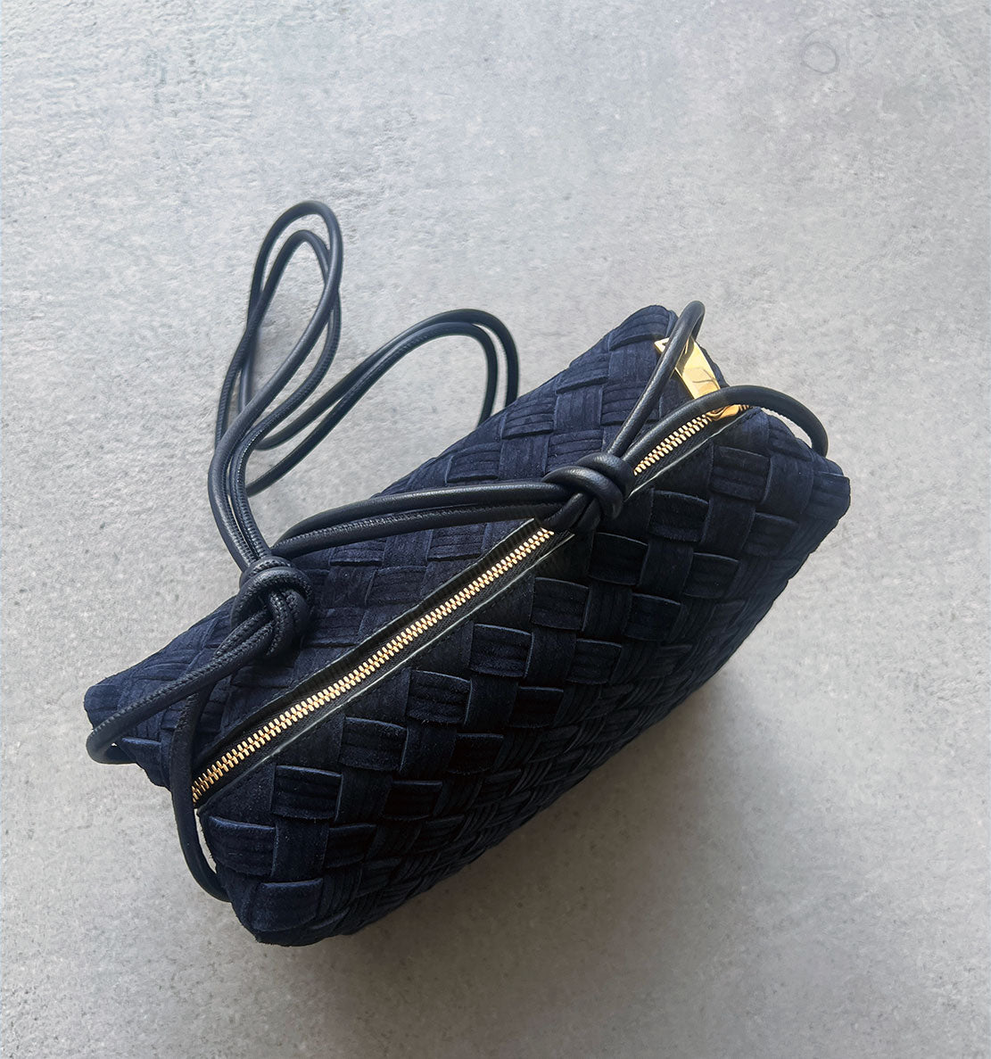 Bottega Veneta's Loop Small bag is woven in the designers distinguishable intrecciato weave. This crossbody bag has a soft edge boxy shape crafted from suede with embossed stripe detailing and features double knotted side details on the leather strap, zip top closure and internal leather lining with one slot pocket.