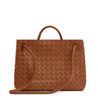 Medium Intrecciato leather top handle bag with sliding cross-body strap • Compartmented interior with one zipped pocket, two open pockets • Magnetic closure
