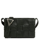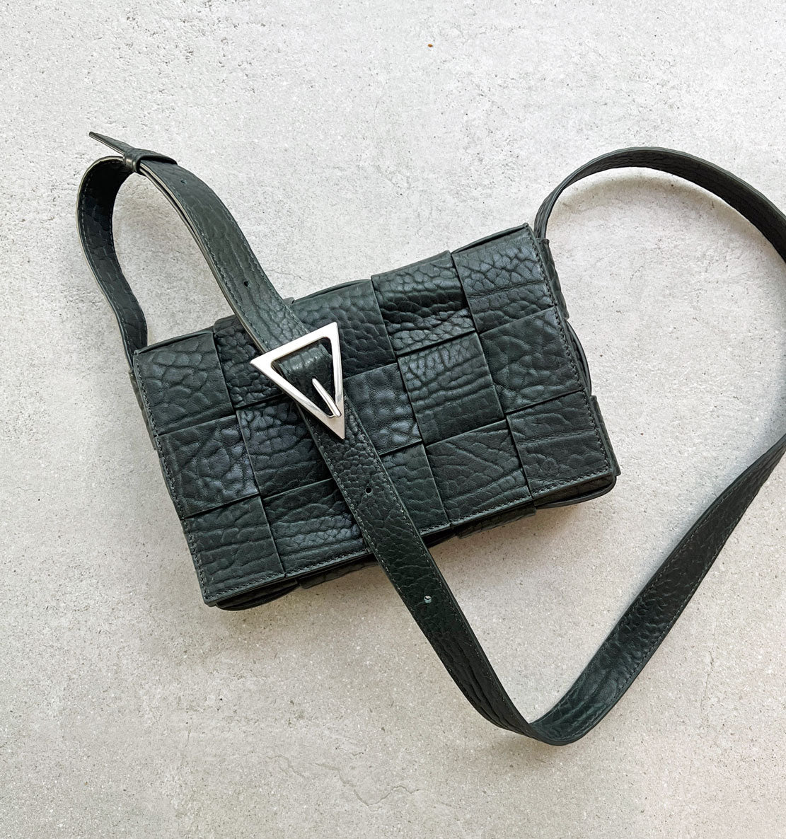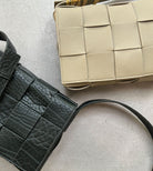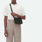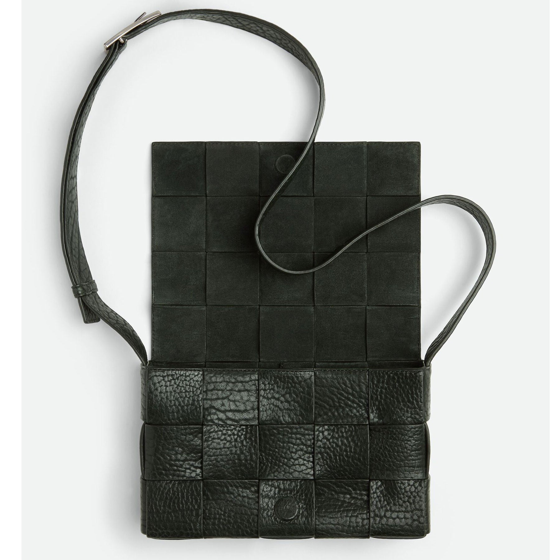 Crossbody bag in a double-face maxi weave. Made with wide double-face nappa strips in an orthogonal weave. Interior is identical to exterior; fitted with a zipped pocket and magnetic closure. Strap folds inside bag to carry as a clutch. Slim, adjustable shoulder strap