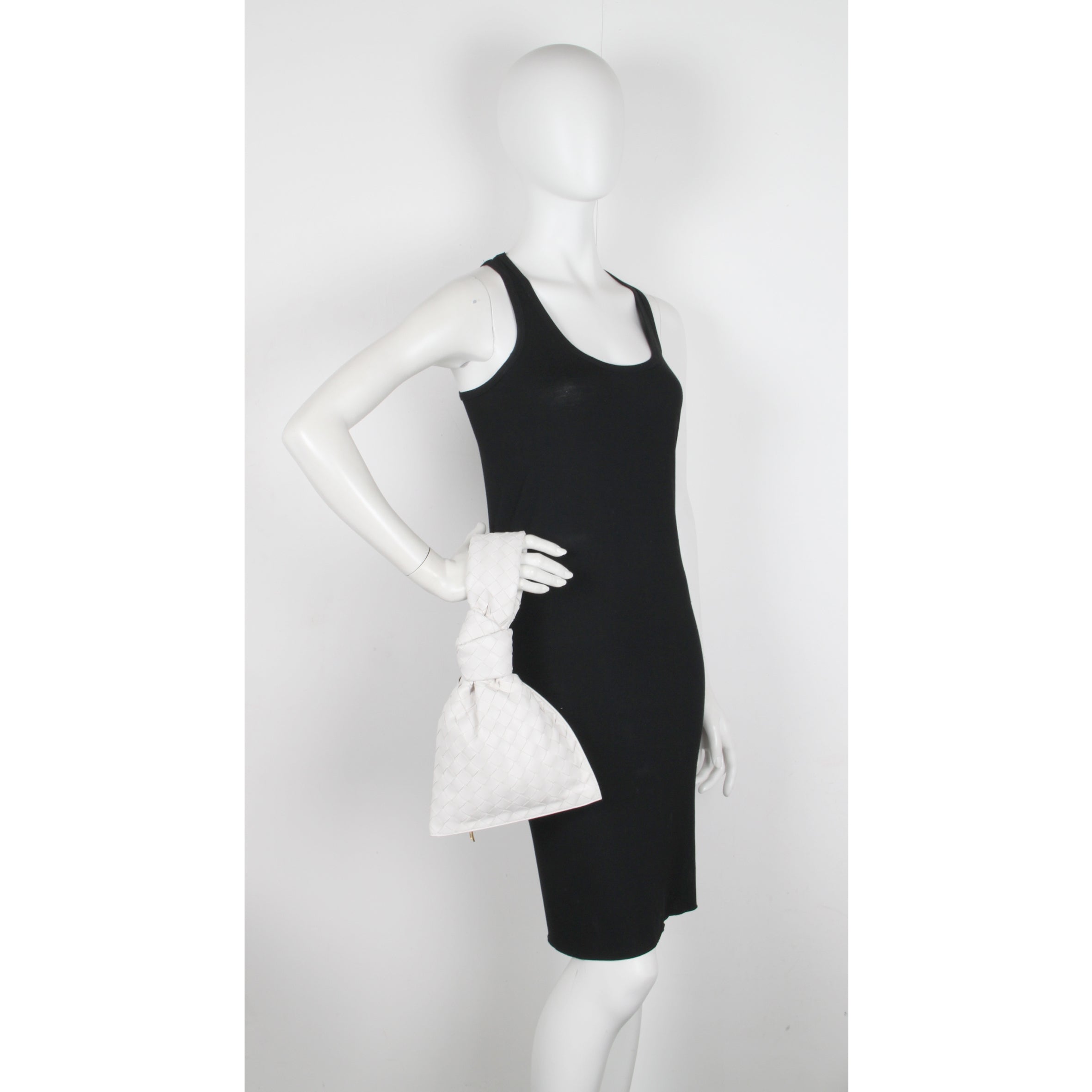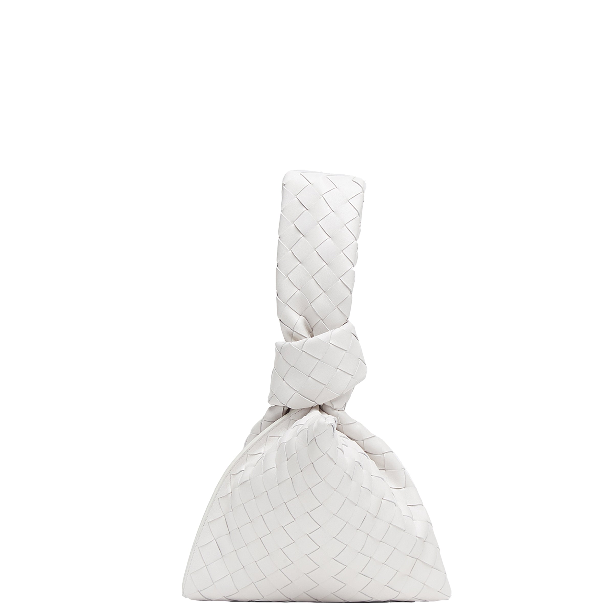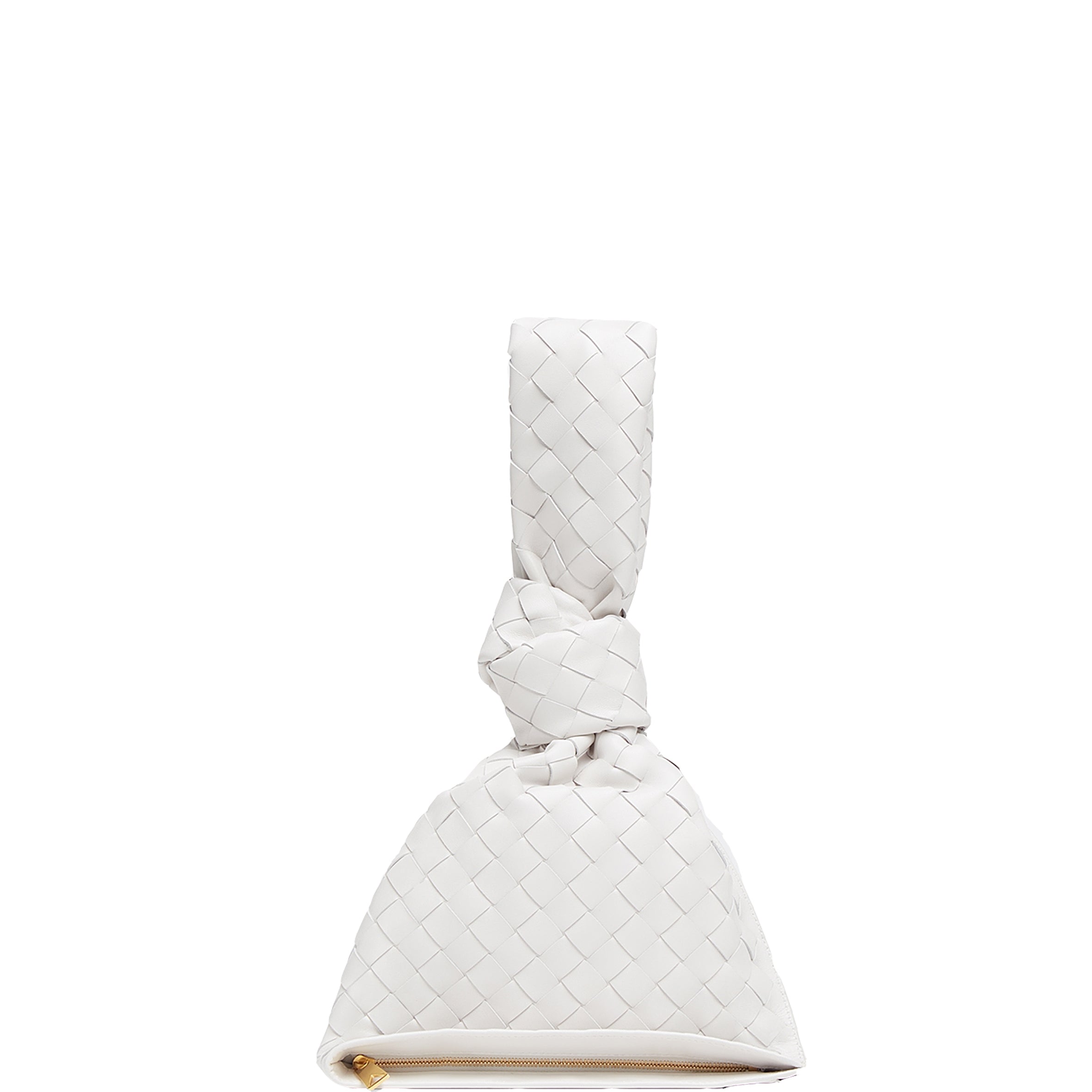 Soft clutch with knotted handle in Intrecciato Nappa leather. Features one main compartment, a zip closure at base and a light calf leather interior.