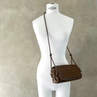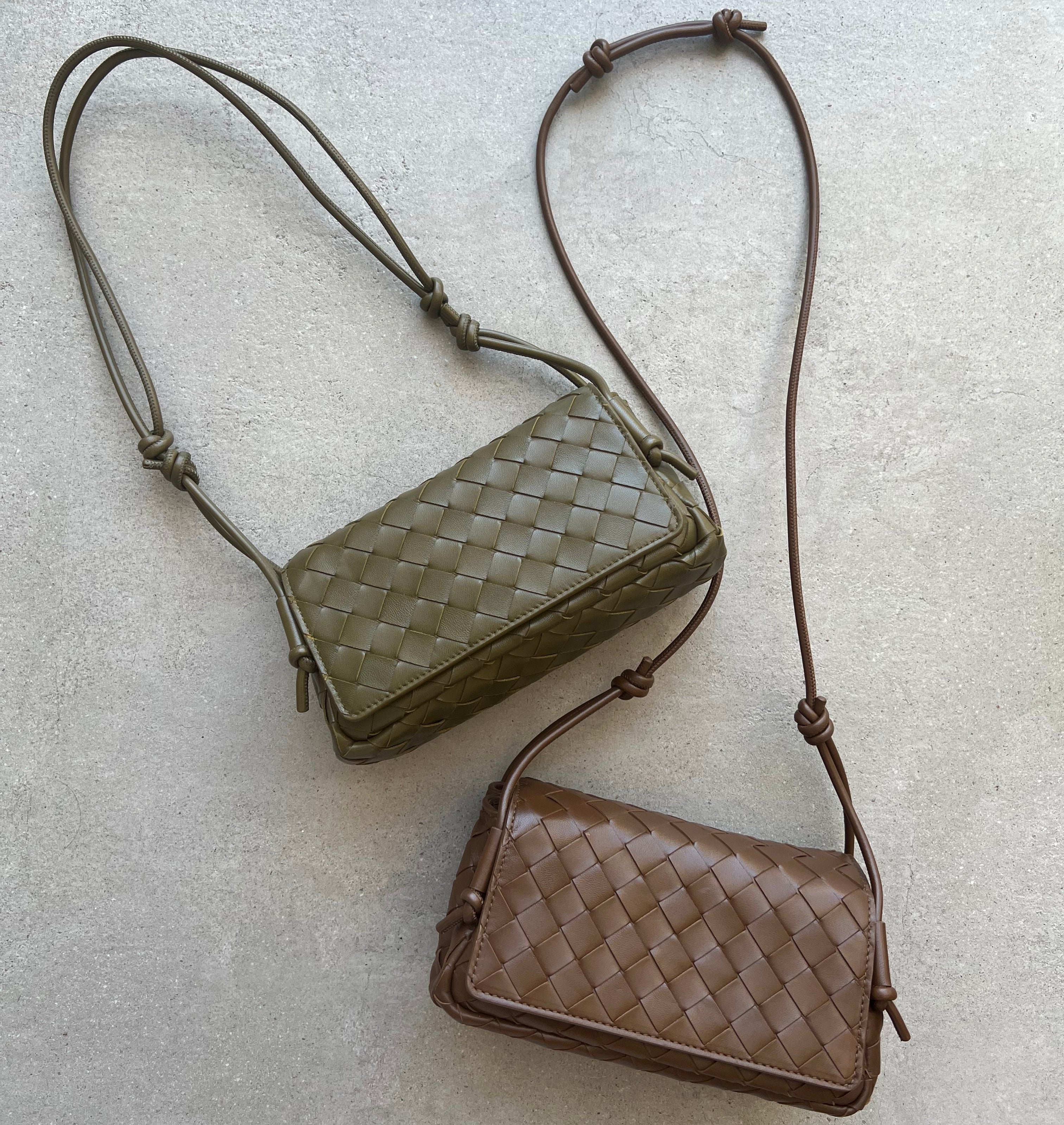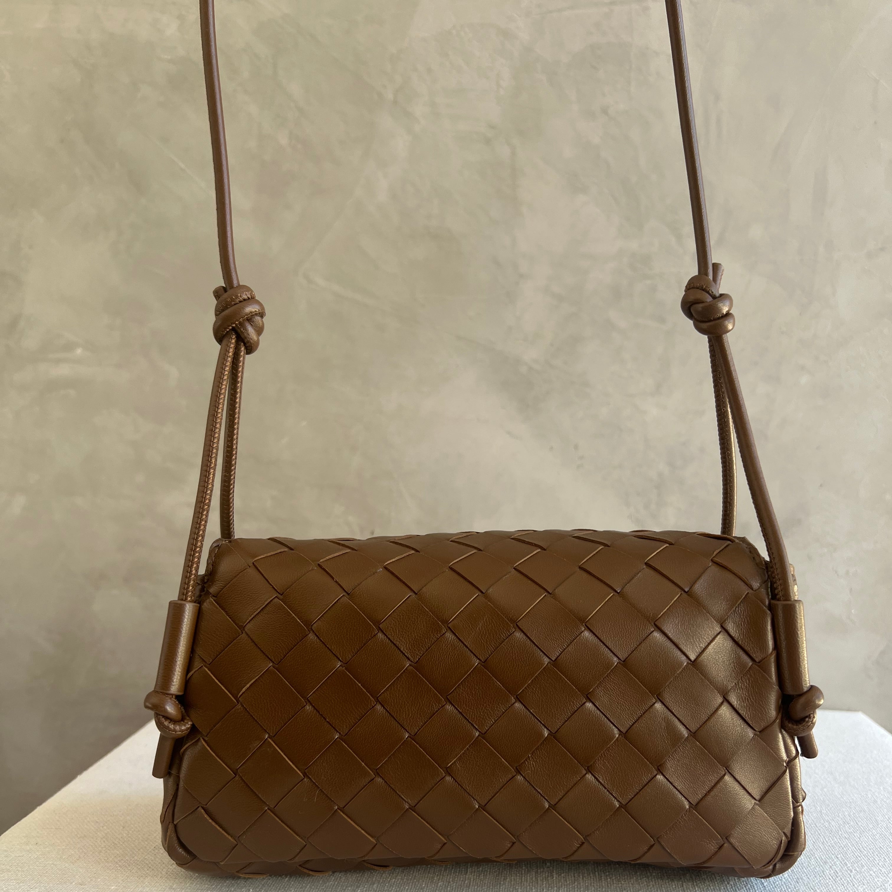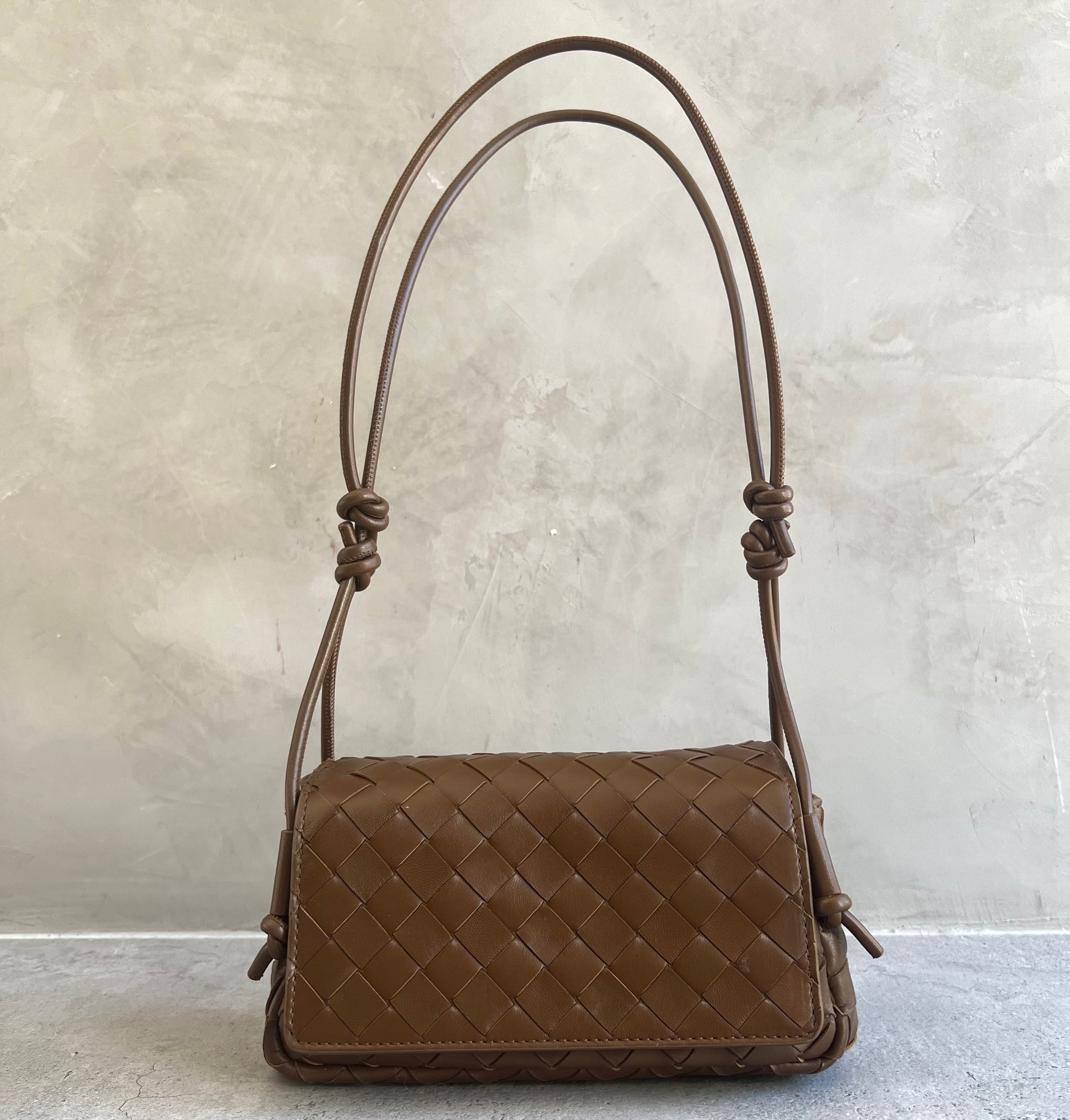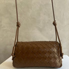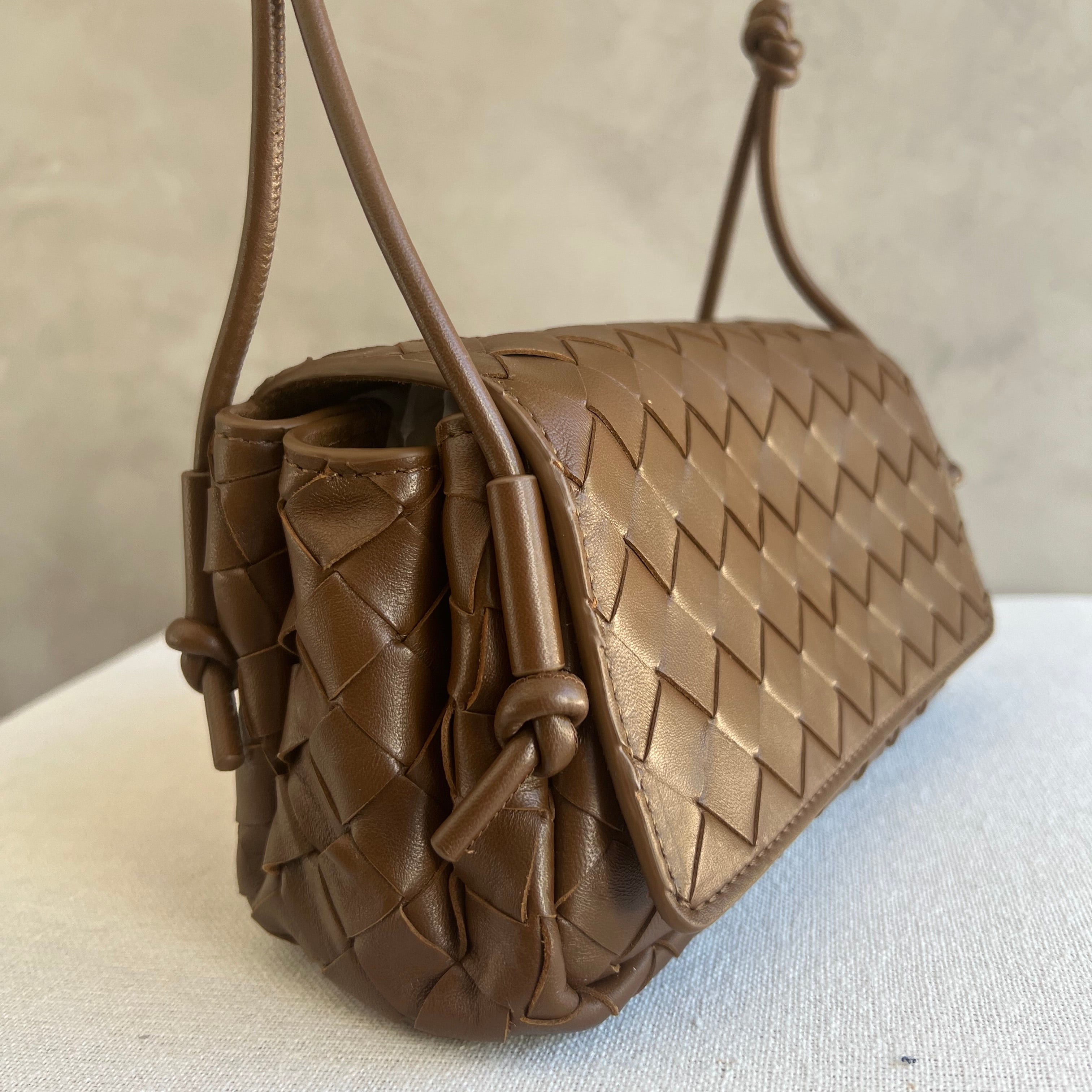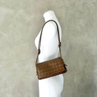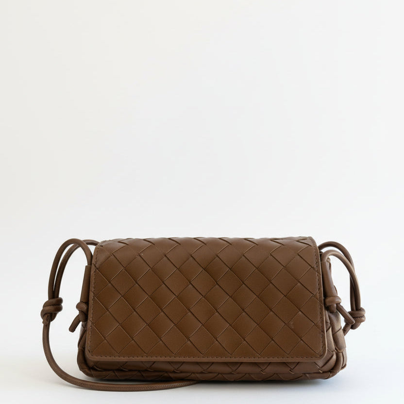 Pouch in Intrecciato nappa leather with adjustable tubular strap featuring sliding knot details.