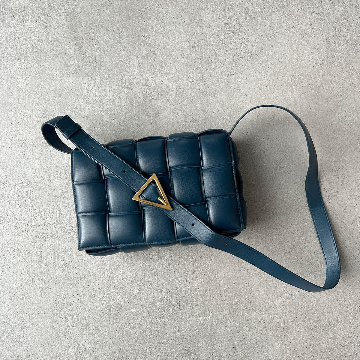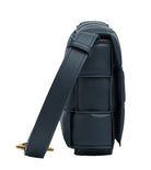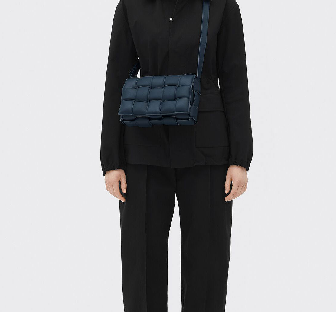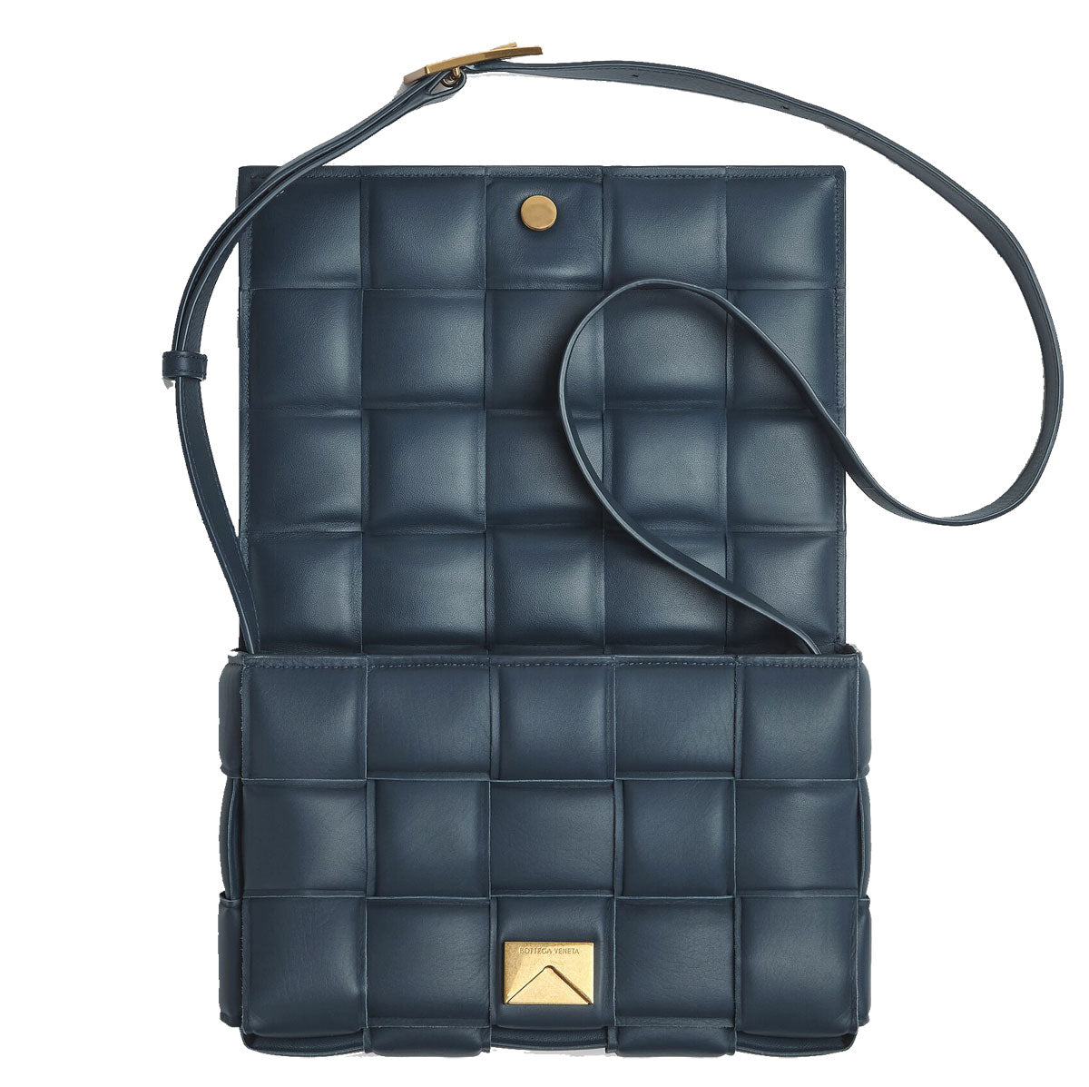 Crossbody bag in a double-face maxi weave. Made with wide double-face Nappa strips in an orthogonal weave. Interior is identical to exterior; fitted with a zipped pocket and magnetic closure. Adjustable shoulder strap folds inside the bag to carry as a clutch.