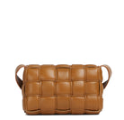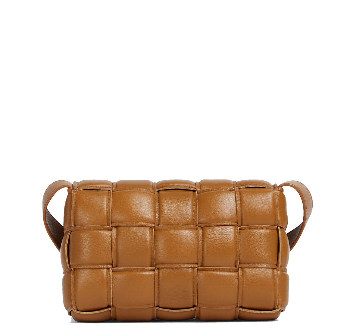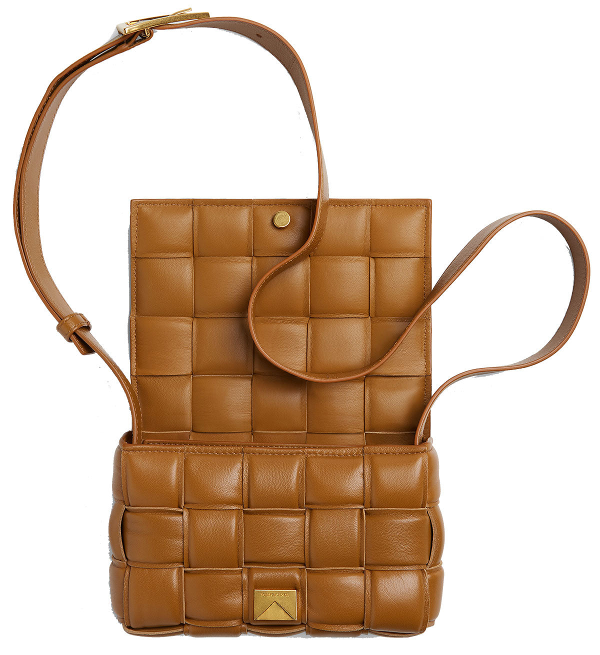 Crossbody bag in a double-face maxi weave. Made with wide double-face Nappa strips in an orthogonal weave. Interior is identical to exterior; fitted with a zipped pocket and magnetic closure. Adjustable shoulder strap folds inside the bag to carry as a clutch.
