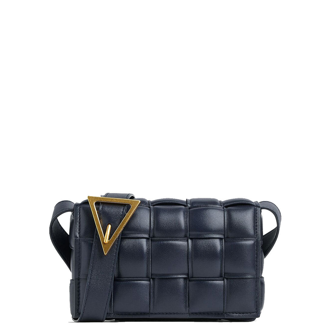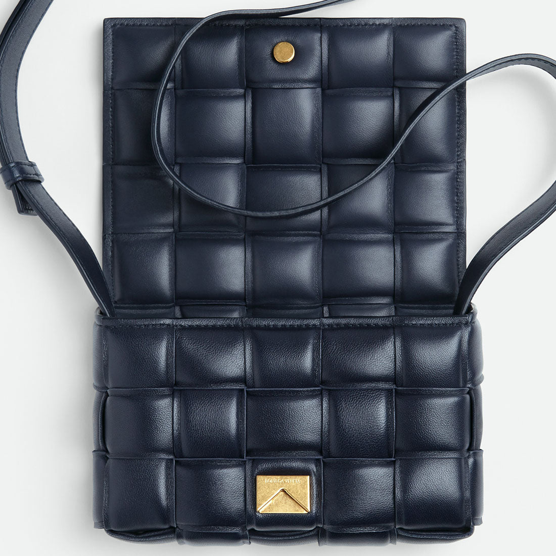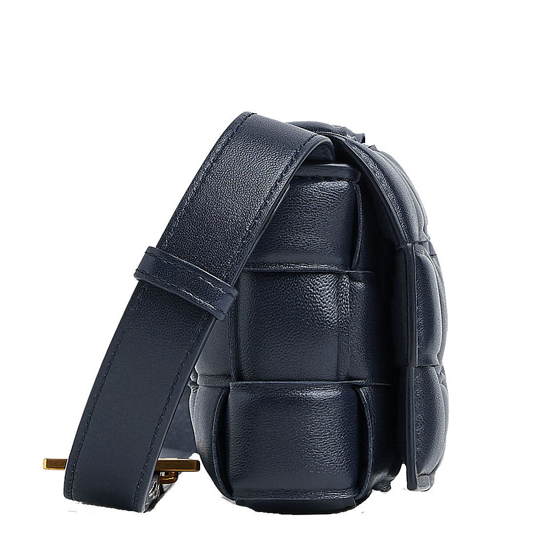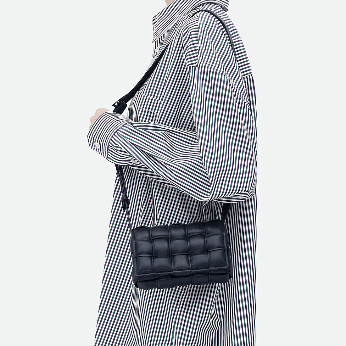 Crossbody bag in a double-face maxi weave. Made with wide double-face Nappa strips in an orthogonal weave. Interior is identical to exterior; fitted with a zipped pocket and magnetic closure. Adjustable shoulder strap folds inside the bag to carry as a clutch.