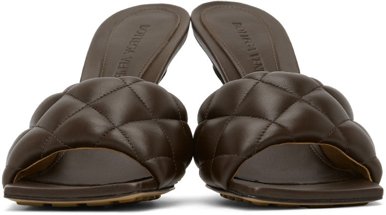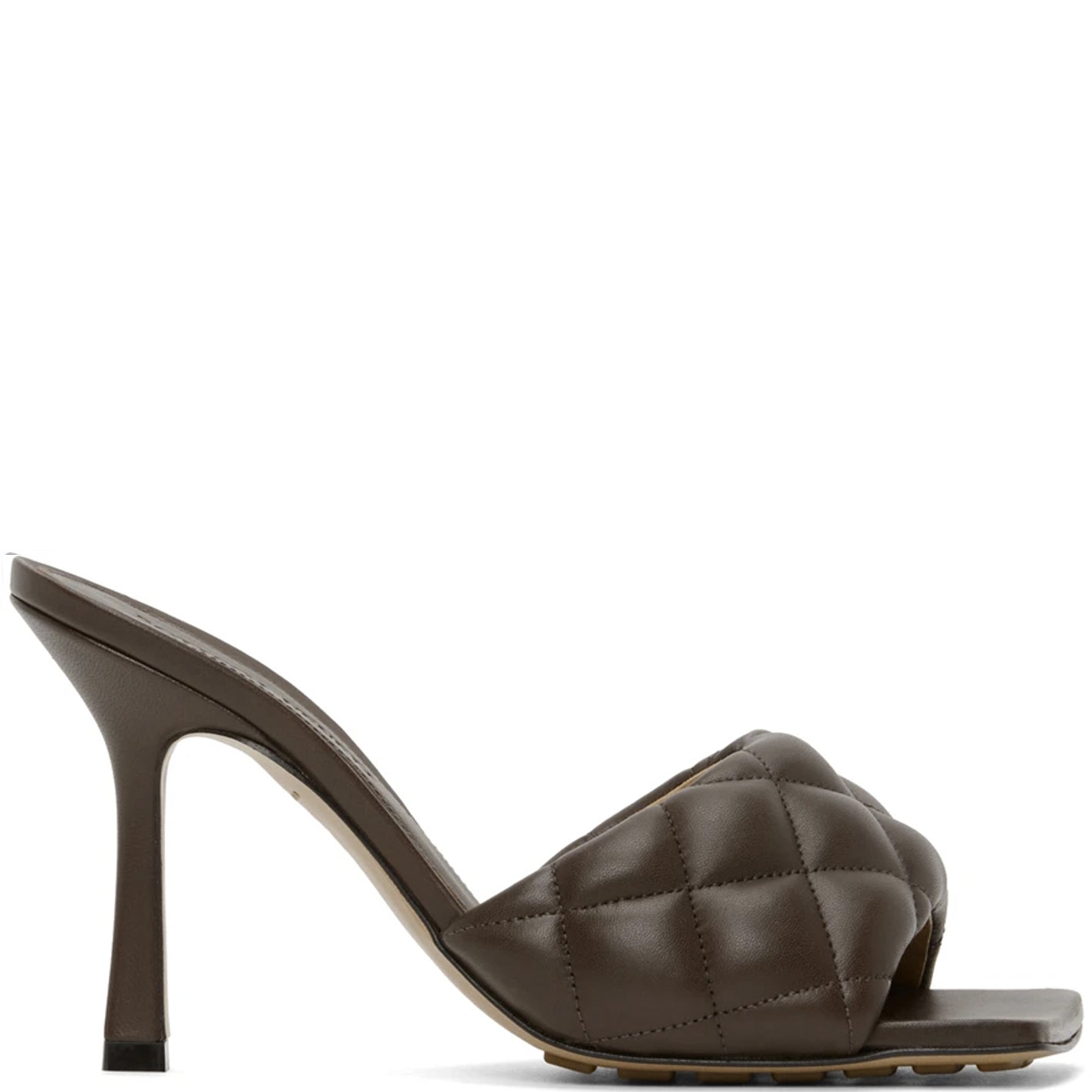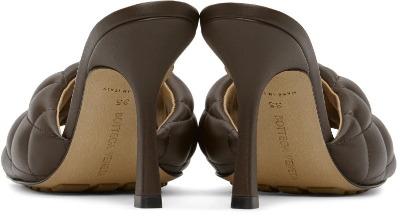 Quilted mules with exceptionally soft nappa leather. Squared sole designed to extend beyond the foot. Leather covered stiletto heel.