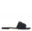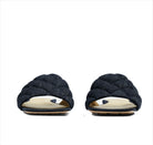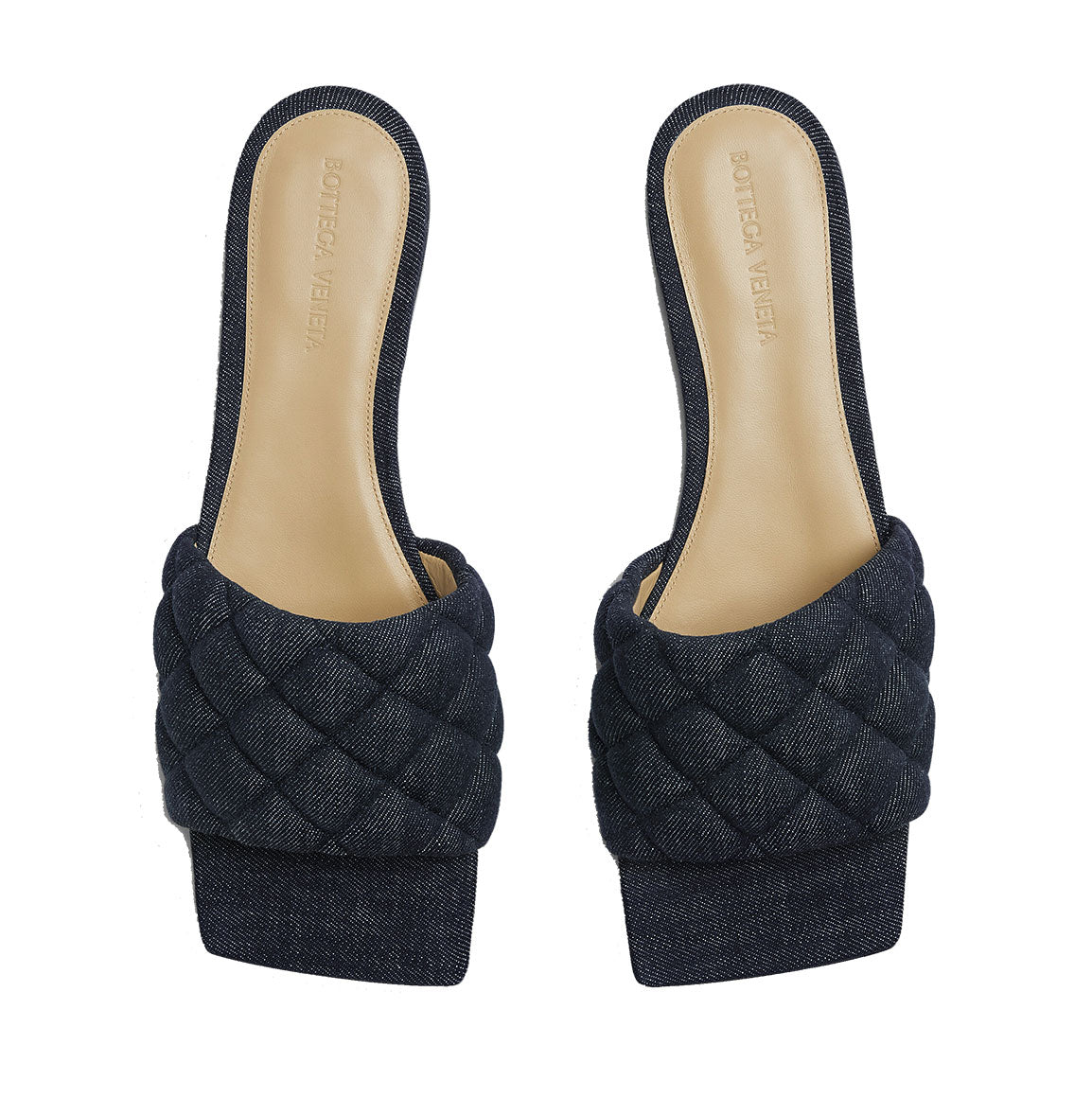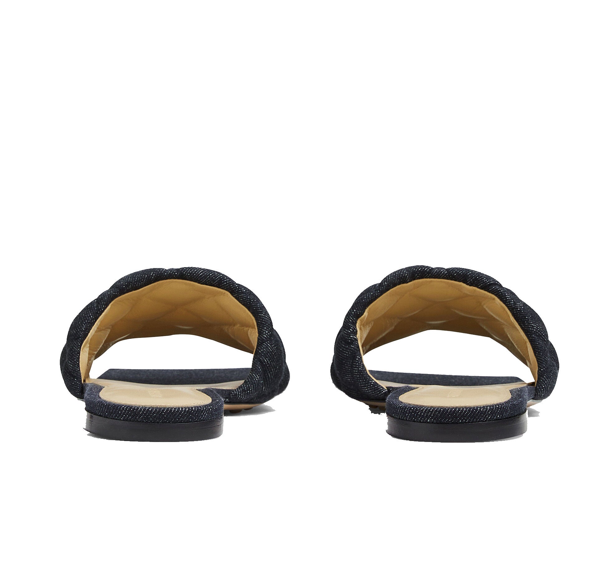 Quilted slides with indigo denim. Squared sole designed to extend beyond the foot. Rubber injected leather outsole.