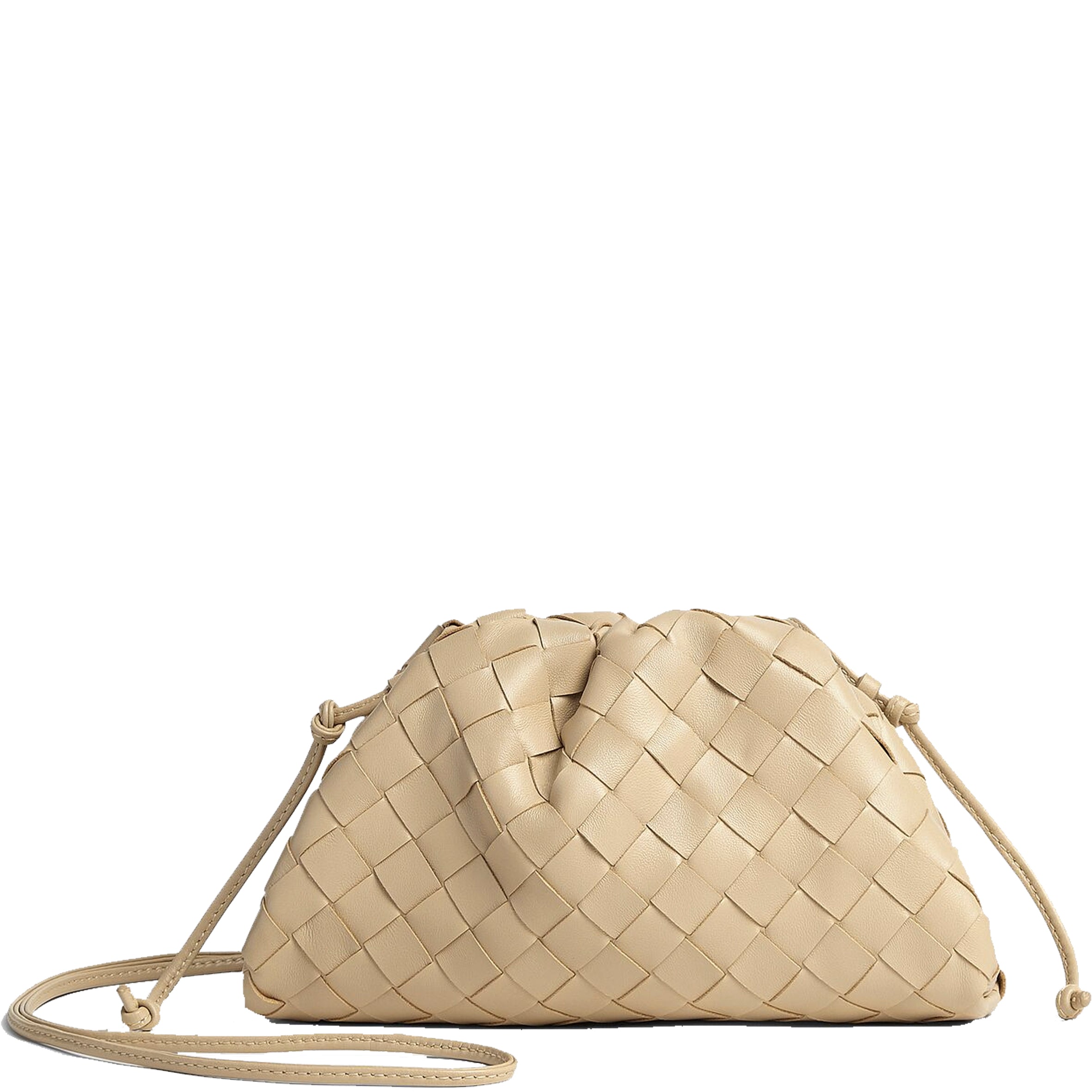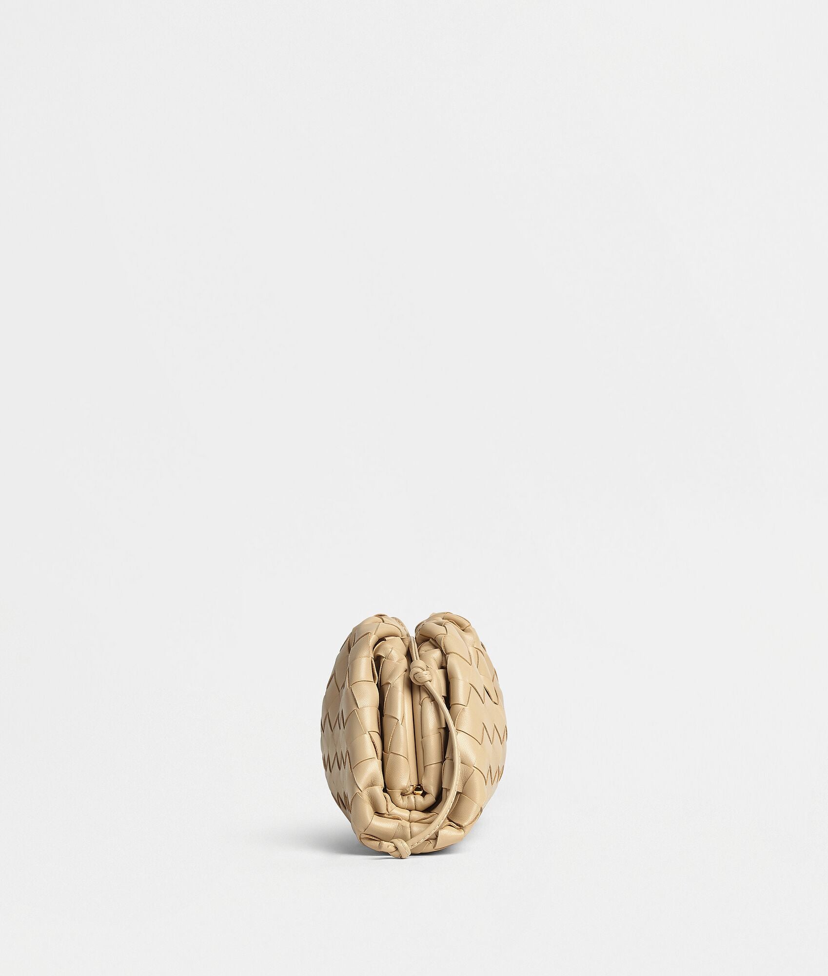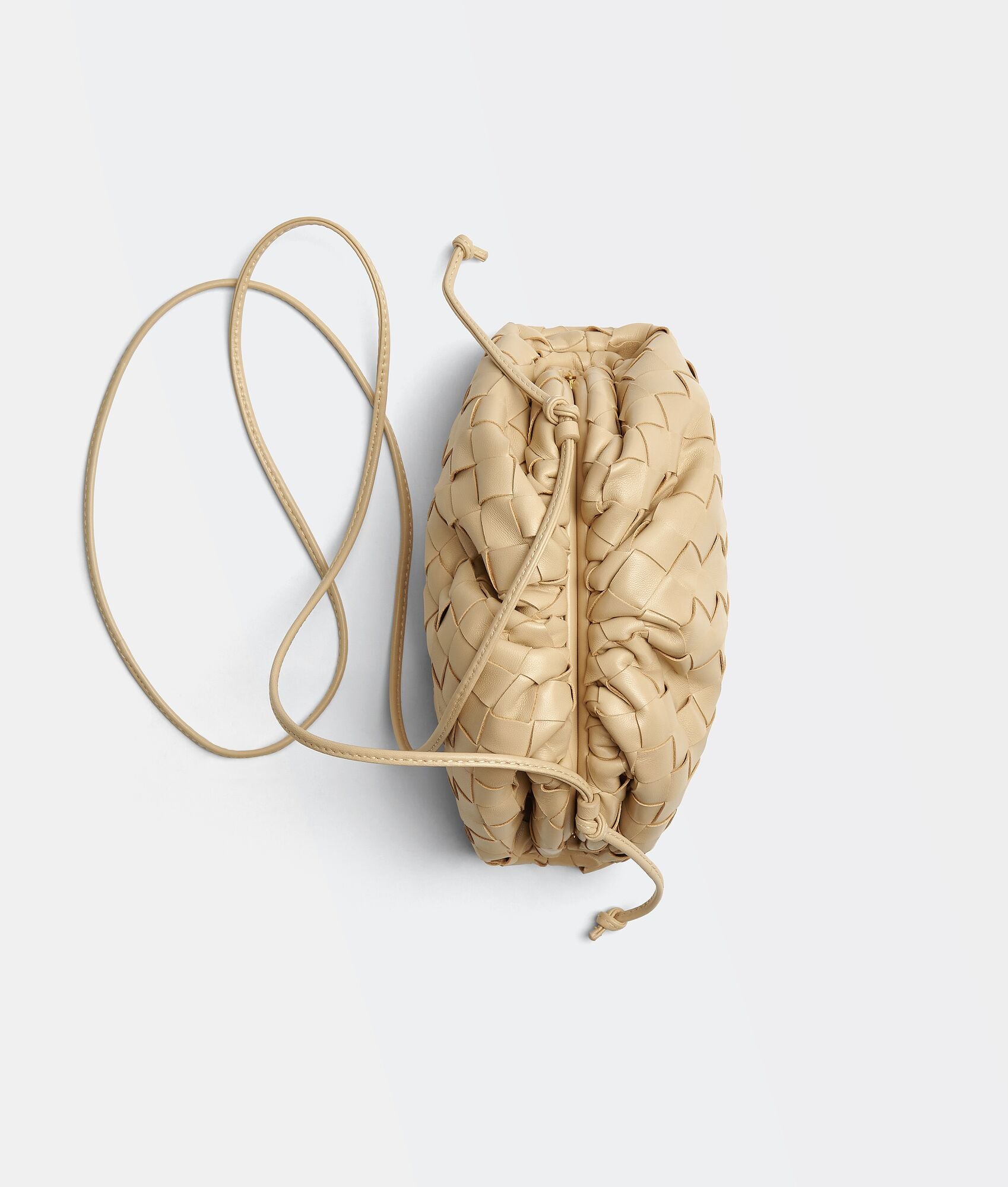 Soft voluminous clutch in woven leather. Magnetic frame covered in folds of handwoven leather. Iconic intrecciato weave in a subtly amplified new dimension. Single compartment lined in nappa. Slim leather shoulder strap. Smaller style of The Pouch, a brand icon that reflects Bottega Veneta’s heritage with a modern attitude.