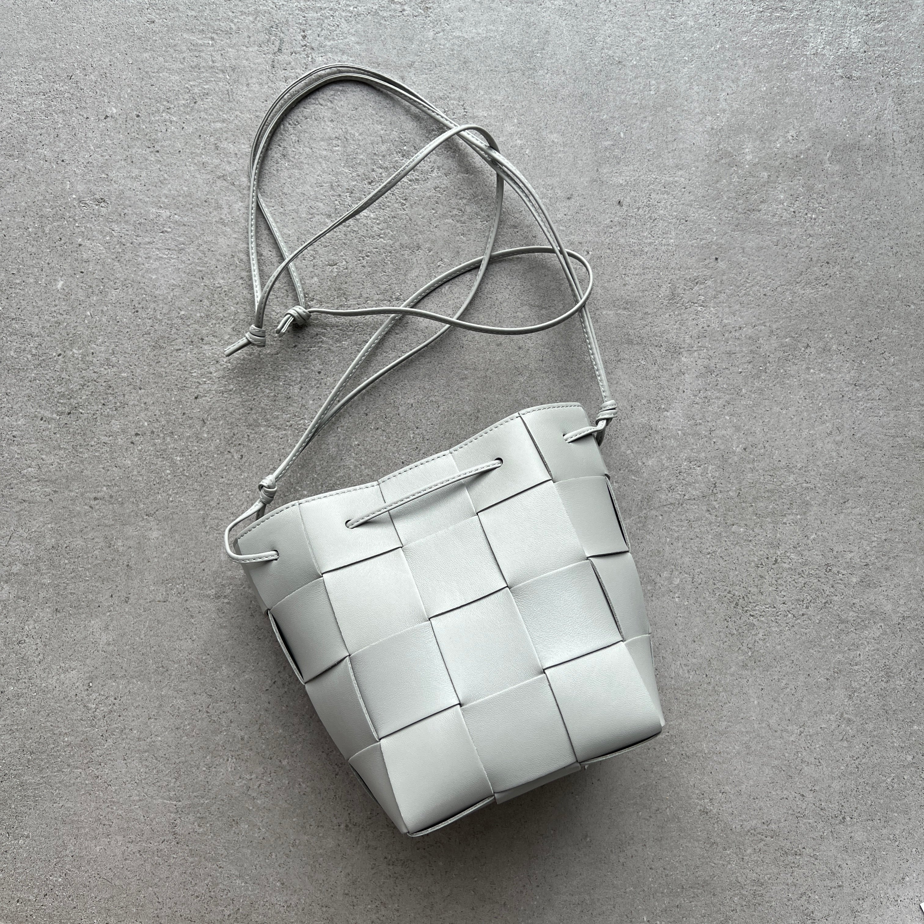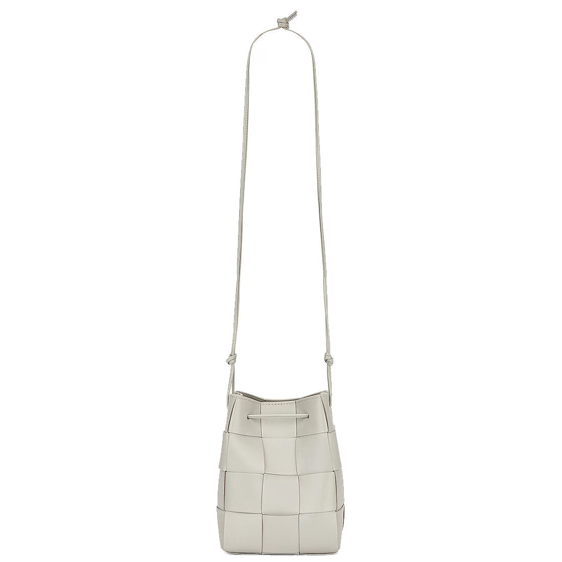 Bottega Veneta's signature Loop Mini bag is now available in their cassette weave. This crossbody bag has a soft edge bucket shape crafted from lamb leather and bonded lambskin lining.