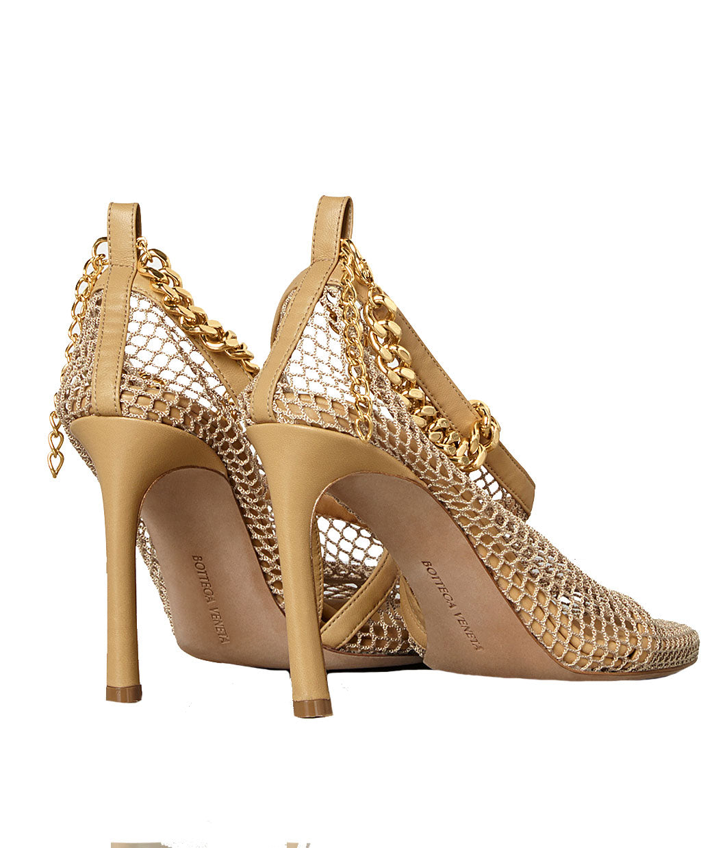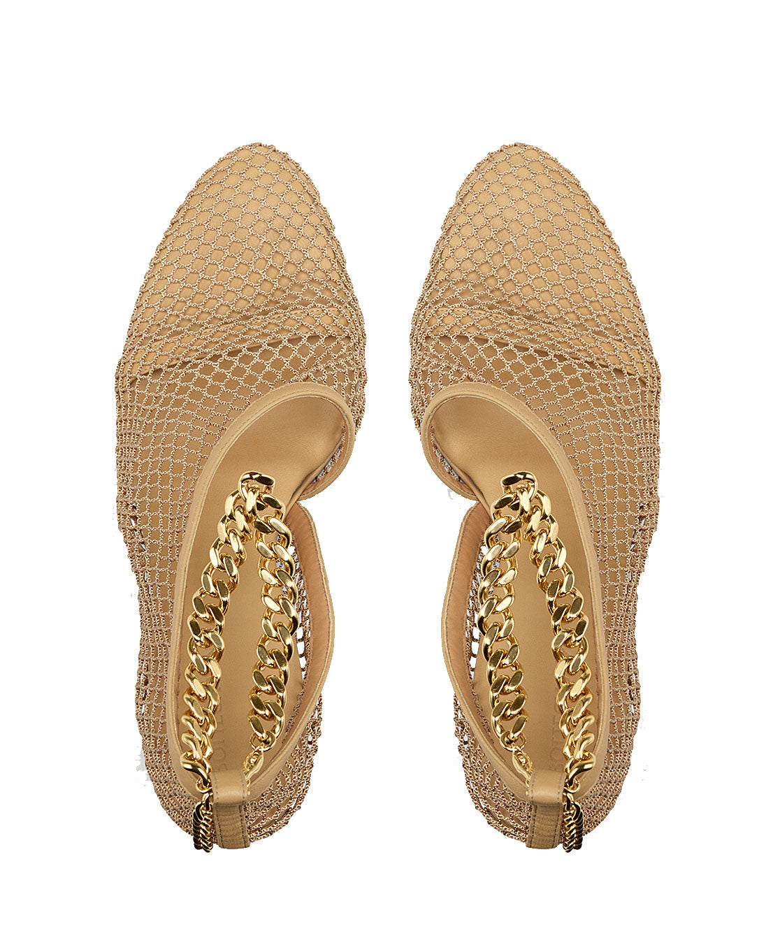 Single strap over the foot with a leather trimmed mesh D'Orsay layer. Chunky gold-finish chain threaded through back loop, pointed toe and stiletto heel. Rubber-injected leather sole for comfort and stability