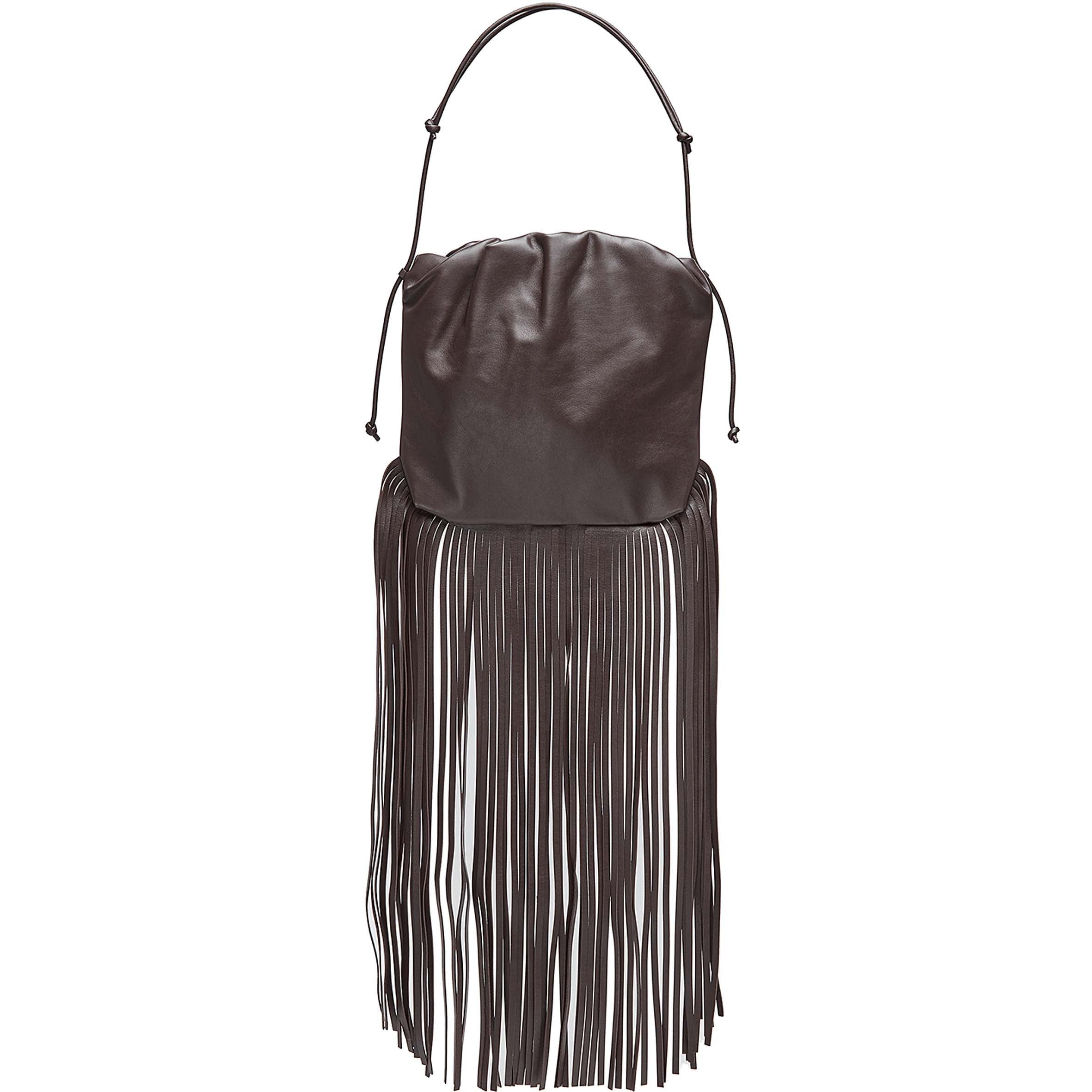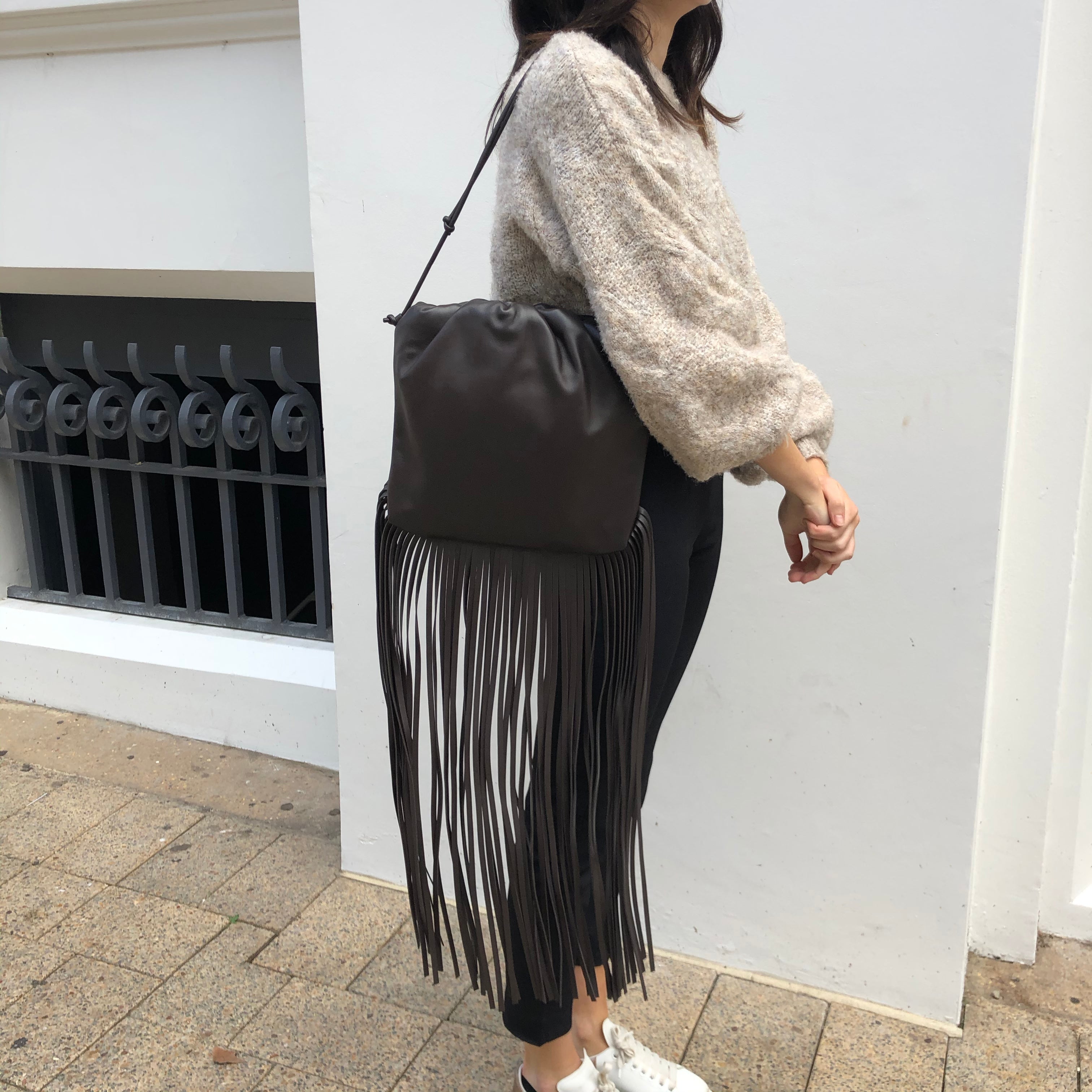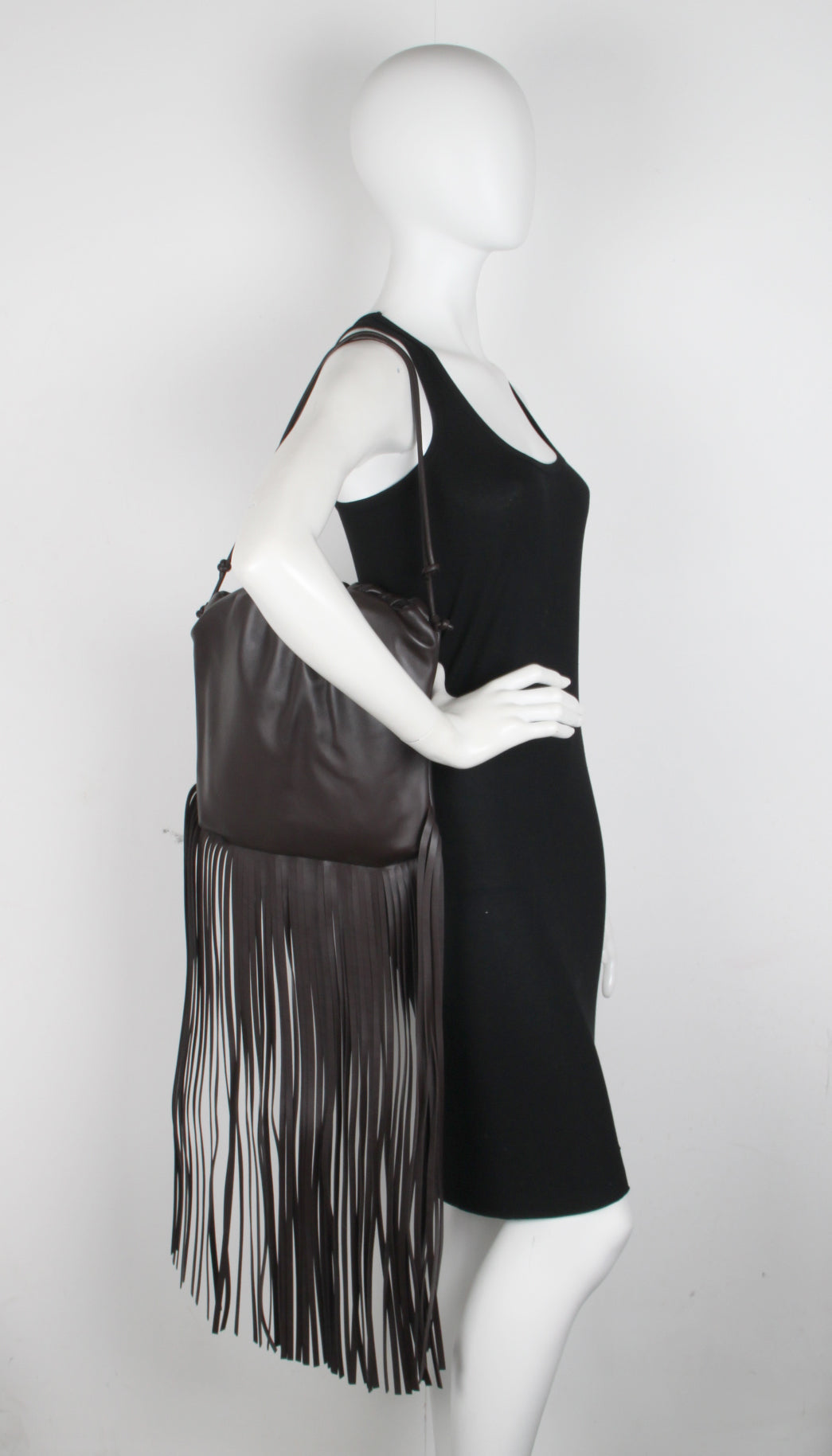A fringed pouch bag with an adjustable knotted leather strap and frame closure.