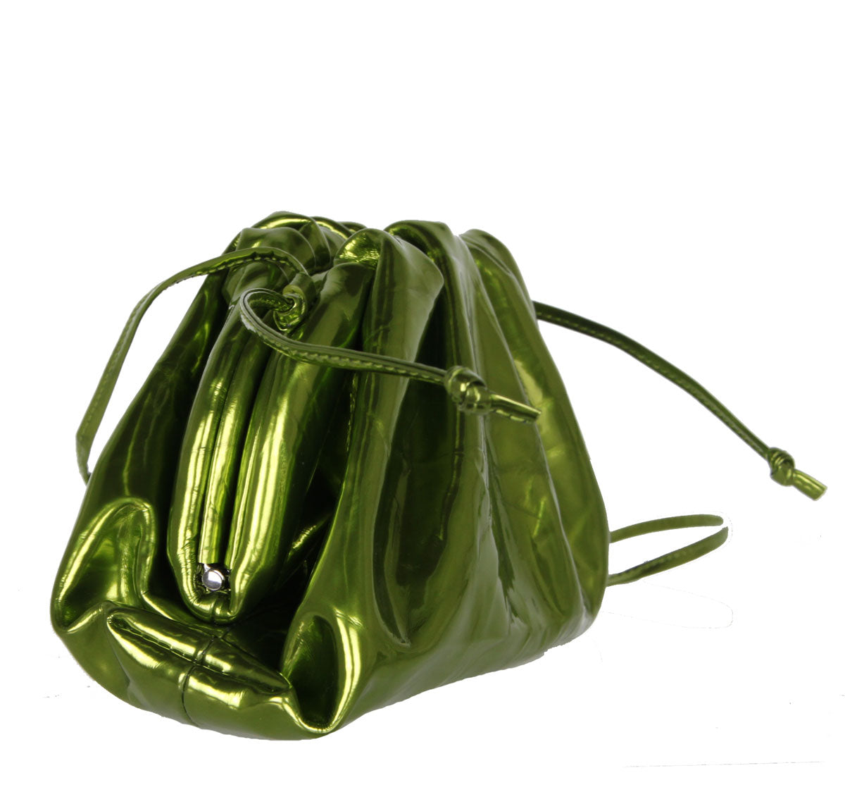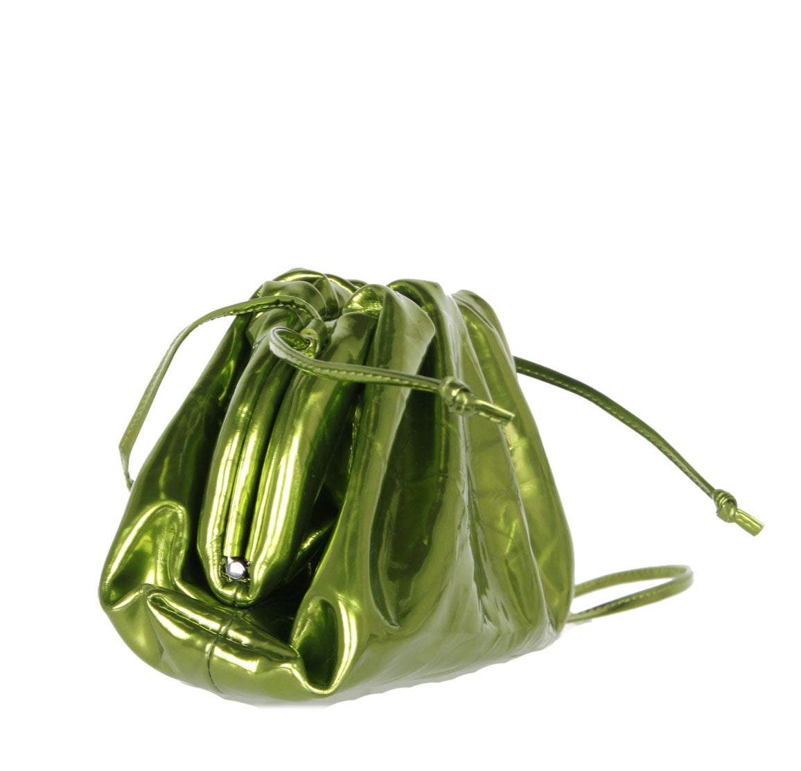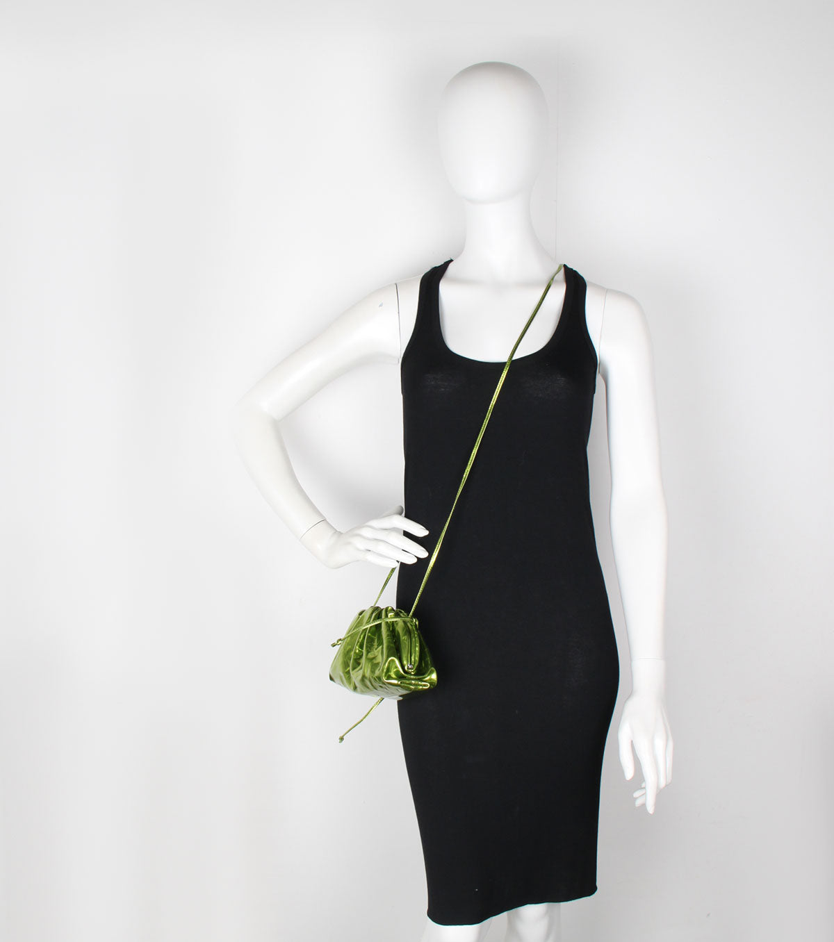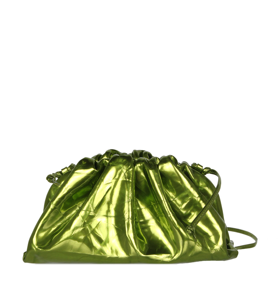Soft voluminous clutch in metallic coated calfskin. Magnetic frame covered in folds of shiny calfskin. Single compartment lined in shiny calfskin. Slim leather shoulder strap. Smaller style of The Pouch, a brand icon that reflects Bottega Veneta’s heritage with a modern attitude.
