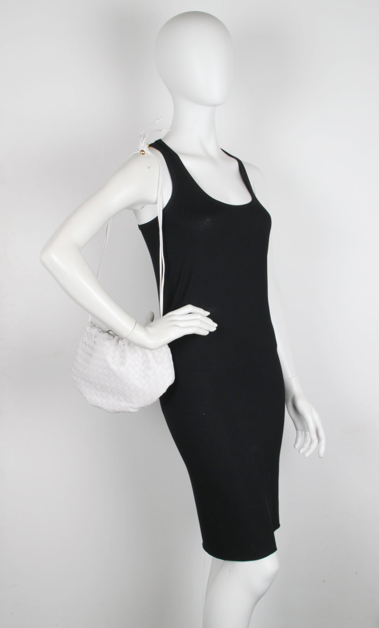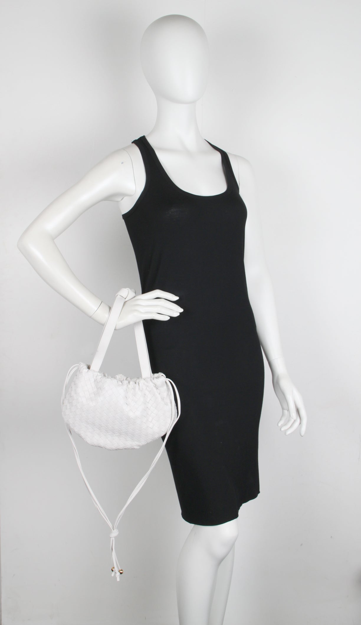 Drawstring bag in Intrecciato Nappa. Features an adjustable shoulder strap, removable handles attached with concealed buttons, and leather drawstring fastening embellished with metal globes.