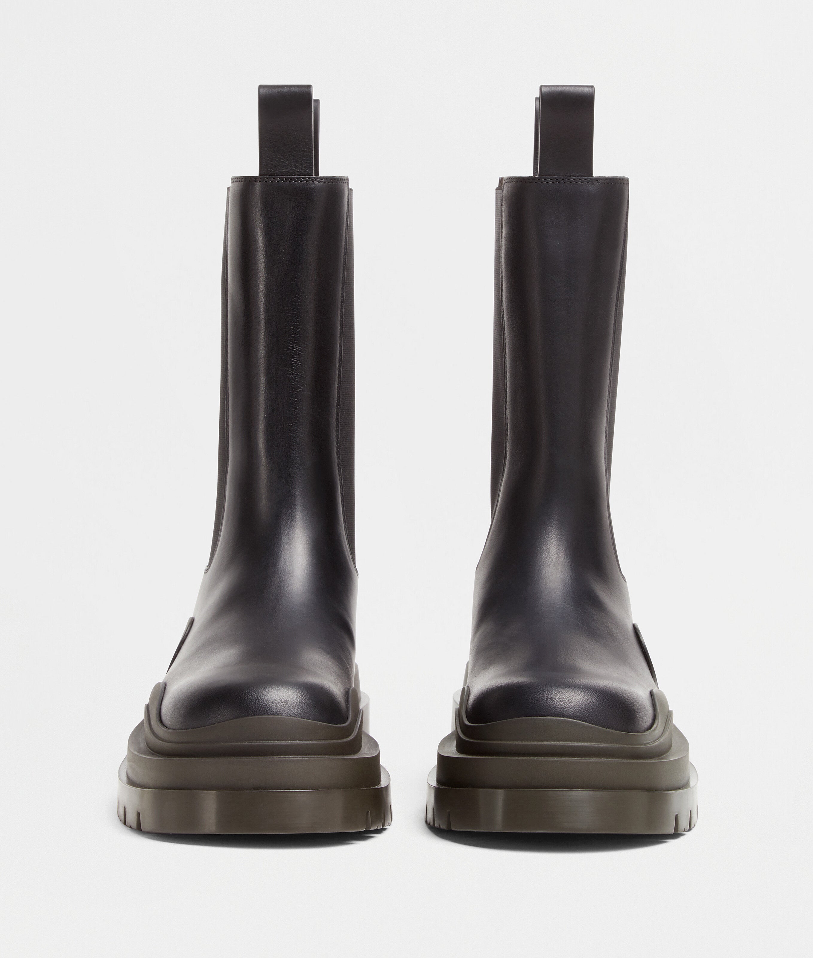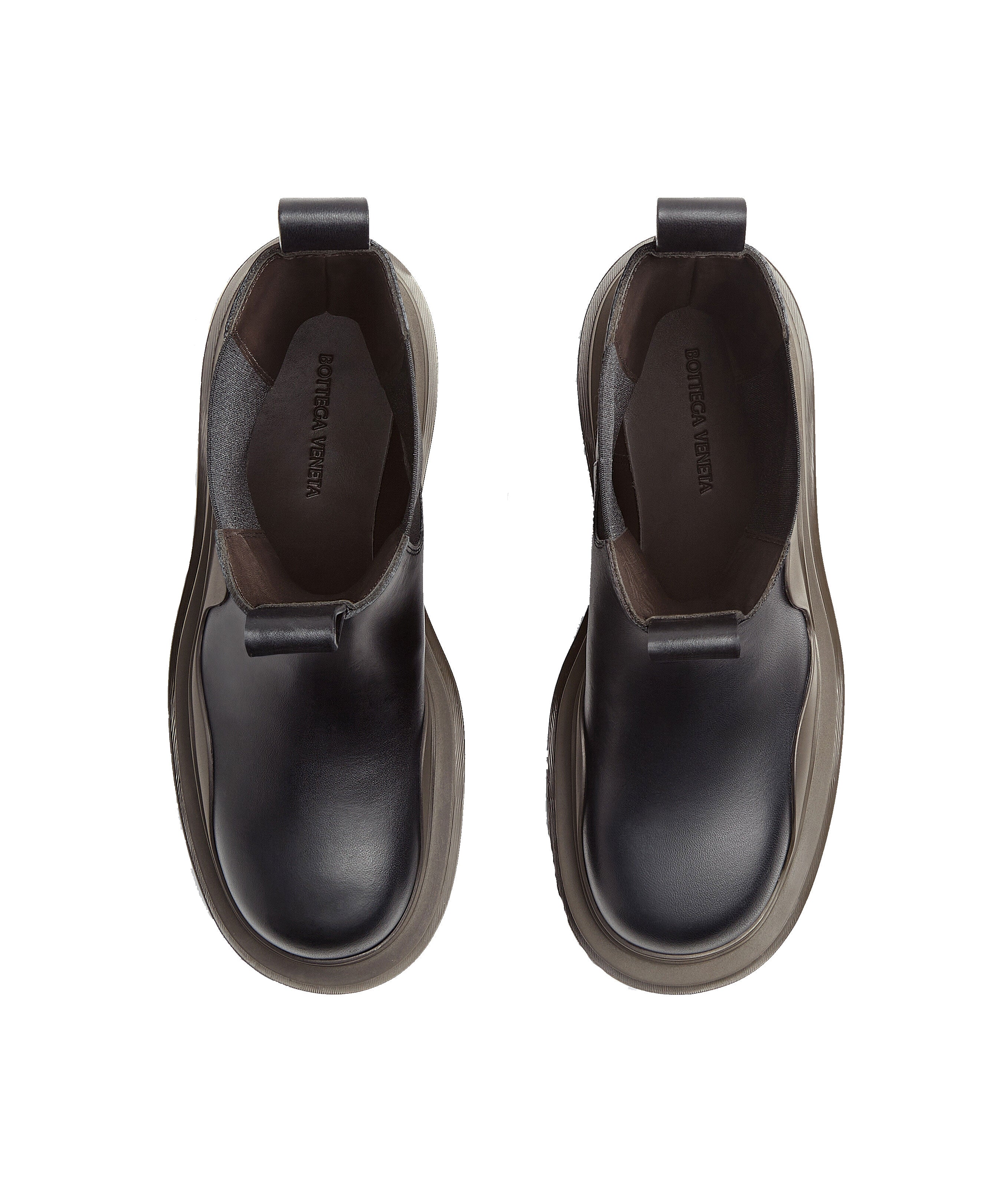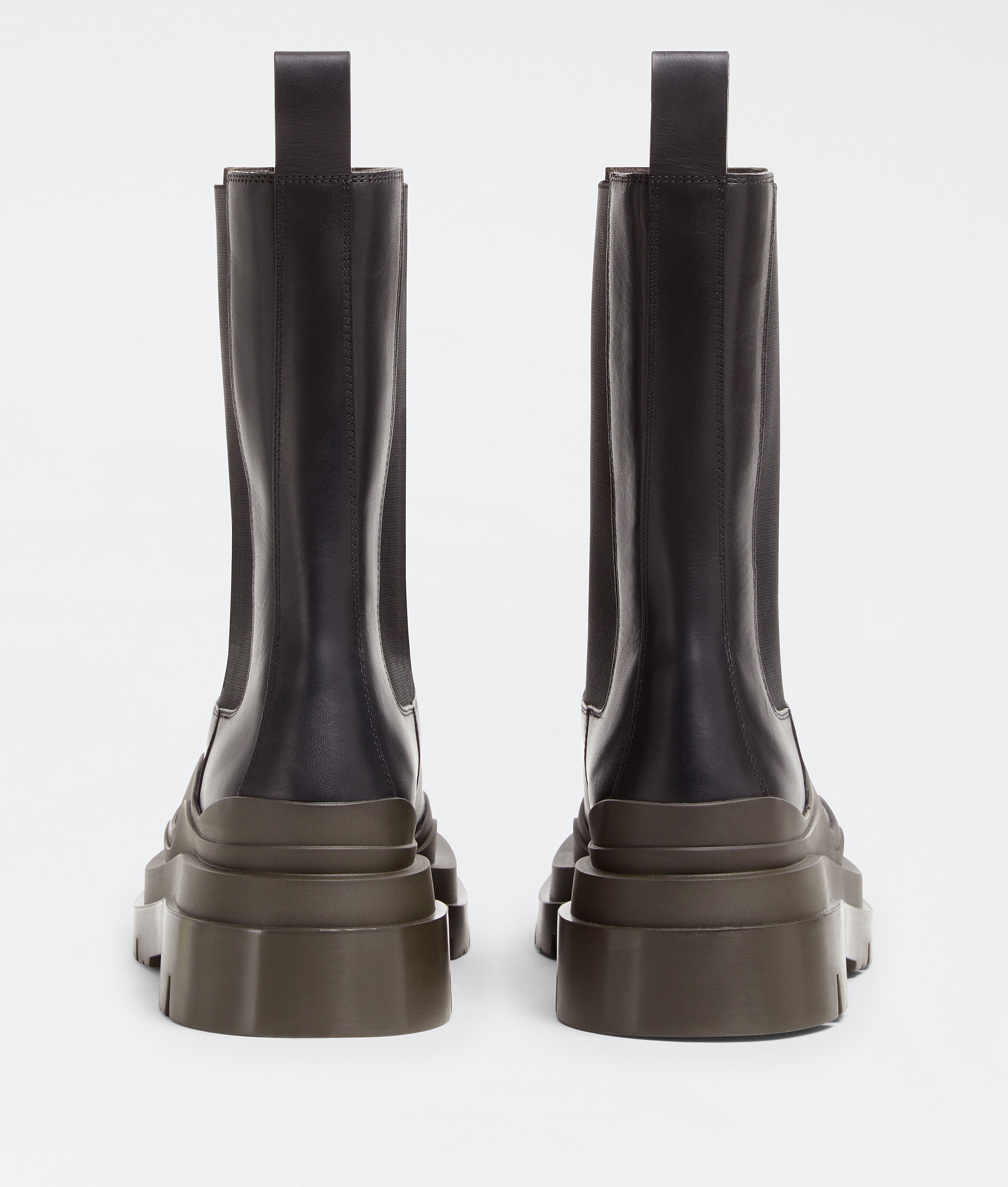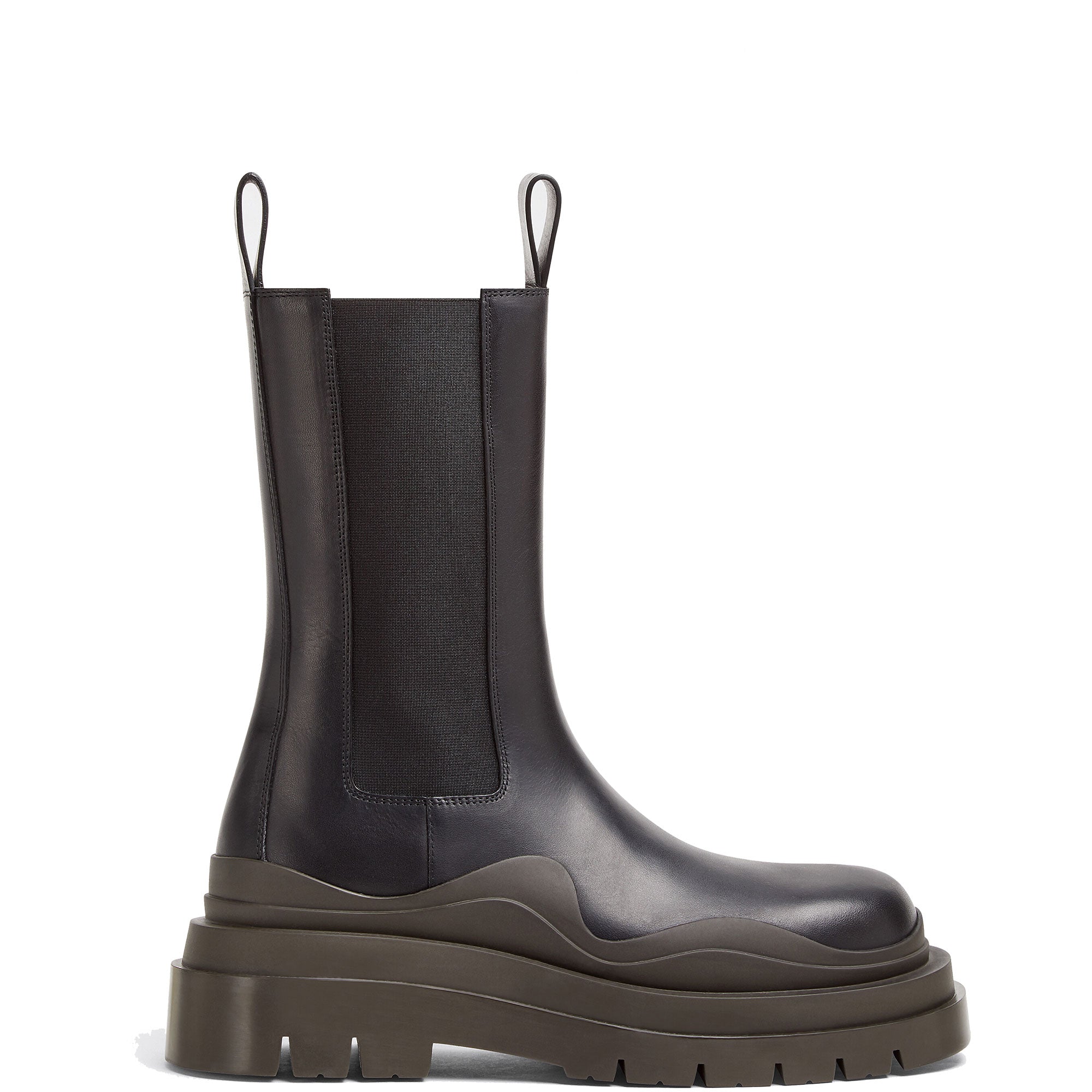 A mid-calf boots with a waved sole in the style of a classic Chelsea leather boot. Featuring elasticated side panels and a rubber sole. They're crafted in Italy and finished with pull tabs at the front and back.