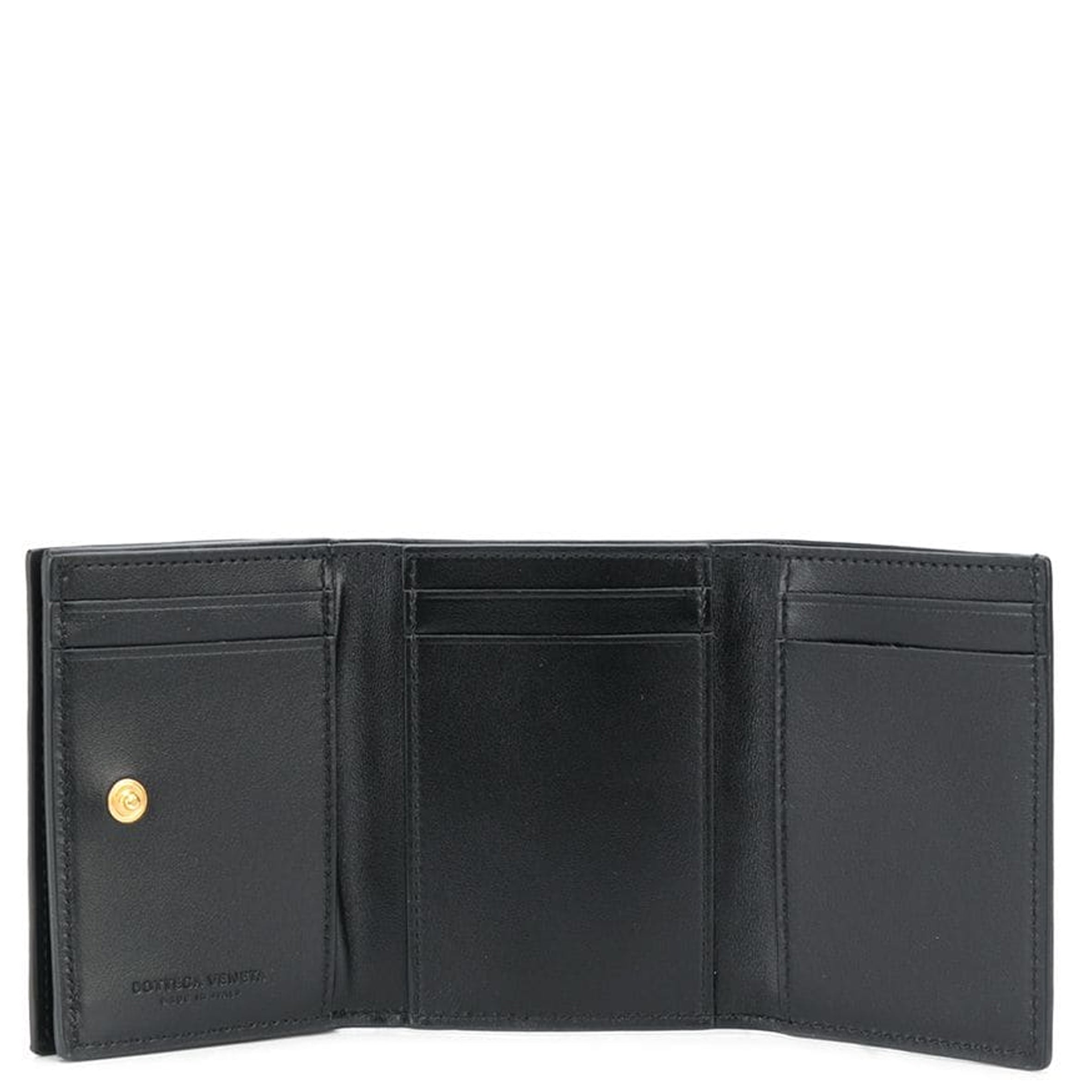 A mini tri-fold wallet in intrecciato leather with six card slots, one bill compartment and exterior coin pocket. Press-stud fastening.