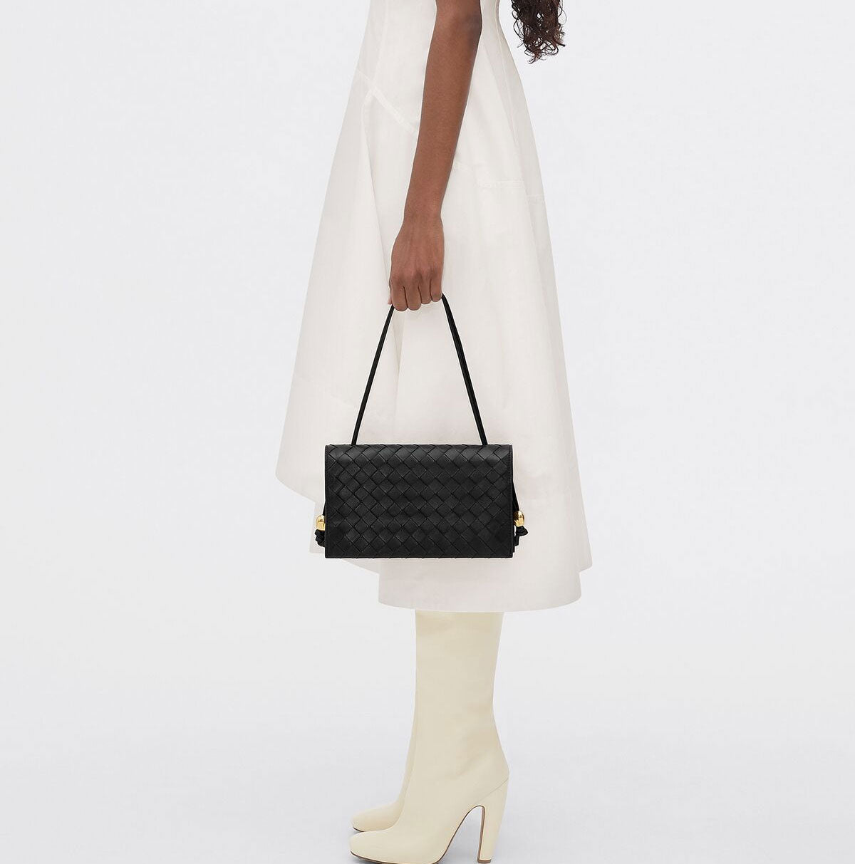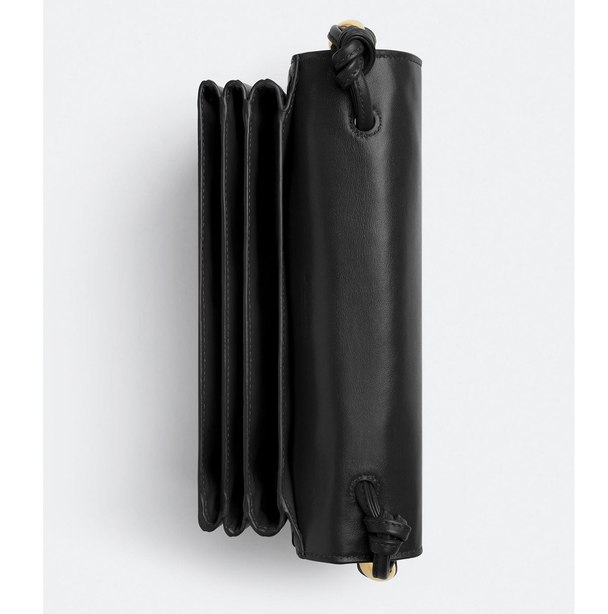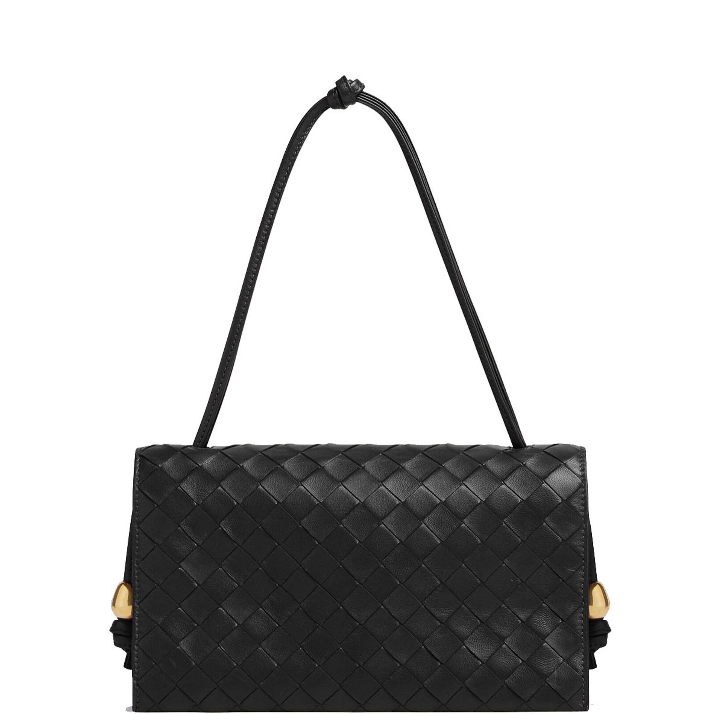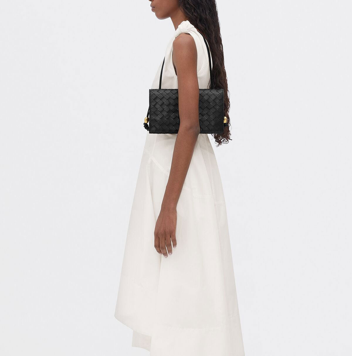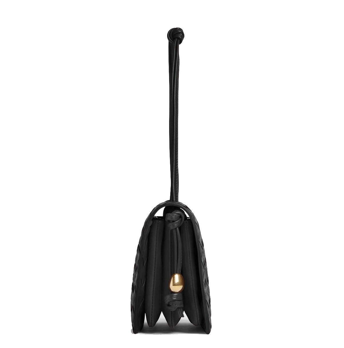 Bottega Veneta Triple short shoulder bag woven in mini intrecciato. Made from soft lambskin with calfskin lining. Features three compartments with one additional pocket and a magnetic closure. Finished with gold tone spheres and leather knots on each side.