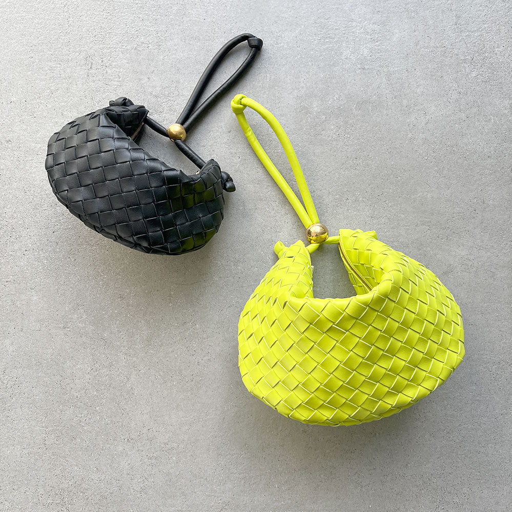 Leather pouch in Intrecciato Nappa. Features an adjustable shoulder strap with a zip closure and single bonded suede lined interior compartment, embellished with gold tone metal globe. Can be worn on the shoulder or carried by hand.