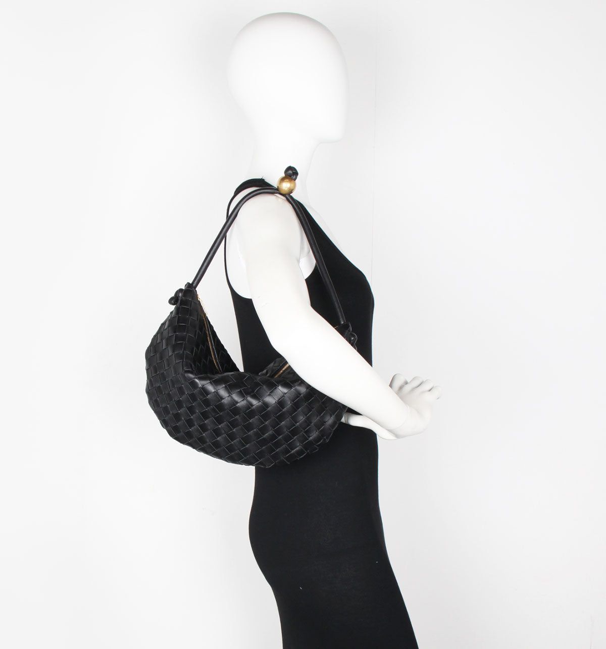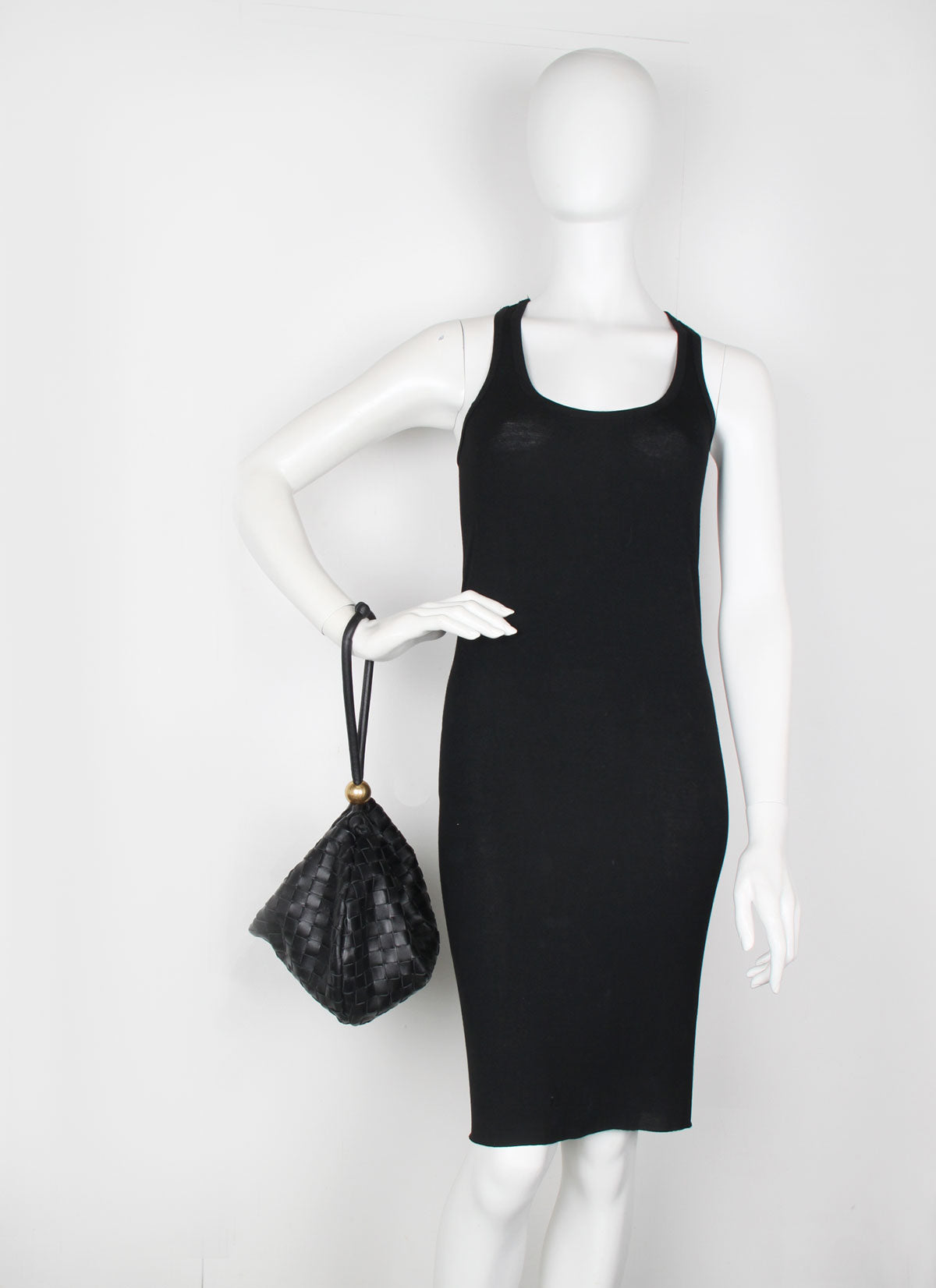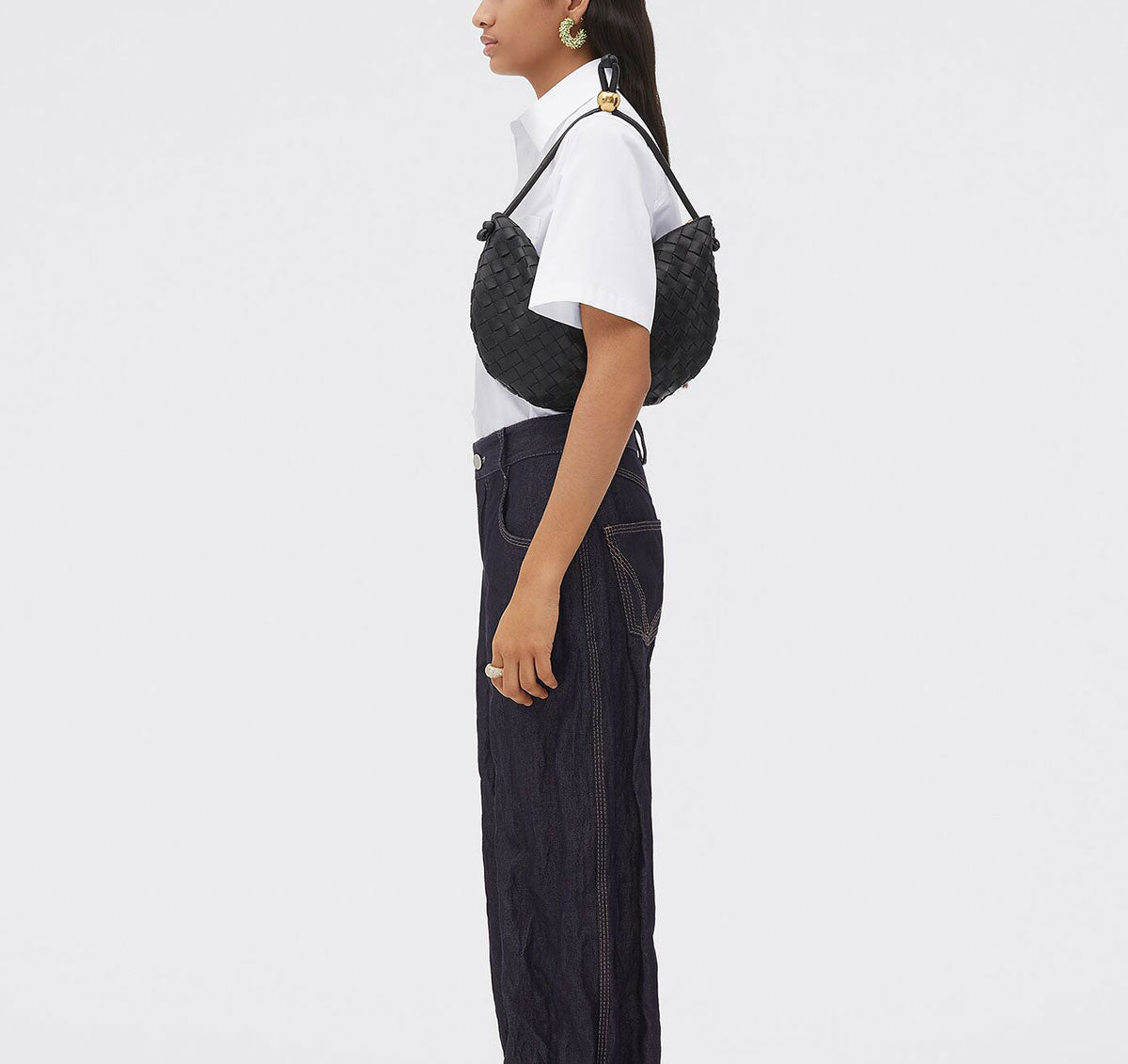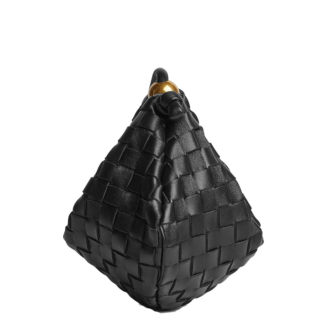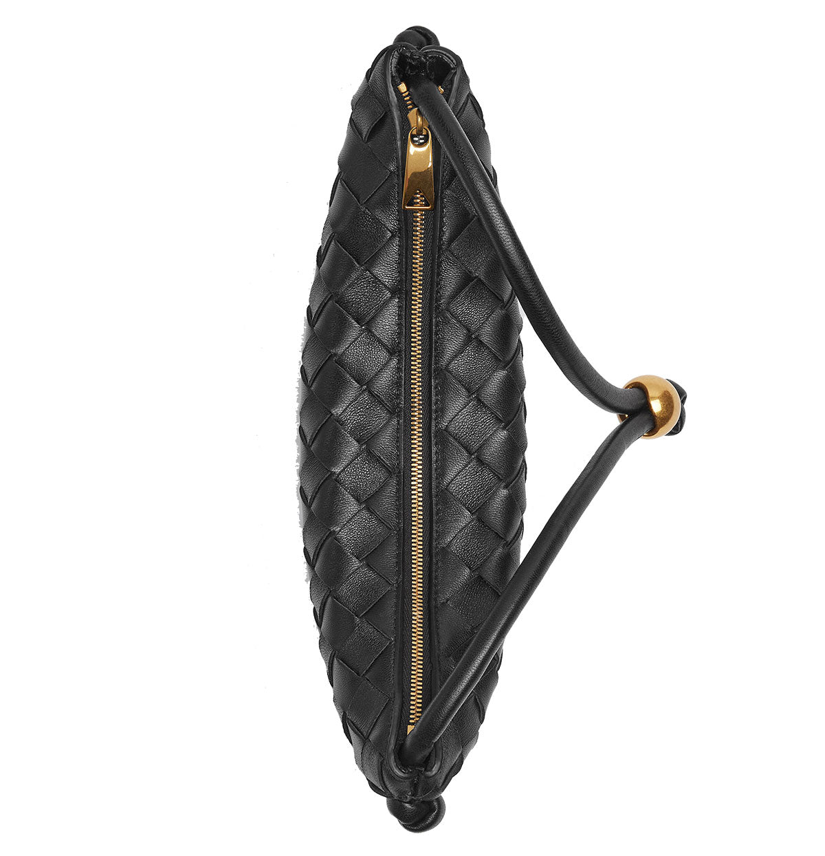 Leather pouch in Intrecciato Nappa. Features an adjustable shoulder strap with a zip closure and single bonded suede lined interior compartment, embellished with gold tone metal globe. Can be worn on the shoulder or carried by hand.