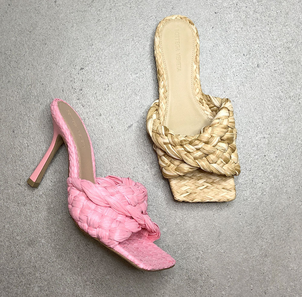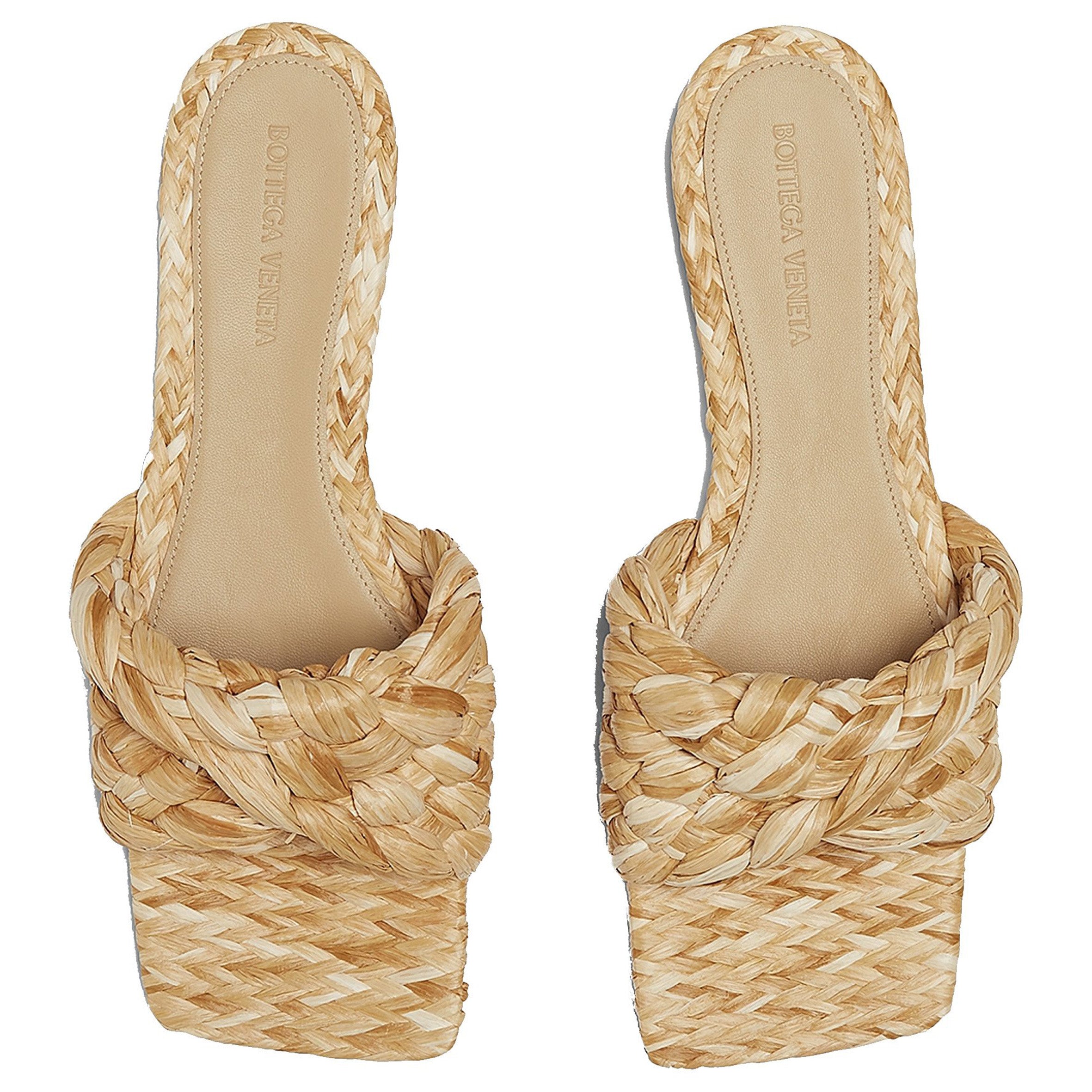Bottega Veneta Flat sandals with twisted Intrecciato raffia strap. Featuring a squared toe, stacked leather heel and rubber-injected leather sole.