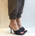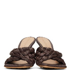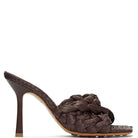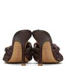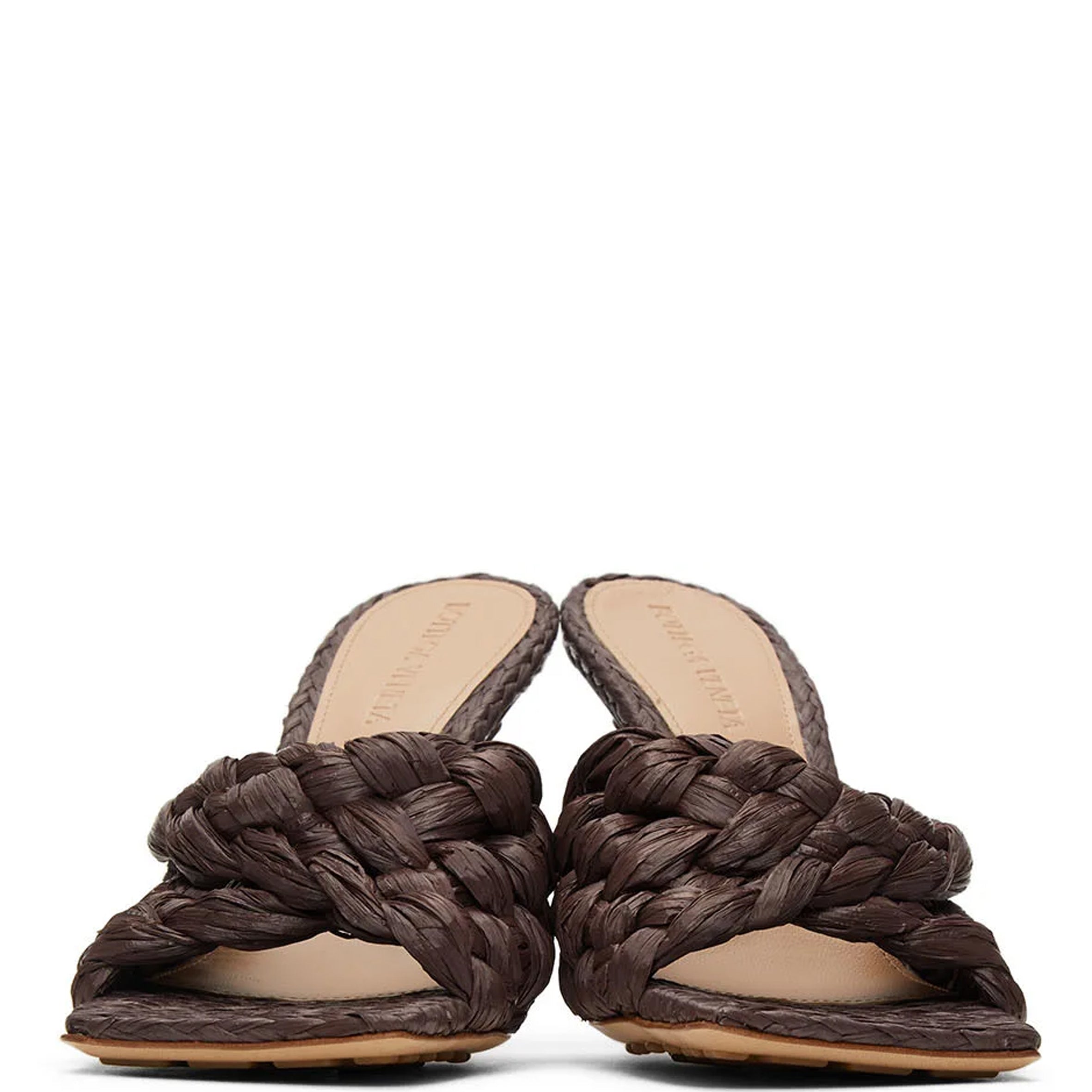 Signature Intrecciato-woven raffia slip-on heeled sandals in Bitter Choc. Open square toe. Logo embossed at beige buffed leather footbed. Covered stiletto heel. Leather sole in tan with pebbled rubber injections.