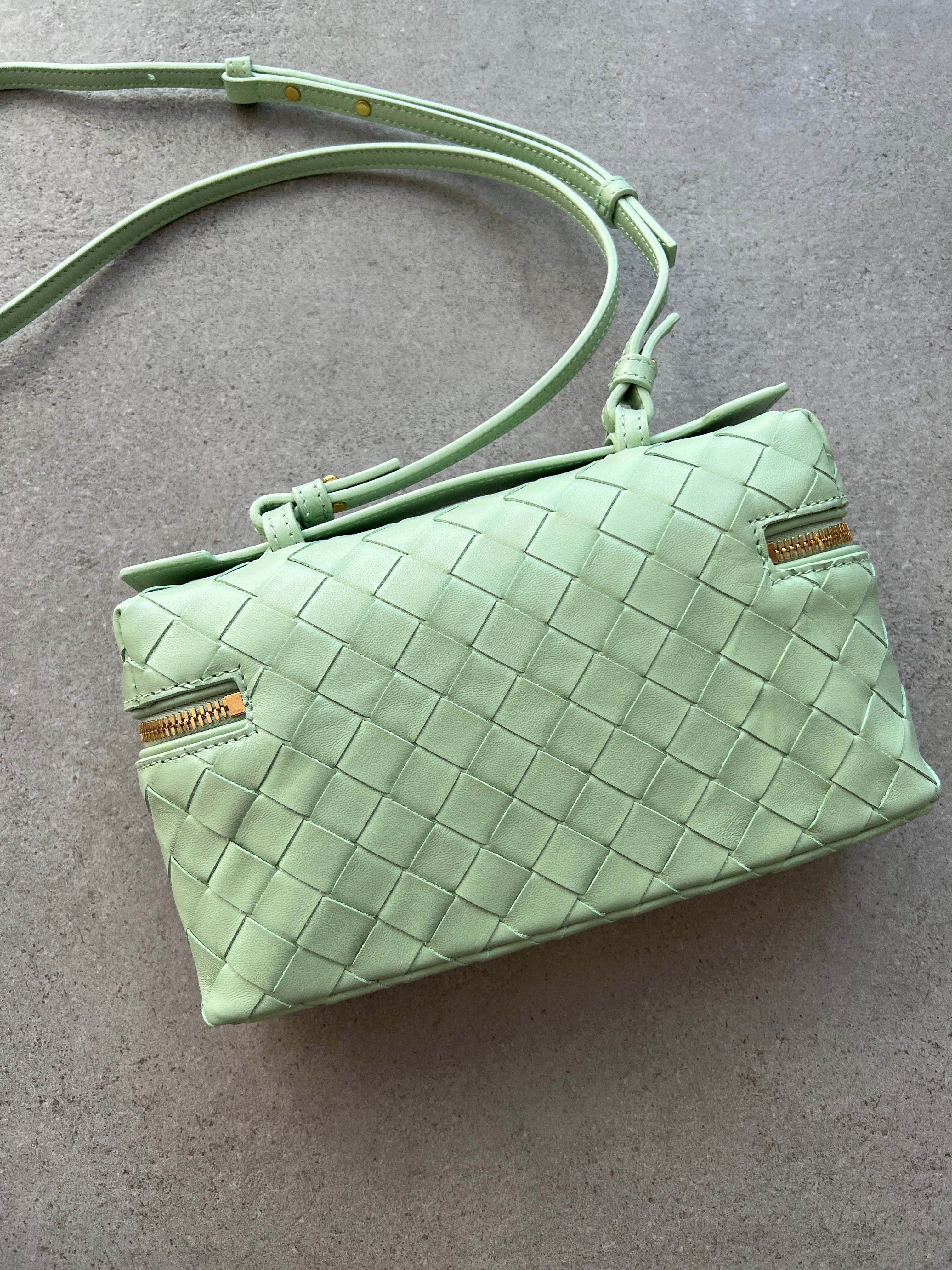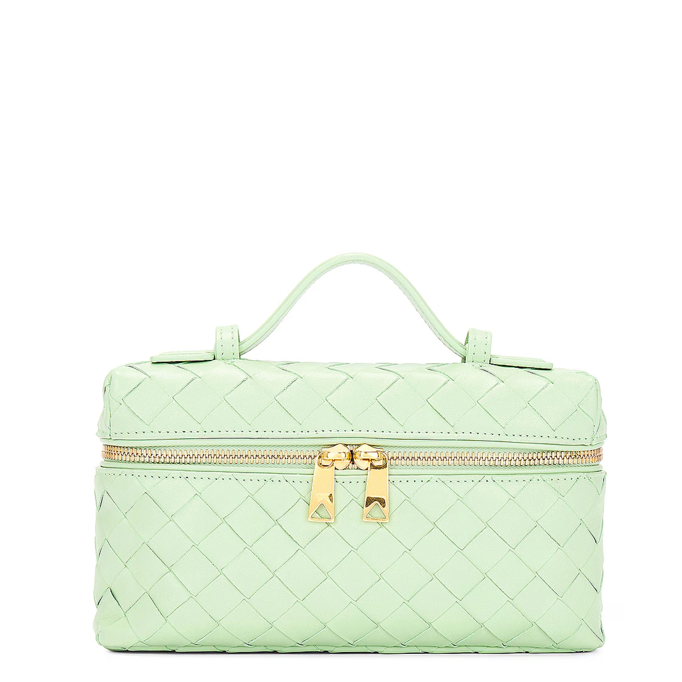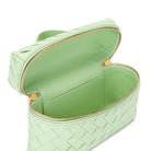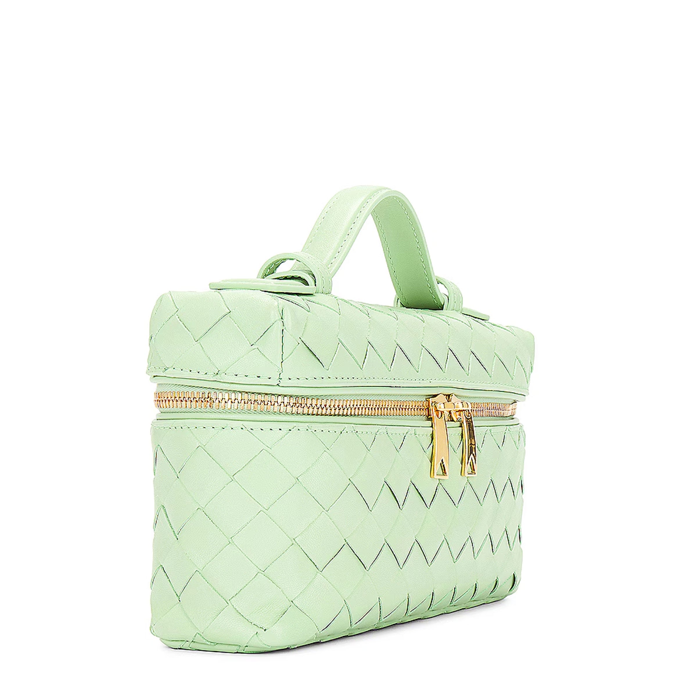 Bottega Veneta vanity case in intrecciato leather with top handle and removable, adjustable crossbody strap. Can be worn as a top handle or shoulder or crossbody bag.