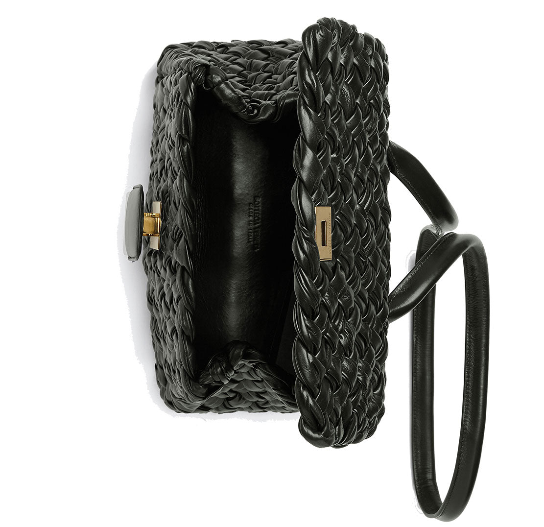 Intrecciato-woven buffed calfskin pouch with an adjustable leather shoulder strap with post-stud fastening. Hinged opening with magnetic fastening. Tonal leather logo flag and zippered pocket at interior and suede lining.
